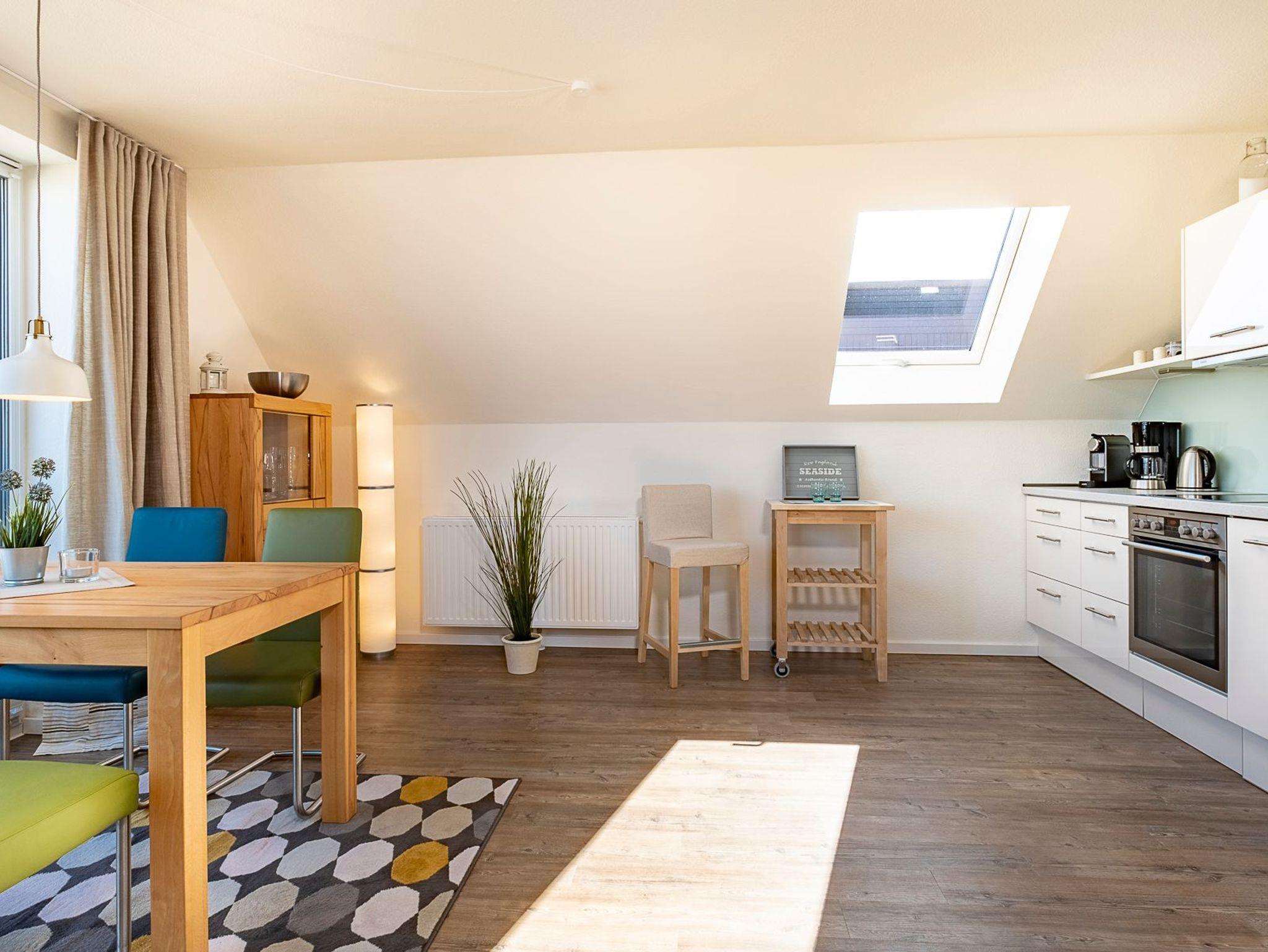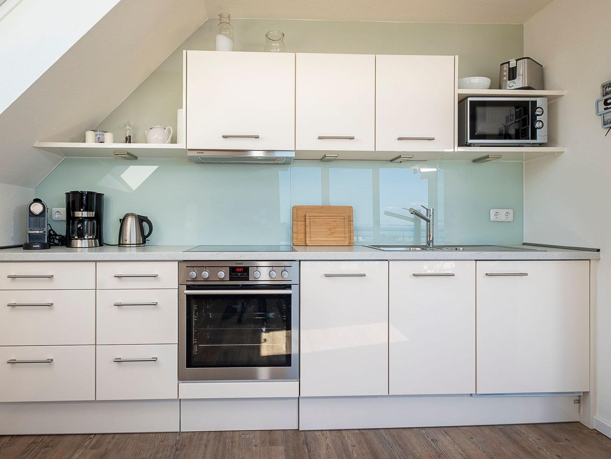 Heller, großer Wohn-Essbereich mit weitem Blick auf die Ostsee. Tiefer sowie breiter Balkon mit Tisch und Stühlen, Ostseeblick pur. Schöner Wohnbereich mit einem Sofa, 2 Sesseln sowie Beistelltischen. Flach-TV, DVD-Player, Bose-Radio, CD-Player, Bücher, Spiele und DVD´s. Der Essbereich bietet Ihnen Platz für 4 Personen. Hier können Sie ausgiebig frühstücken und den Ostseeblick genießen. Die moderne Küche ist komplett ausgestattet und lässt keine Wünsche offen. Neben der Filterkaffeemaschine steht Ihnen hier zusätzlich eine Nespresso-Maschine zur Verfügung. Kleiner Abstellraum. Selbstverständlich steht Ihnen auch in dieser Wohnung kostenloses WLAN zur Verfügung.