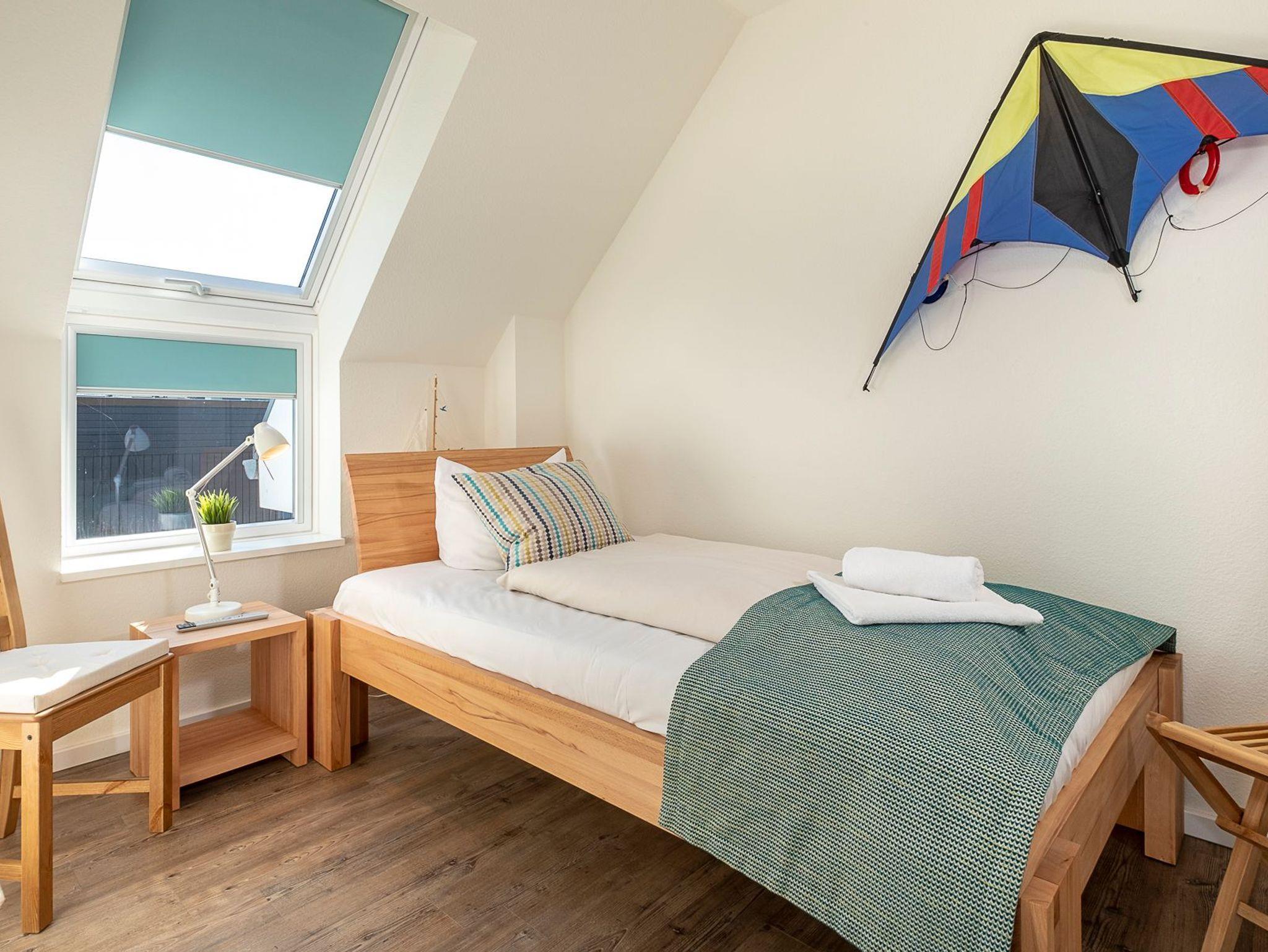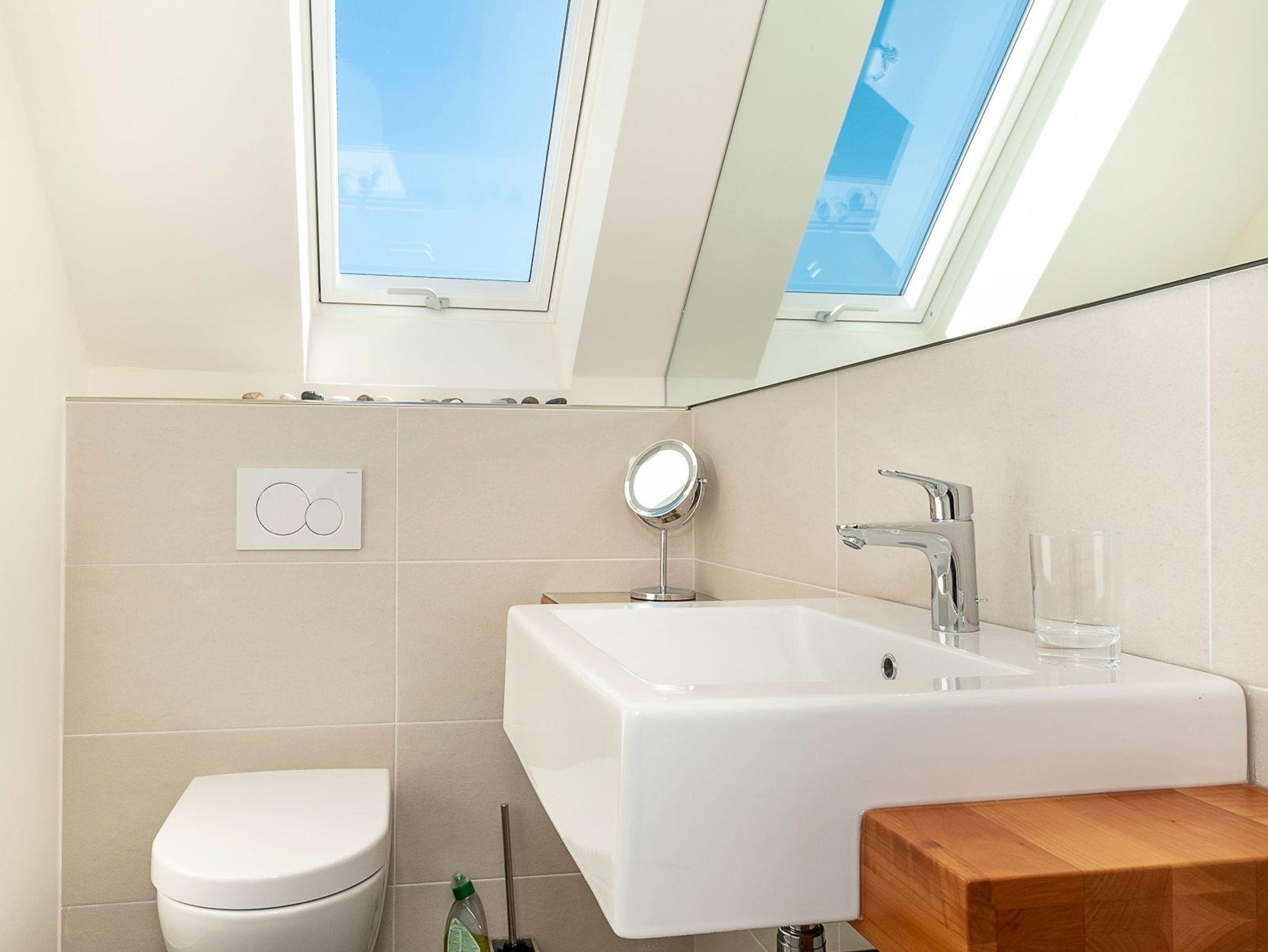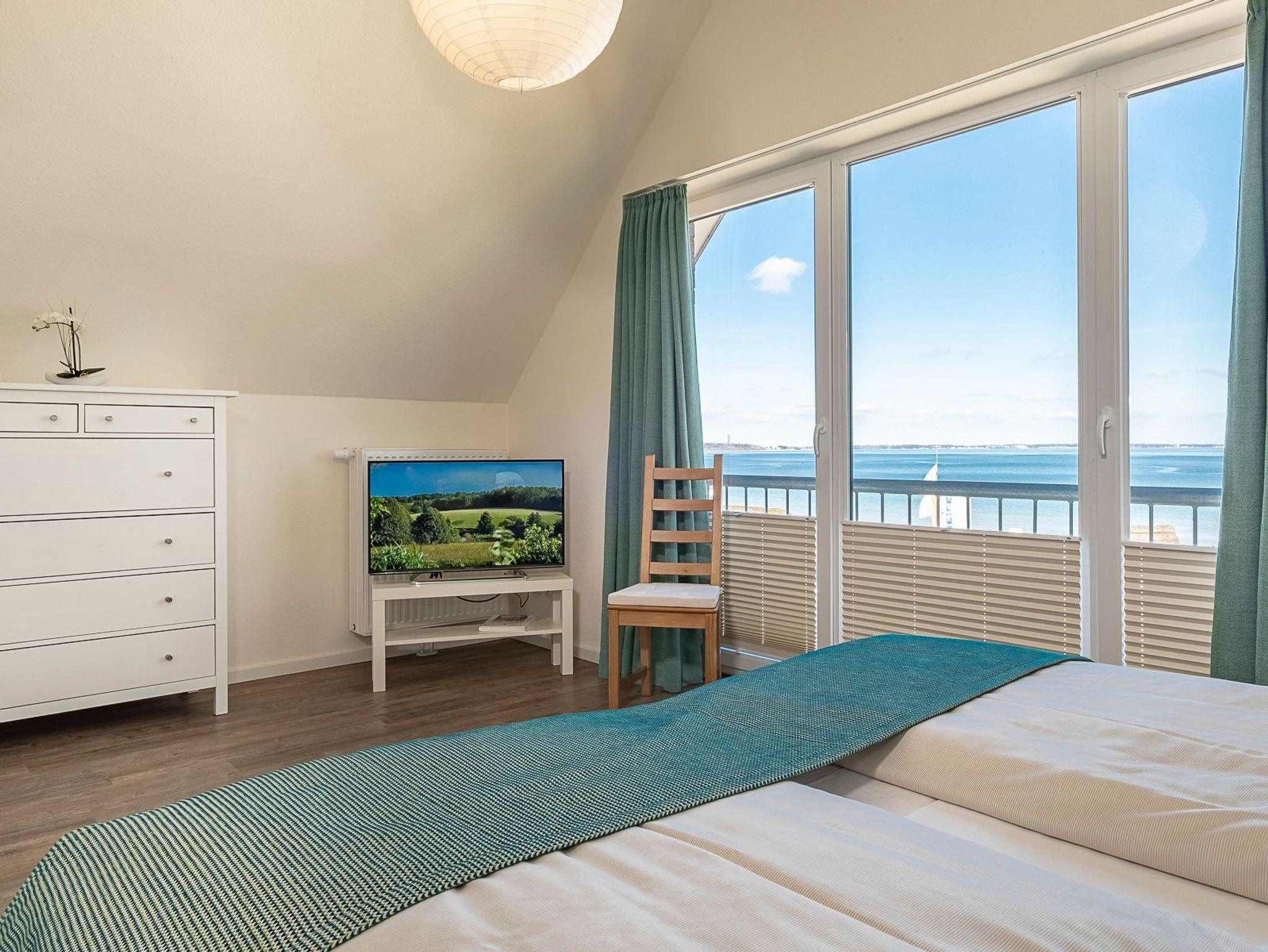Das Tageslichtduschbad verfügt über eine bodentiefe Dusche und einen großen Waschtisch sowie eine Waschmaschine. Neben der Fußbodenheizung ist hier ein Handtuchheizkörper angebracht. Über eine bequeme Treppe erreichen Sie das Obergeschoss. Hier stehen Ihnen zwei Schlafzimmer zur Verfügung. Das eine Schlafzimmer (mit Ostseeblick) hat ein großes Doppelbett (1,80 x 2,00 m, Einzelmatratzen) mit Komforthöhe, eine große Kommode sowie einen Design-Garderobenständer/Kleideraufhängung und einen Flach-TV. Das zweite Schlafzimmer ist mit einem breiten Bett (1,20 x 2,00m) mit Komforthöhe sowie einem Kleiderschrank und Flachbild-TV ausgestattet. Hier befindet sich auch das großzügige Tageslicht-Gäste-WC mit einem Waschtisch.