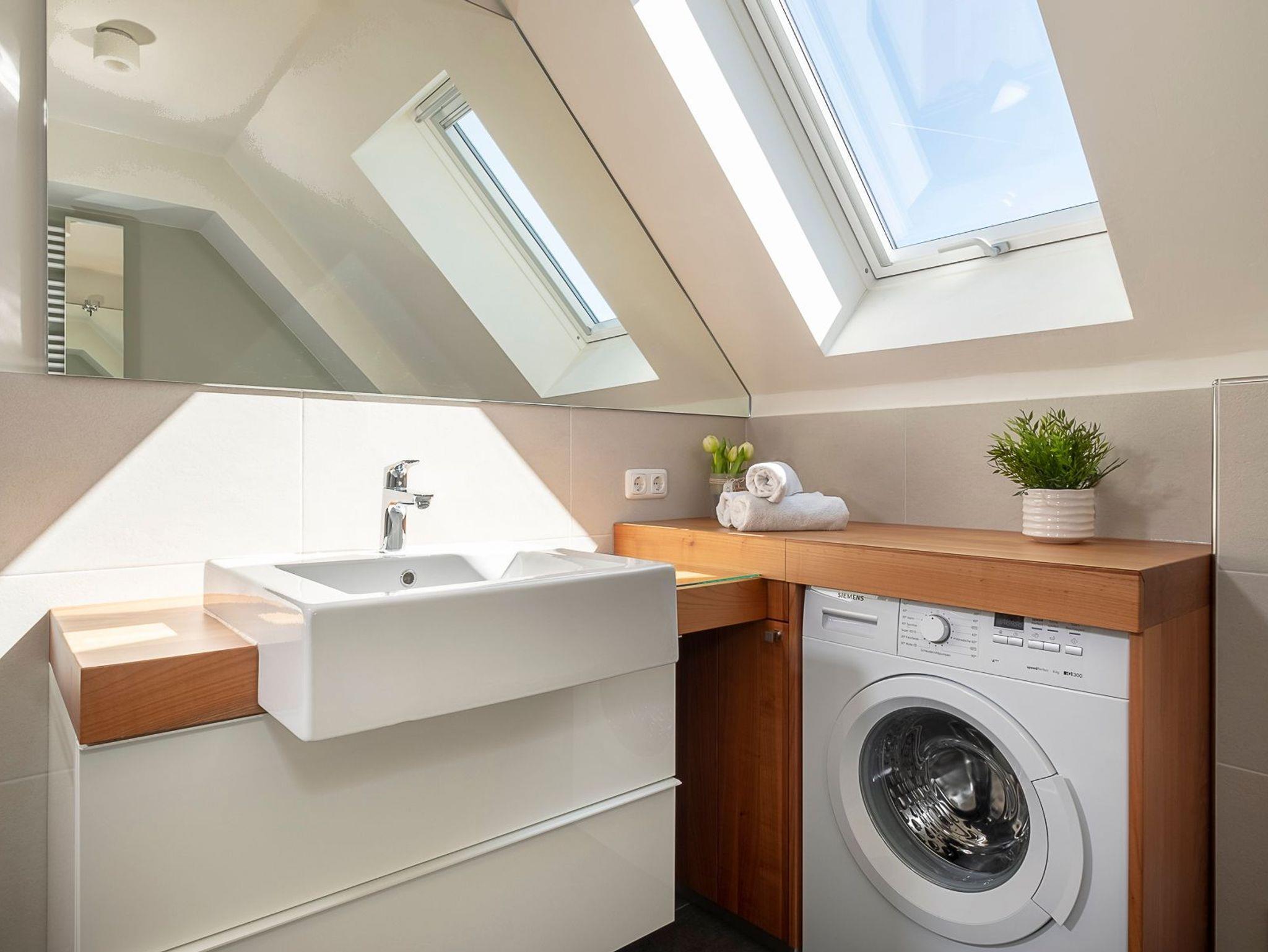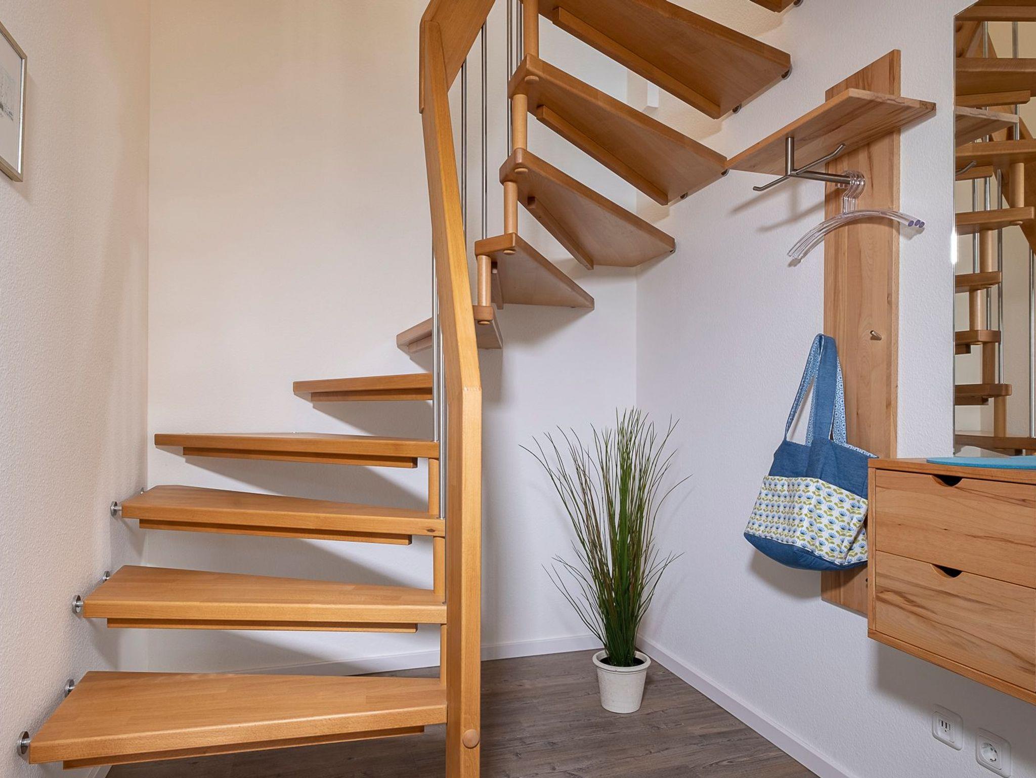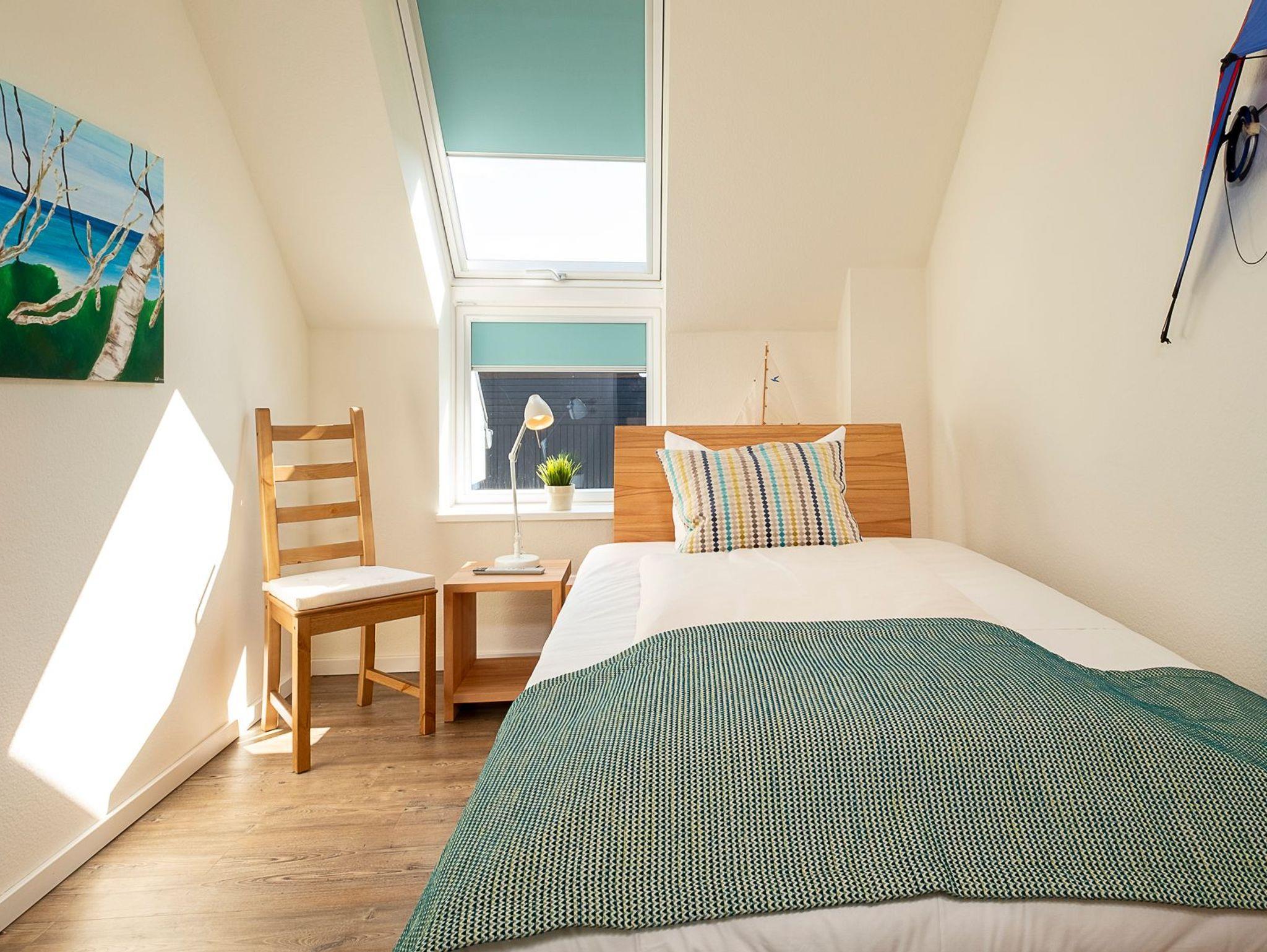 Das Tageslichtduschbad verfügt über eine bodentiefe Dusche und einen großen Waschtisch sowie eine Waschmaschine. Neben der Fußbodenheizung ist hier ein Handtuchheizkörper angebracht. Über eine bequeme Treppe erreichen Sie das Obergeschoss. Hier stehen Ihnen zwei Schlafzimmer zur Verfügung. Das eine Schlafzimmer (mit Ostseeblick) hat ein großes Doppelbett (1,80 x 2,00 m, Einzelmatratzen) mit Komforthöhe, eine große Kommode sowie einen Design-Garderobenständer/Kleideraufhängung und einen Flach-TV. Das zweite Schlafzimmer ist mit einem breiten Bett (1,20 x 2,00m) mit Komforthöhe sowie einem Kleiderschrank und Flachbild-TV ausgestattet. Hier befindet sich auch das großzügige Tageslicht-Gäste-WC mit einem Waschtisch.
