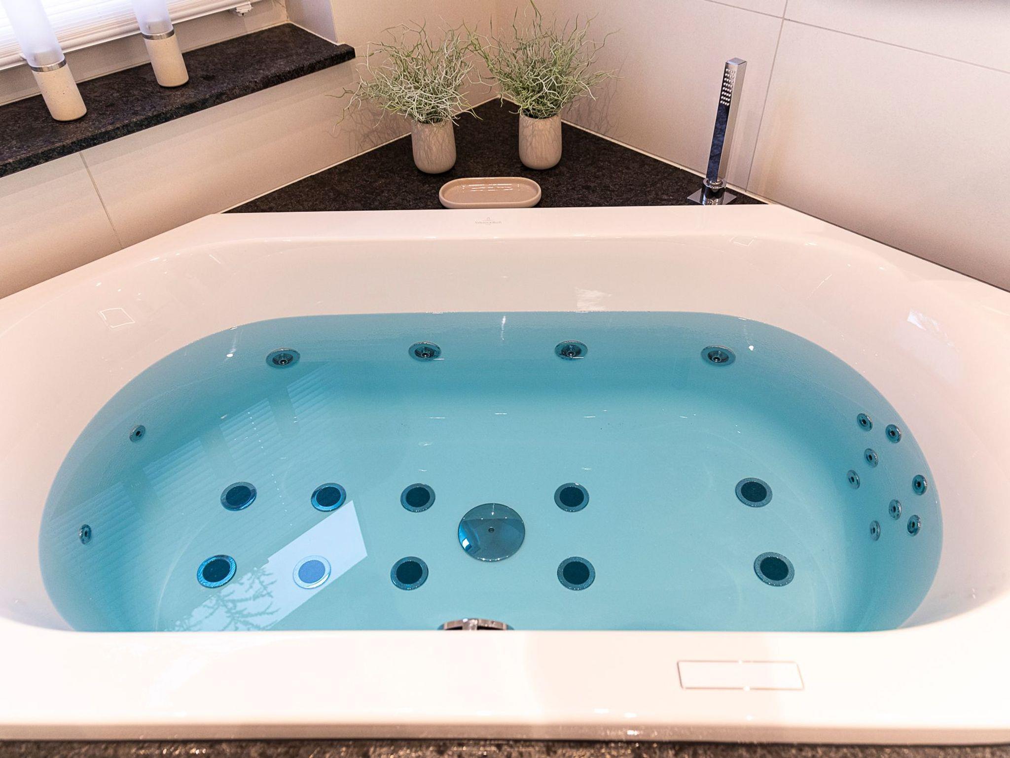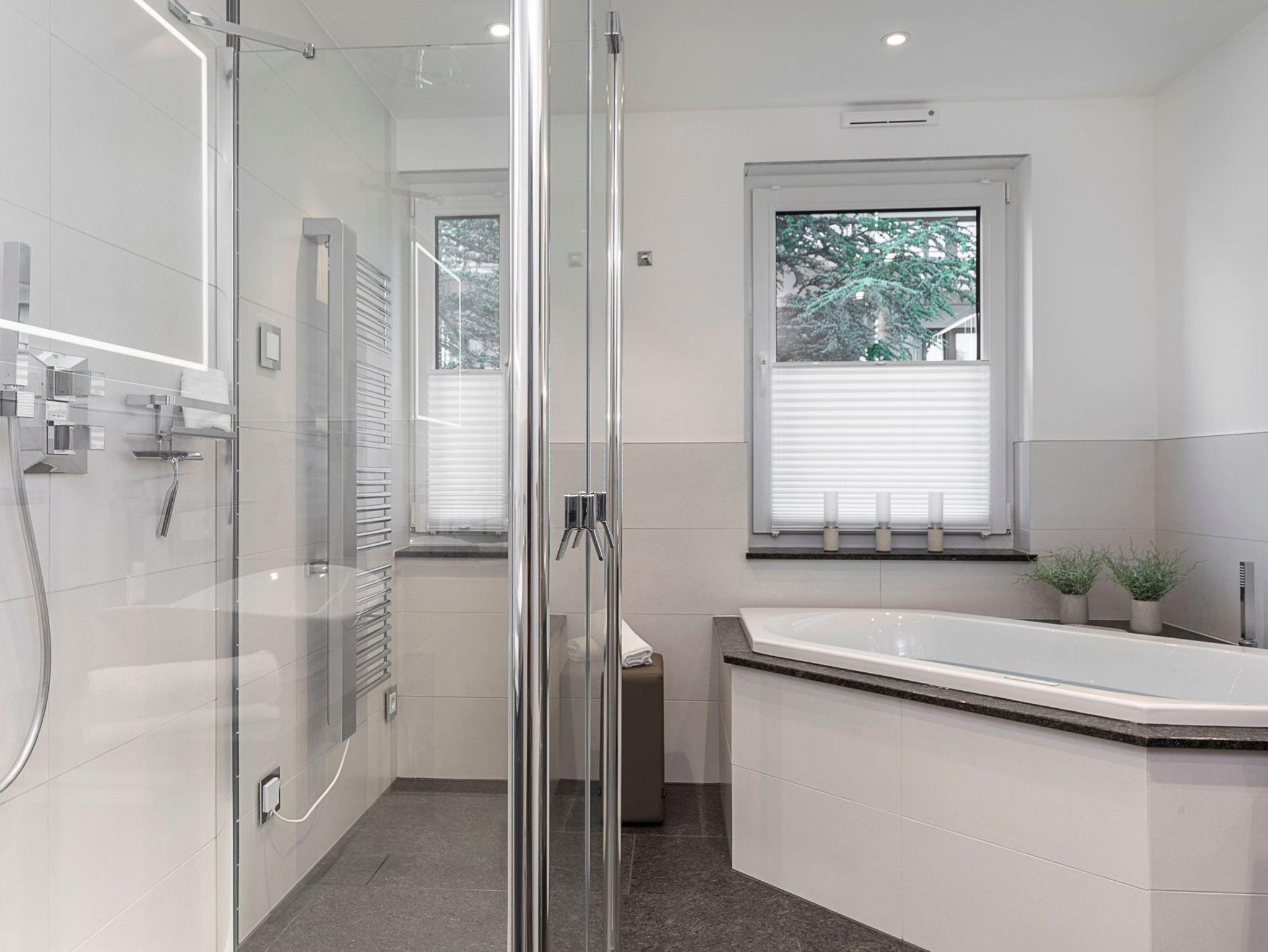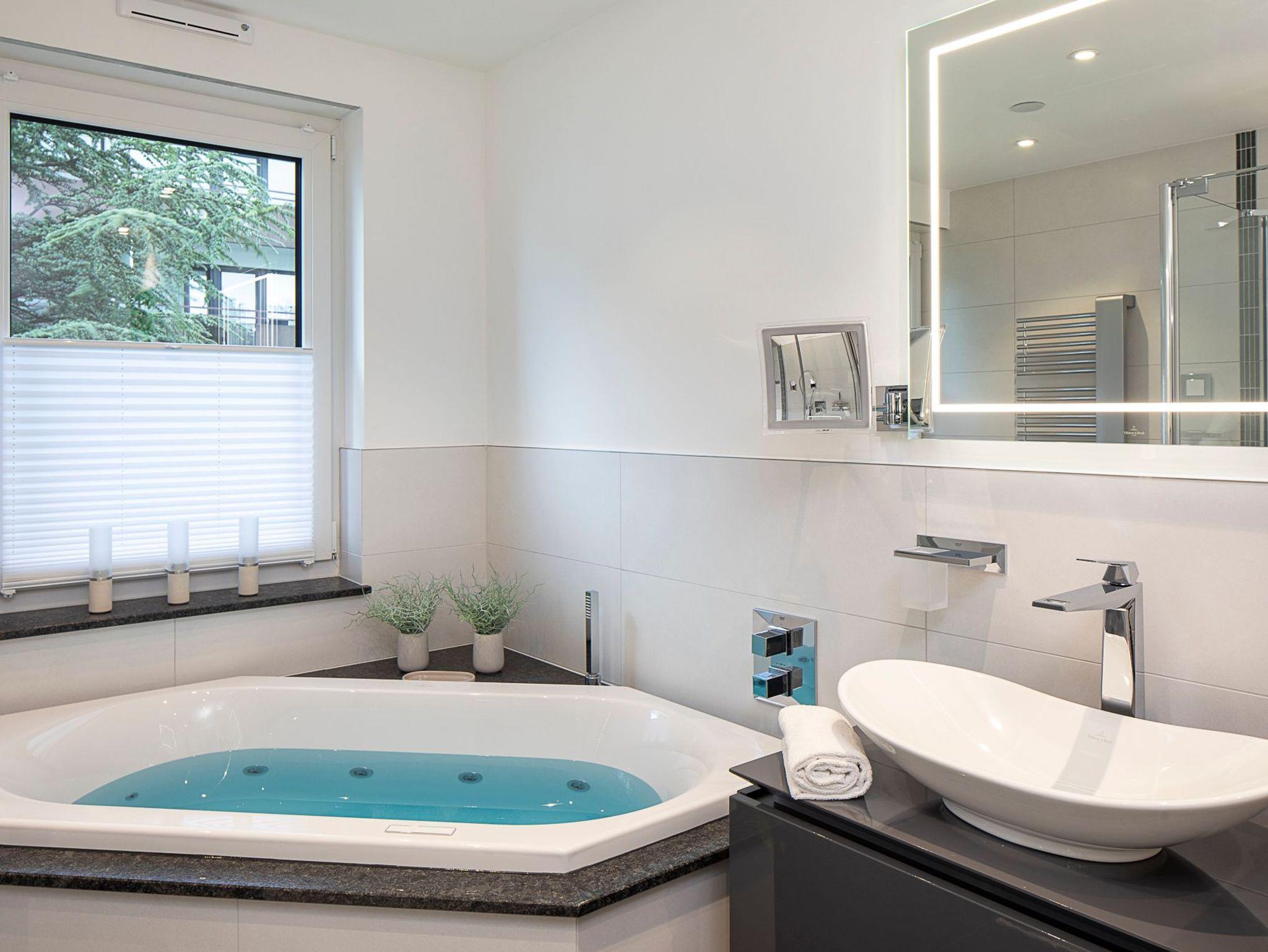 Wellnessbad: In Ihrem mit viel Liebe von Villeroy [&] Boch gestalteten Wohlfühlbad mit Fenstern lädt Sie eine bodengleiche Regendusche und ein Whirlpool zum Entspannen ein. 2 Waschtische, WLAN-Radio, Handtuchheizkörper, Kosmetikspiegel und Haartrockner runden das Wohlfühlpaket ab.