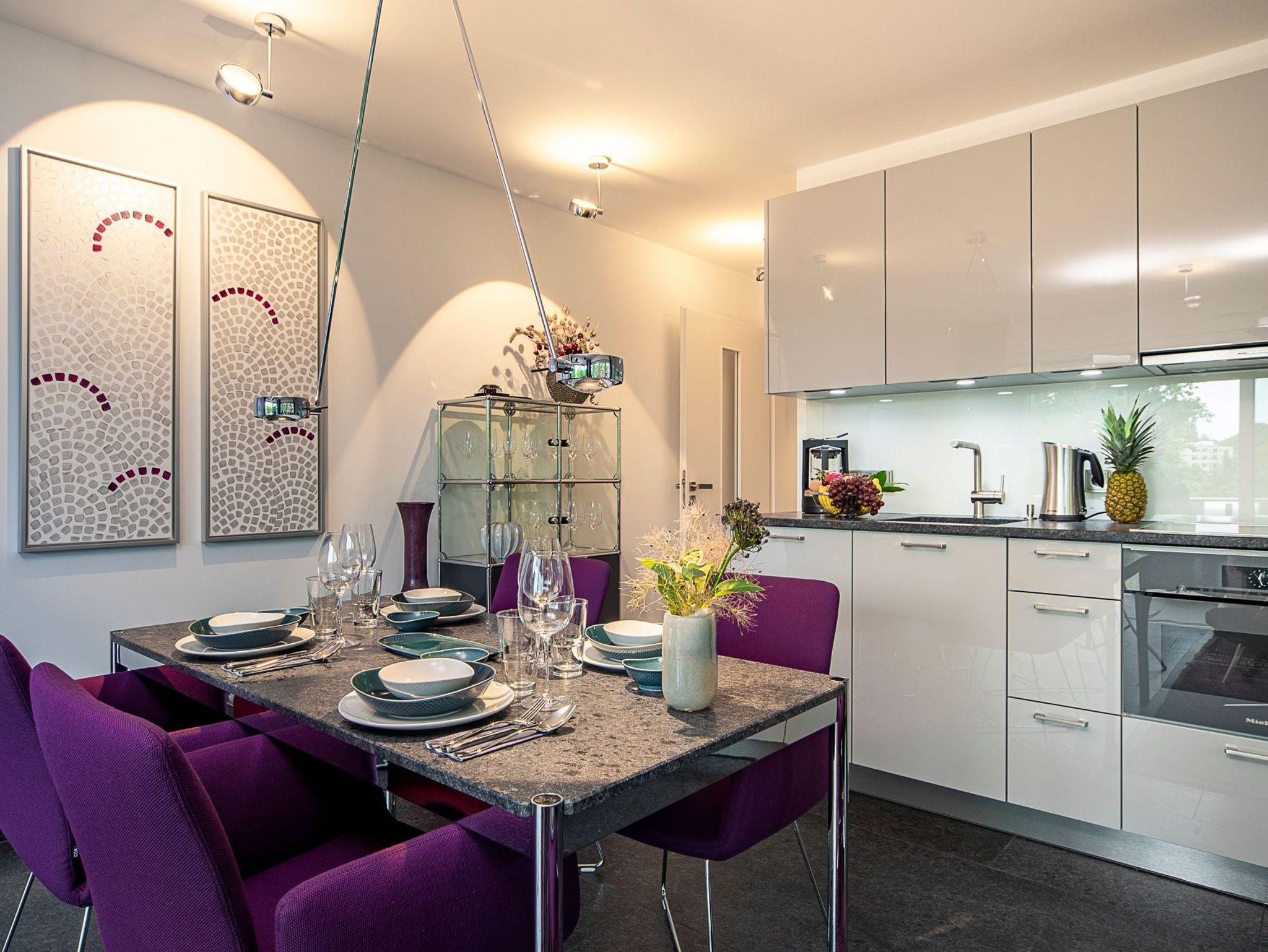 Freuen Sie sich auf eine exklusive Design-Ferienwohnung mit einer besonderen Wohlfühlatmosphäre. Das abgestimmte Wohnraumkonzept von COR, USM, VITRA und JAB wird mit einem Wellnessbereich von Villeroy [&] Boch abgerundet. Das warme Lichtkonzept des Hauses Prediger setzt die originalen Acrylgemälde und weitere geschmackvolle, naturbelassene Dekorationen ins richtige Licht und schafft eine stimmungsvolle Atmosphäre. Wohn-Ess-Bereich: Genießen Sie Ihr Frühstück oder andere kulinarische Höhepunkte in der hochwertigen Warendorf-Küche mit Miele-Einbaugeräten, einer Nespresso-Maschine sowie stylischem Rosenthal-Porzellan. Es erwarten Sie Design-Klassiker von USM Haller (Esstisch, Vitrine und TV-Board) und COR (Ledersofa, Lounge-Chair, Esstisch-Stühle mit bequemer Polsterung und Couchtisch). Ein Samsung 65?-Smart-TV inkl. Soundbar mit LAN und kostenloses, unbegrenztes Highspeed-WLAN stehen Ihnen für Entertainment und digitales Erleben zur Verfügung.