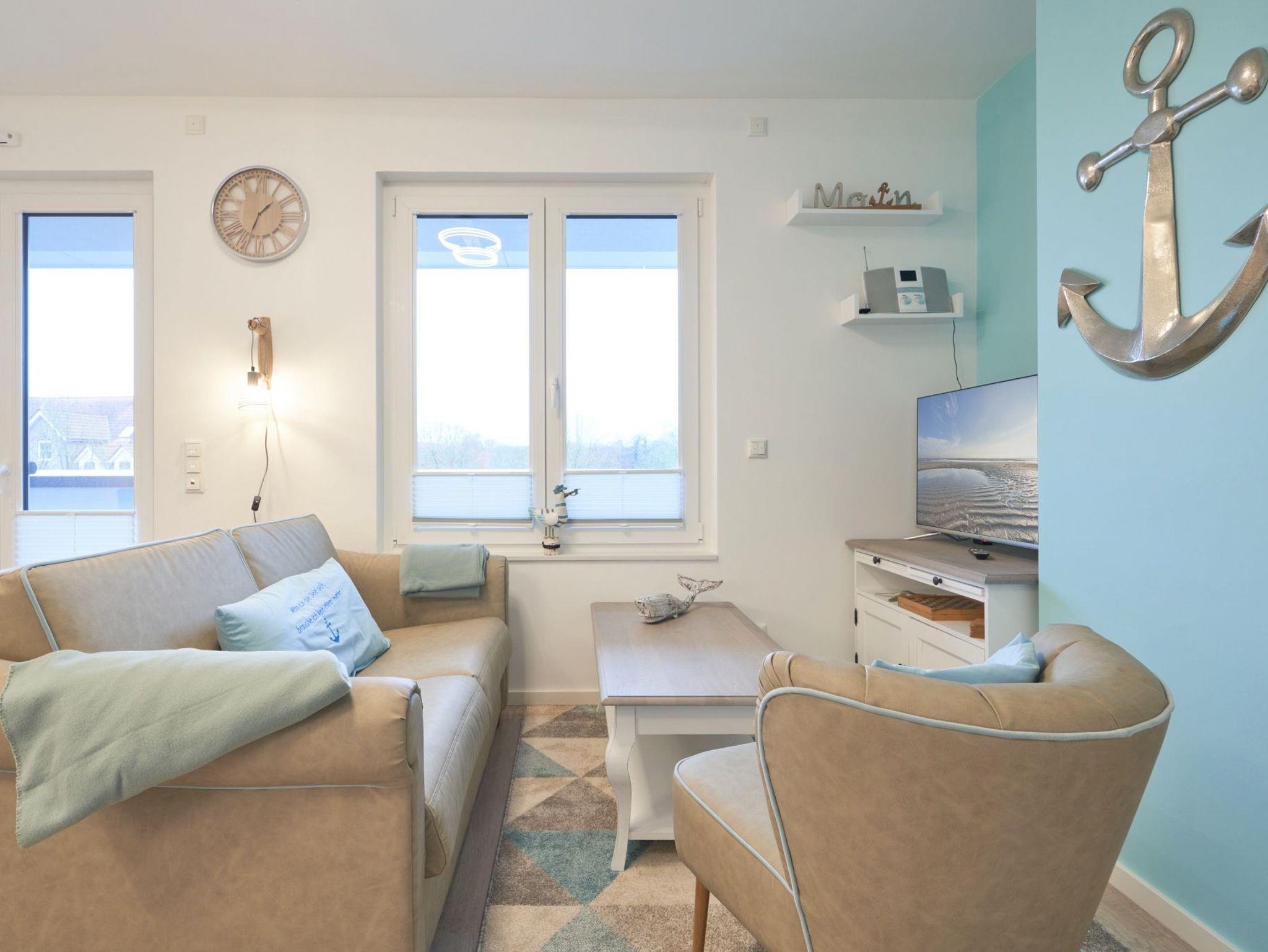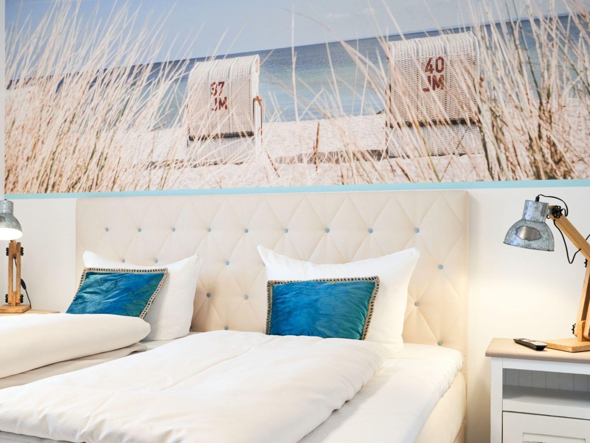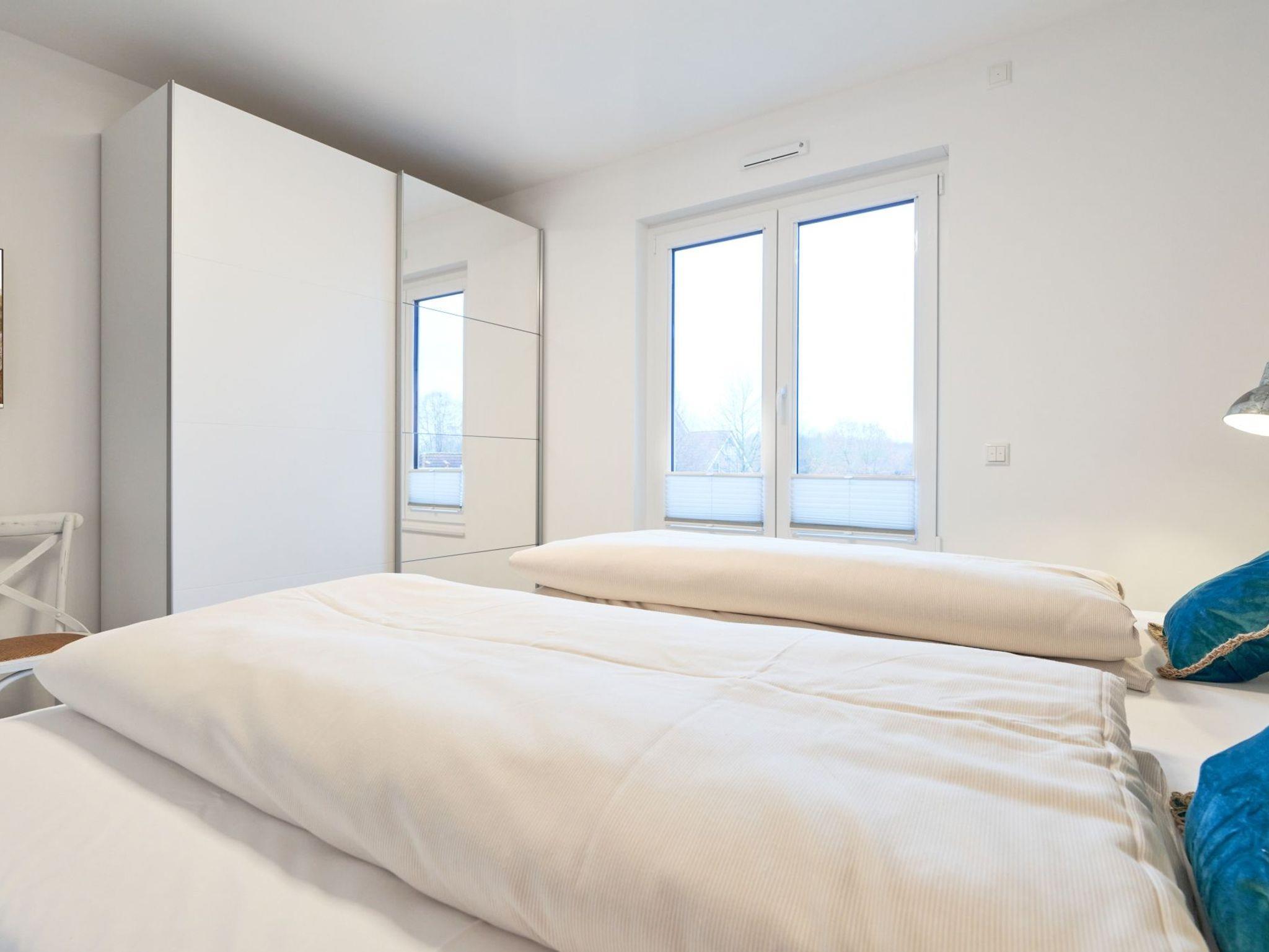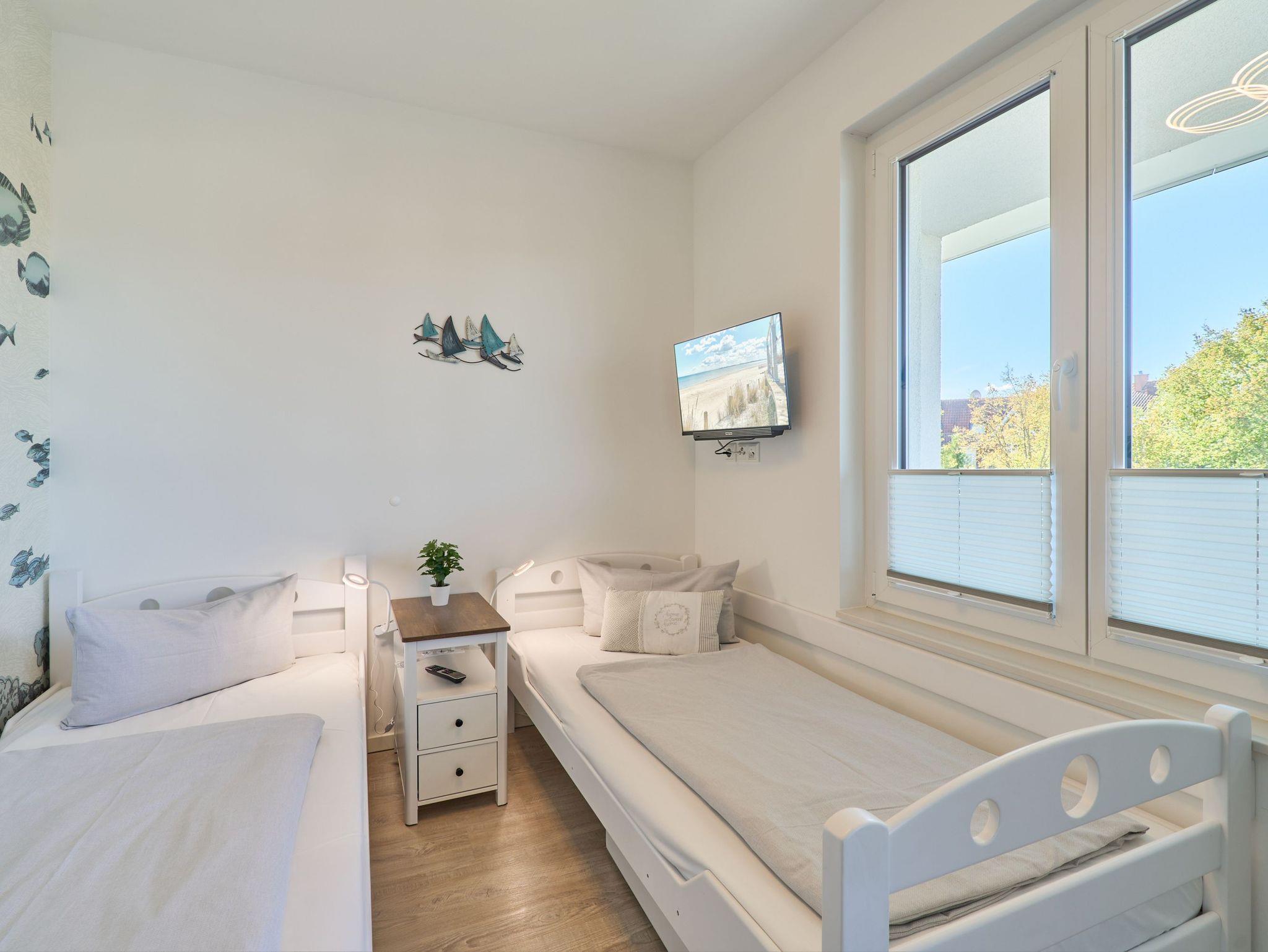 Die Küchenzeile hat einen Backofen, ein Ceran-Kochfeld, einen Geschirrspüler, einen Kühlschrank mit Gefrierschrank, eine Filterkaffeemaschine, eine Senseo-Kapselmaschine, einen Toaster und einen Wasserkocher. [nbsp] Der Wohnbereich ist mit einem bequemen Sofa, einem Wohnzimmertisch sowie[nbsp] einem TV ausgestattet. Aus dem Wohnbereich gelangen Sie auf die Dachterrasse nach Westen. Hier stehen Ihnen Tisch und Stühle sowie eine Lounge zur Verfügung. Das 1. Schlafzimmer ist mit einem Boxspringbett ( 1,80m x 2,00m), einem Kleiderschrank, 2 Nachttischen sowie einem Wand-TV eingerichtet. Im 2. Schlafzimmer stehen Ihnen zwei Einzelbetten, ein Wand-TV sowie ein Kleiderschrank zur Verfügung. Alle Fenster haben elektrische Außenrollläden. Das Duschbad in heller Optik mit bodengleicher Dusche / Regendusche mit separater Handbrause, Handtuchheizkörper, Fön, Kosmetikspiegel. Die gesamte Wohnung ist mit einer Fußbodenheizung ausgestattet.