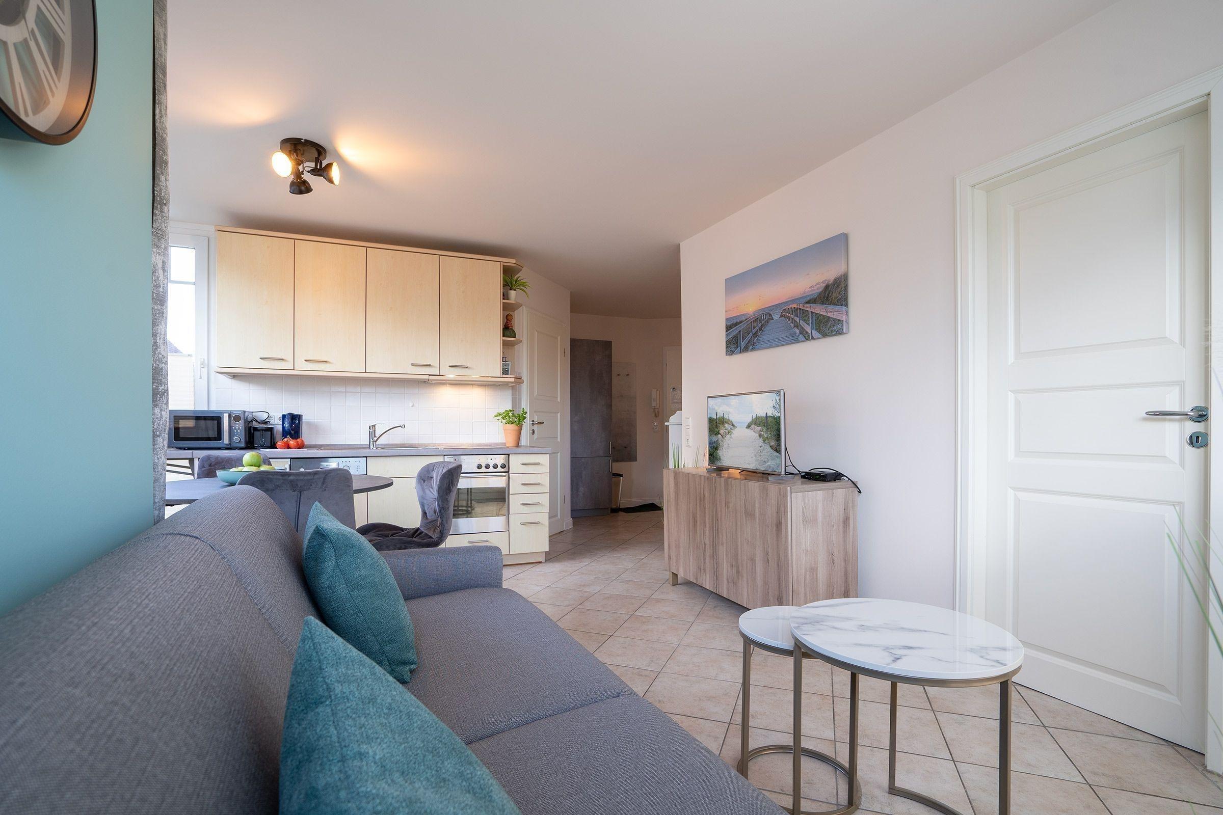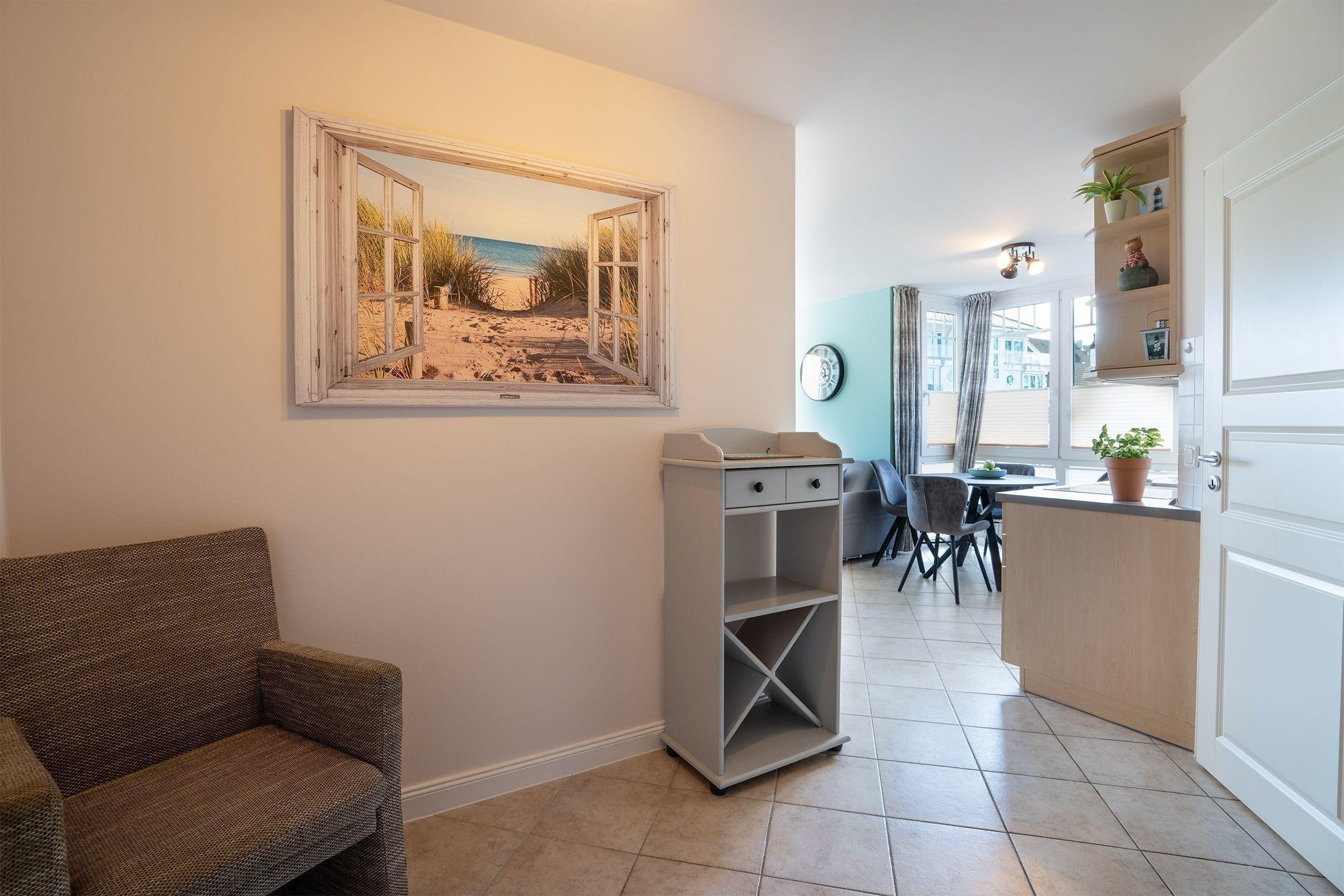 Das ca. 45 m² große 2-Zimmer-Appartement befindet sich im 2. Obergeschoss eines Hauses mit Lift und bietet einen Teilseeblick. Es verfügt über einen hellen Wohnraum mit Fliesenboden, der mit einem umwandelbaren Polstersofa, einem Sessel, einem Couchtisch sowie einem Smart-TV, DVD-Player und einer Playstation 2 ausgestattet ist. Die integrierte Einbauküche ist mit einer Spülmaschine und Mikrowelle versehen. Der Essplatz ergänzt den Wohnbereich. Ein separater Schlafraum mit zwei Einzelbetten, Nachttisch, Kleiderschrank und Fenster ist ebenfalls vorhanden. Der Flur bietet eine Garderobe, während ein modernes Duschbad mit Fenster die sanitären Einrichtungen ergänzt. Waschmaschine und Trockner sind gegen Gebühr nutzbar, und kostenfreies WLAN steht auf eigene Verantwortung zur Verfügung. Ein PKW-Stellplatz in der Tiefgarage ist inklusive, wobei bestimmte Fahrzeugbeschränkungen zu beachten sind. Haustiere sind gegen Aufpreis erlaubt.