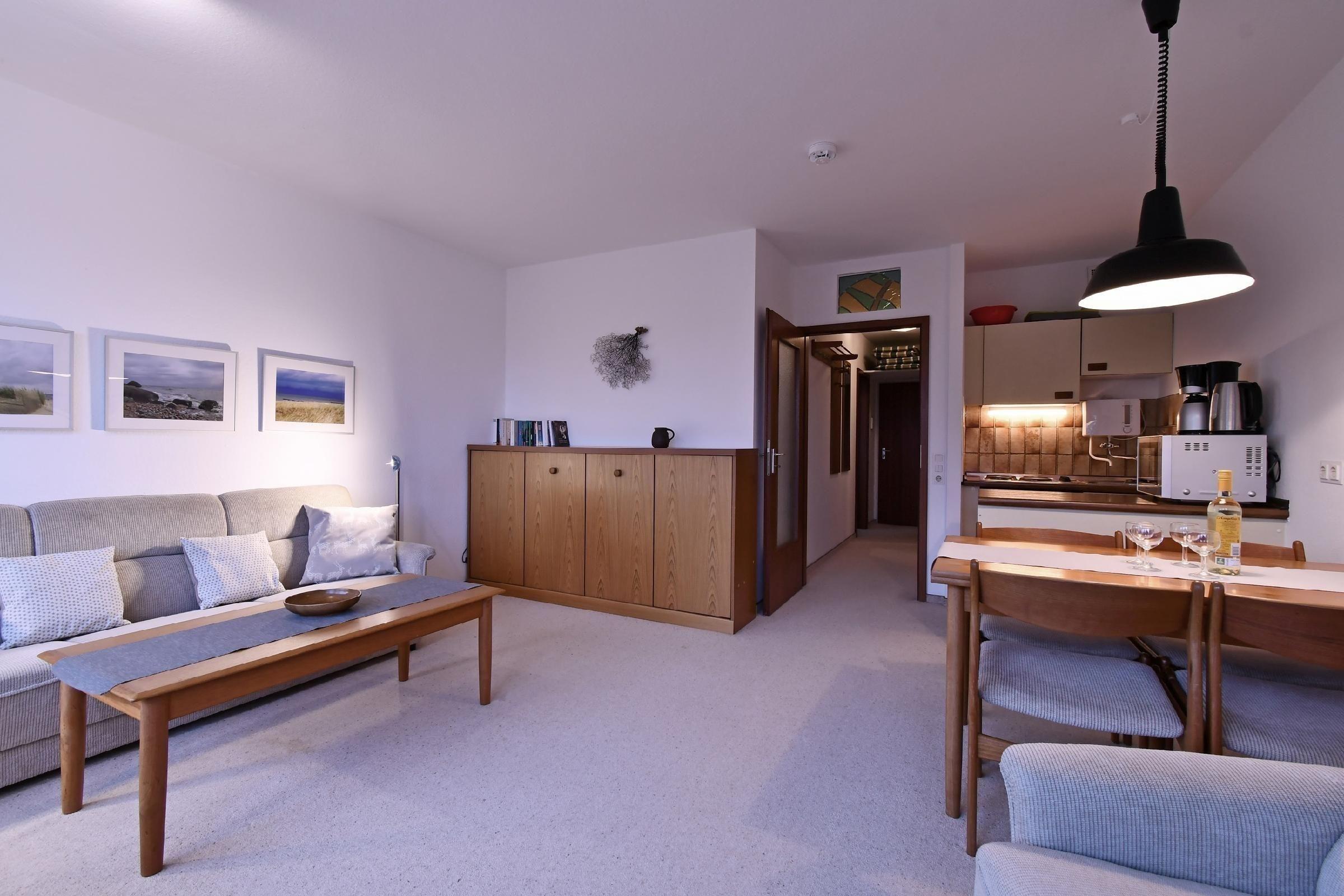 Der kombinierte Wohn-Schlafraum ist mit einer hellen Polstergarnitur nebst zwei Sesseln, Couchtisch, Schrankbett für eine Person und Flachbild-TV ausgestattet.
