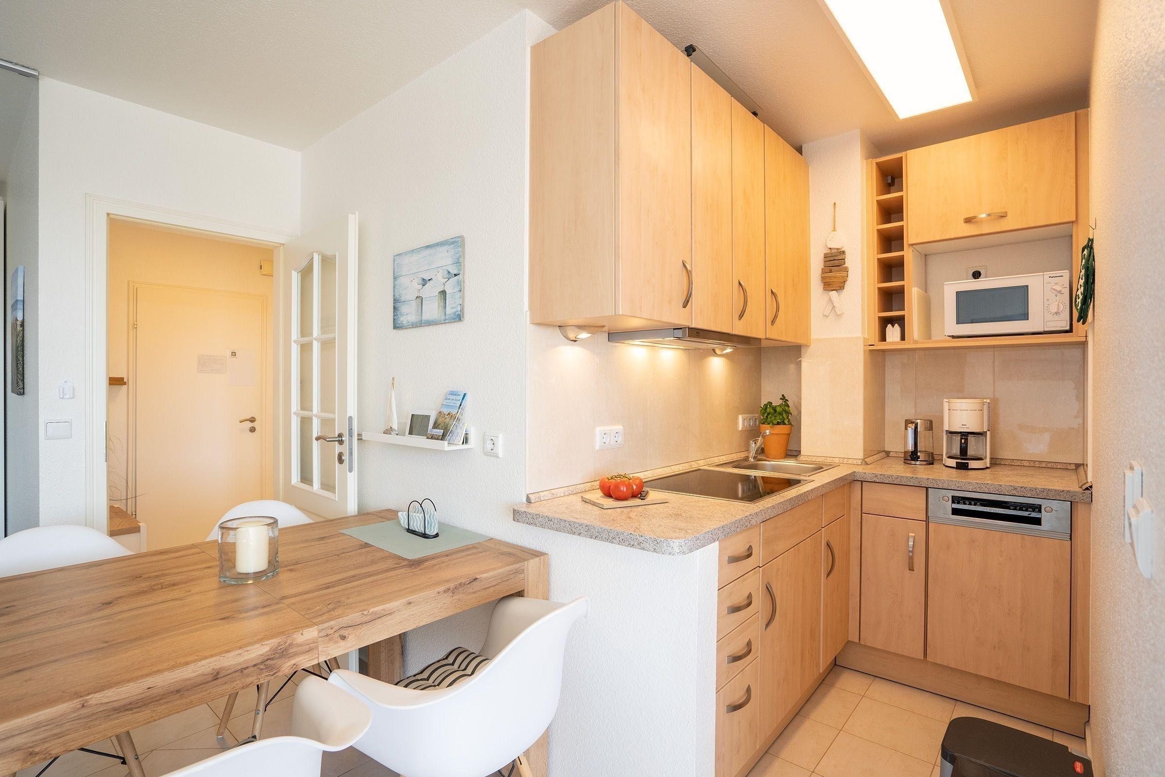 Das 2-Zimmer-Komfort-Appartement im 3. OG (mit Lift) bietet auf ca. 45 m² großzügigen Wohnraum. Es ist geschmackvoll renoviert und verfügt über einen hellen Wohnbereich mit Fliesenboden, einem einladenden Sofa sowie zwei Smart TVs und W-LAN. Die moderne Einbauküche ist vollständig ausgestattet, inklusive Geschirrspüler und Mikrowelle. Ein Boxspringbett (2x80x200 cm) im Wohnbereich sowie ein separates Schlafzimmer mit Doppelbett und Kleiderschrank bieten komfortable Schlafmöglichkeiten. Das Duschbad/WC ist mit einer ebenerdigen Duschkabine und einer Waschtischablage aus Granit ausgestattet. Garderobenschränke sorgen für ausreichend Stauraum. Waschmaschine und Trockner sind im Haus gegen Gebühr nutzbar. PKW-Stellplatz ist inklusive. In der Zeit vom 01.05. bis 10.09. steht ein kostenloser Strandkorb zur Verfügung. Die Nutzung des Außenschwimmbades ist saisonal vom 01.06. bis 15.09. möglich.