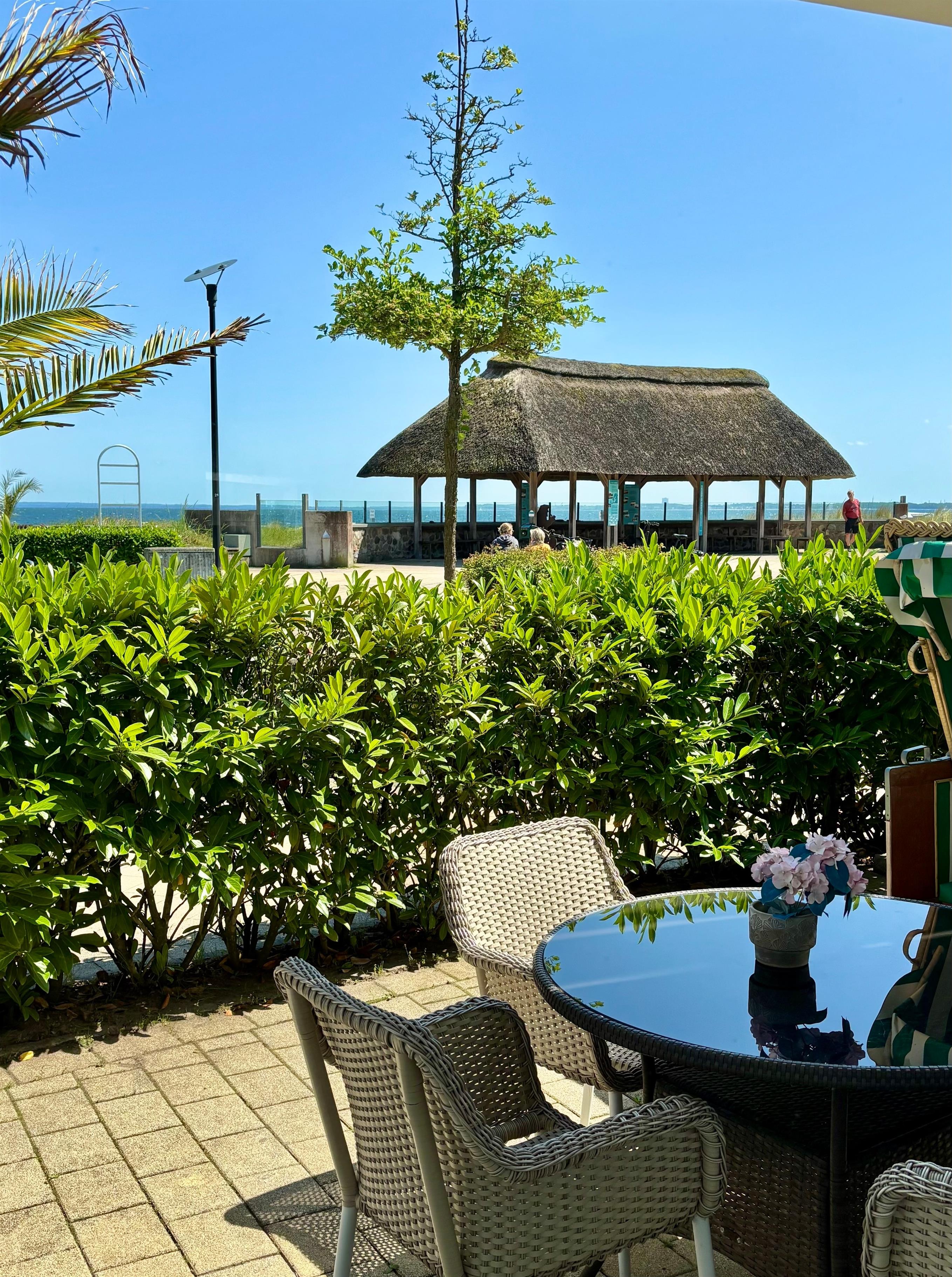 Vor der Ferienwohnung in Richtung Strandallee/Promenade befindet sich eine Terrasse mit Sitzmöbeln und einem Strandkorb.