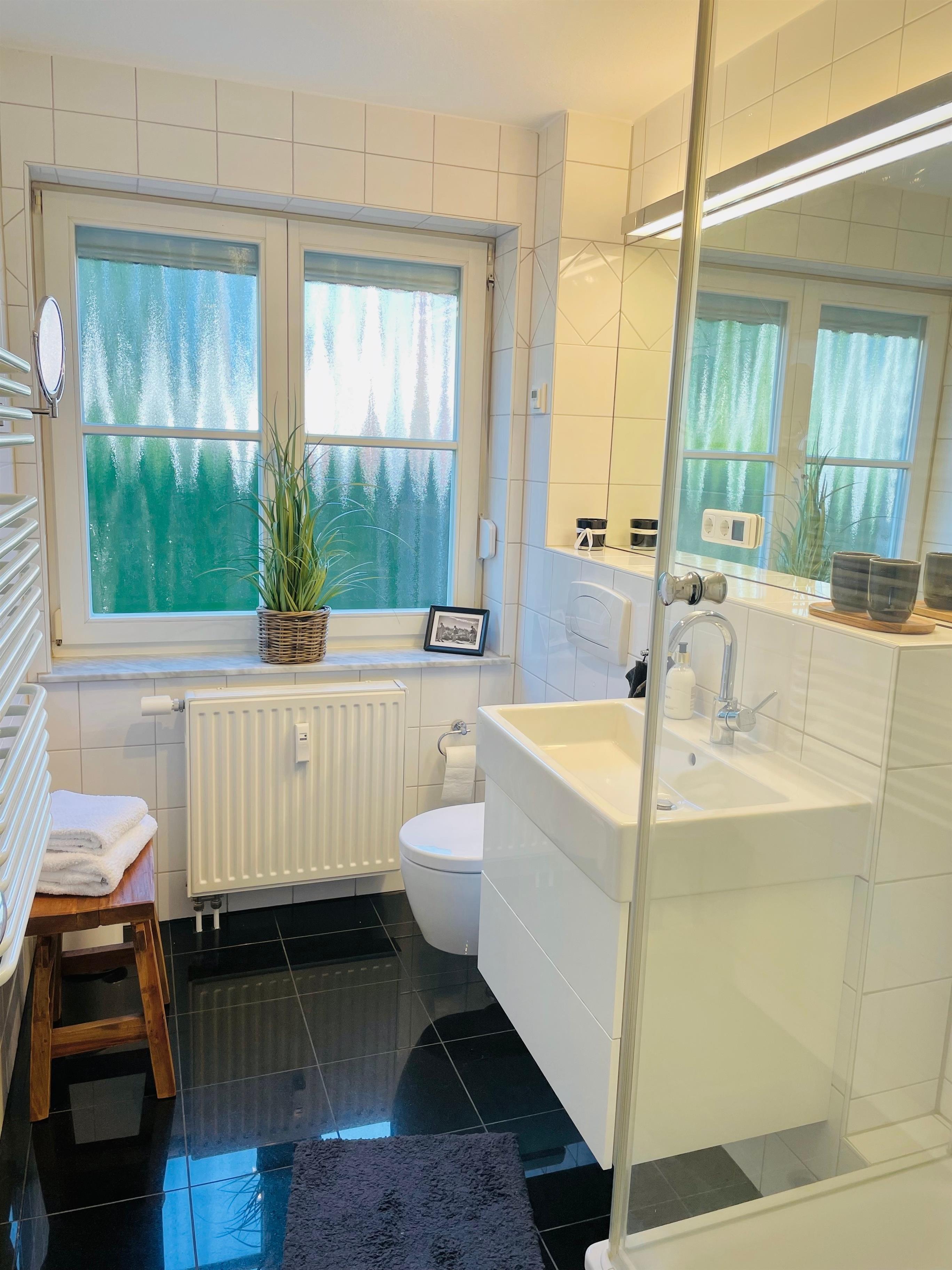 Das Duschbad mit WC befindet sich gleich neben dem Schlafzimmer und ist mit einem Fön und einer Handtuchheizung ausgestattet.