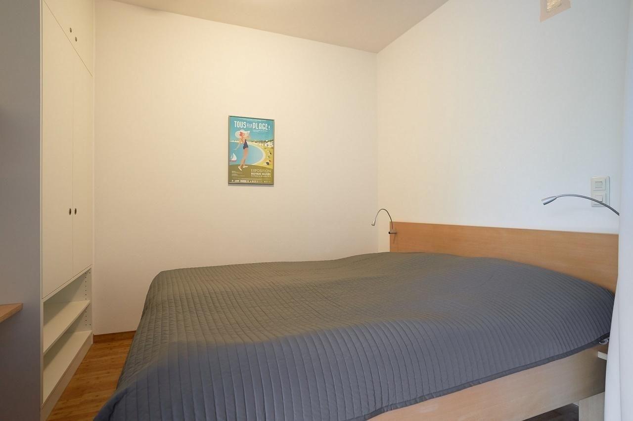 Wohn-/Schlafzimmer: Doppelbett (2x 80x200cm), abgetrennt durch Vorhang, Kleiderschrank