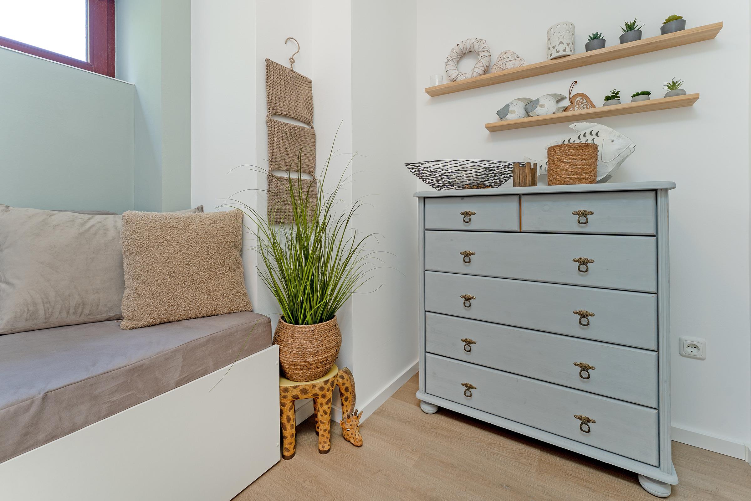 Im Wohnbereich erwarten Sie ein Schlafsofa (130x200 cm), Flat-TV und ein angrenzender Sonnenbalkon für lange lauwarme Abende unter sternenklarem Himmel und frischer leicht salziger Brise. Die separate Wohnküche lädt mit einem schönen Essplatz sowie einer Spülmaschine, Backofen etc. zu genussreichen und geselligen Abenden ein. Im hell gefliesten Badezimmer mit Dusche können Sie sich für den neuen Urlaubstag bereit machen. Gegenüber der Eingangstür befindet sich ein weiteres, kleines Zimmer mit einer Schlafmöglichkeit (90x180 cm). Das Schlafzimmer verfügt über ein bequemes Doppelbett (2x 90x200 cm) sowie über einen geräumigen Kleiderschrank. Ein WLAN Anschluss gehört ebenfalls zur Ausstattung.