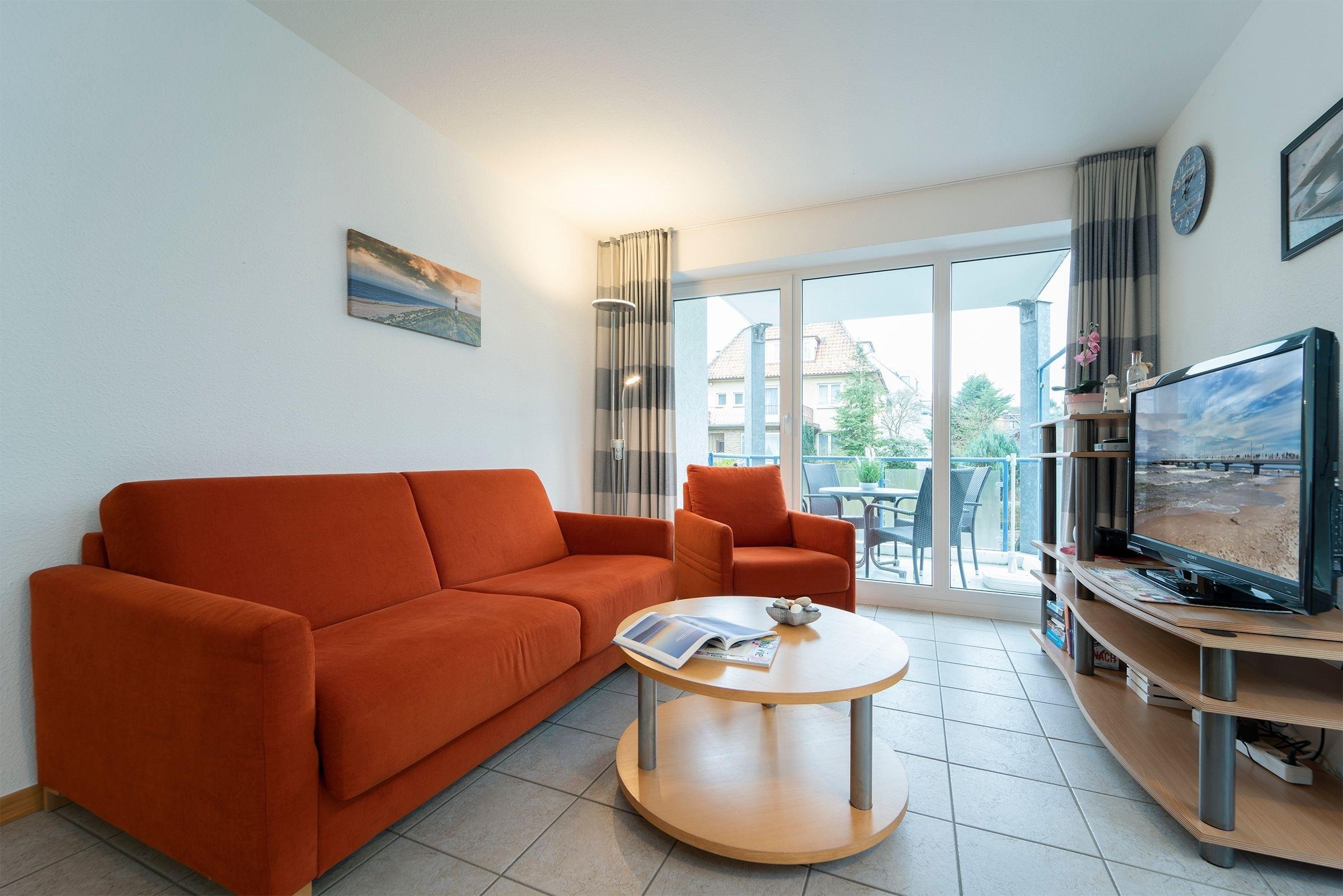 Ein geräumiger Flur führt in das lichtdurchflutete Wohnzimmer mit offener Küche. Von hier aus lockt ein Balkon mit seitlichem Blick auf die Ostsee morgens zum Kaffee an. Gemütlich... die Couch und ein gutes Buch! Besonders nach einem ausgedehnten Strandspaziergang. Die Couch lässt sich zu einer Schlafgelegenheit (140x200 cm) verwandeln. Die offene Küche mit einem Esstisch lädt in netter Runde zu gutem Essen und gemeinsamen Spielabenden ein. Im separaten Schlafzimmer schlafen Sie im bequemen Boxspringbett (160x200 cm). Ein großer Kleiderschrank verstaut Ihre Sachen. Das tageslichthelle Duschbad mit Handtuchwärmer und WC liegt gleich neben dem Flur.