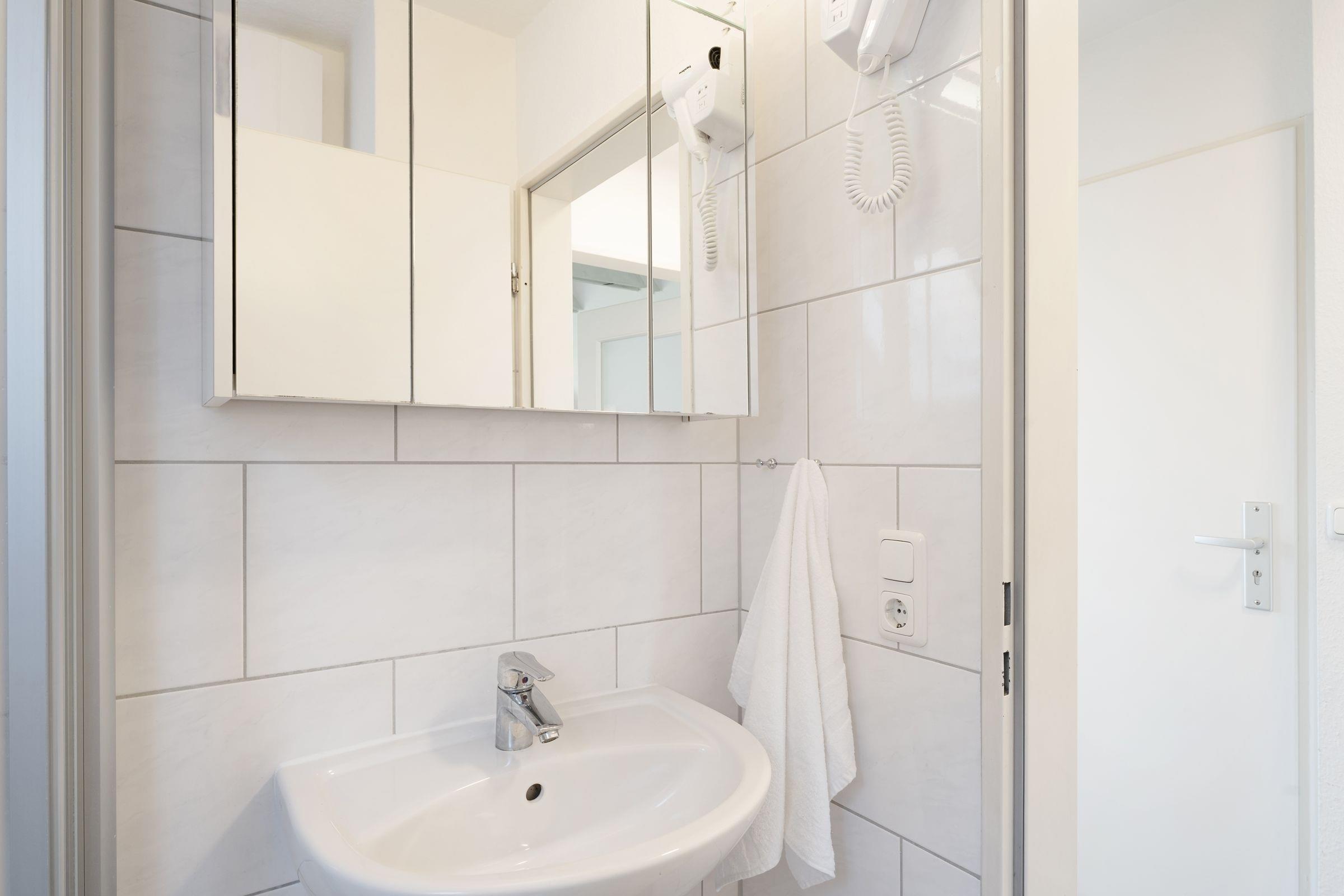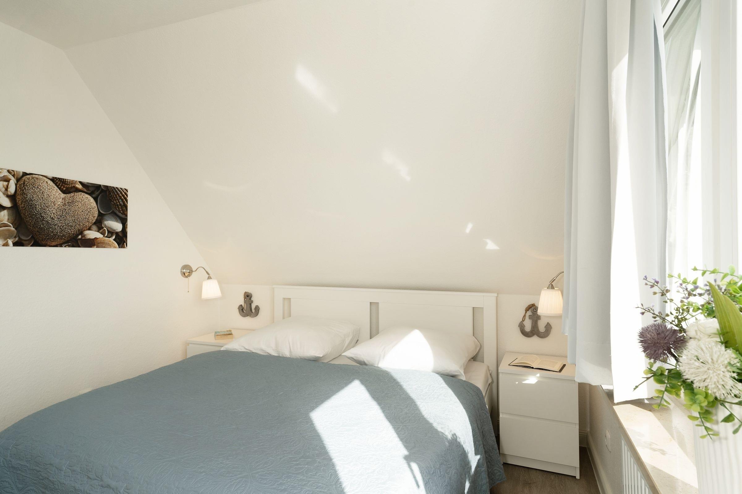 Vom Parkplatz sind es nur noch wenige Schritte und einige Treppenstufen hinauf in Ihre Ferienwohnung (ca. 44 qm) direkt unter dem Dach. Ein kleiner Flur, der alle Zimmer miteinander verbindet, empfängt Sie - treten Sie ein! Ihre Koffer können Sie gleich rechts im Schlafzimmer abstellen. Das Schlafzimmer ist eingerichtet mit einem Doppelbett (2x80x200 cm), Nachttischen und Kleiderschrank – bequem können Sie auch vom Bett aus Ihren Lieblingsfilm im Fernsehen zu Ende sehen. Im Schlafzimmer haben Sie Platz um ein Kindereisebett aufzustellen. Links daneben ist das tageslichthelle Duschbad mit Handtuchwärmer und Föhn.