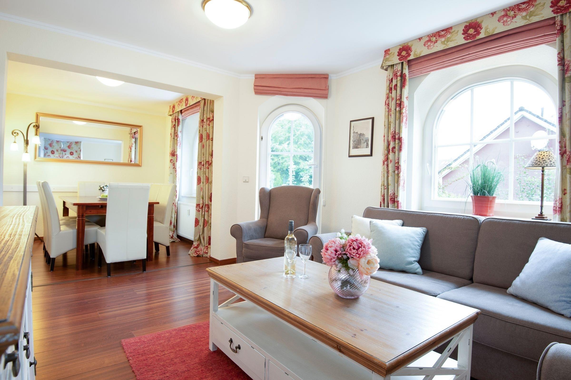 Die Wohnung erstreckt sich über zwei Ebenen auf 91 m², hat 2 Schlafzimmer mit je einem bequemen Doppelbett, ein Wohnraum und ein Duschbad mit WC und einen Balkon. Der Wohnraum ist mit einer Schlafcouch für 2 weitere Personen ausgestattet. Das Esszimmer und die separate Küche sind komplett eingerichtet und im Landhausstil gehalten.