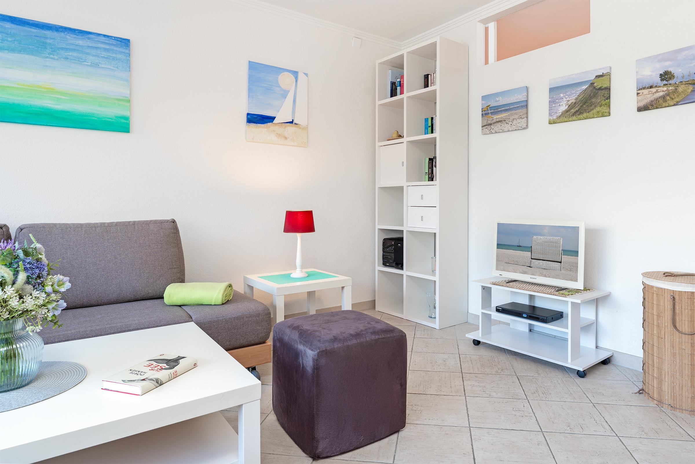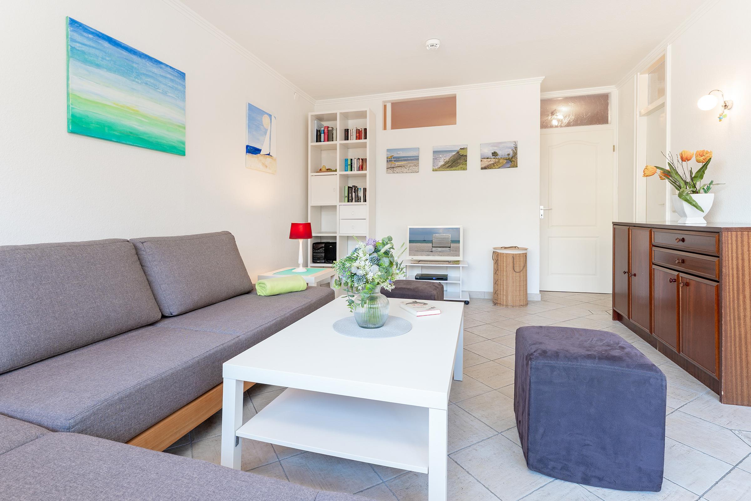 Nur über wenige Eingangsstufen erreichen Sie den direkt an der Strandpromenade gelegenen "Terrassenhügel". Der Fahrstuhl bringt Sie bequem in die 1. Etage. Sie betreten die Wohnung (ca. 53 qm) und befinden sich in einem Flur mit Einbauschrank, großem Spiegel und Garderobe. Rechts befindet sich das innenliegende Schlafzimmer mit Oberlichtern zum Wohnraum und einem Doppelbett mit 2 Einzelmatratzen (jeweils 80x200cm). Geradeaus über den Flur gelangen Sie in den hellen Wohn-Essbereich mit einer breiten Fensterfront und Zugang zum Balkon. Entspannen Sie sich nach einem erlebnisreichen Urlaubstag auf dem gemütlichen Ecksofa bei Ihrer Lieblingsfernsehserie. Im Handumdrehen lässt sich das bequeme Ecksofa (2x 80x200cm) zu einer weiteren Schlafmöglichkeit für 2 Personen herrichten.