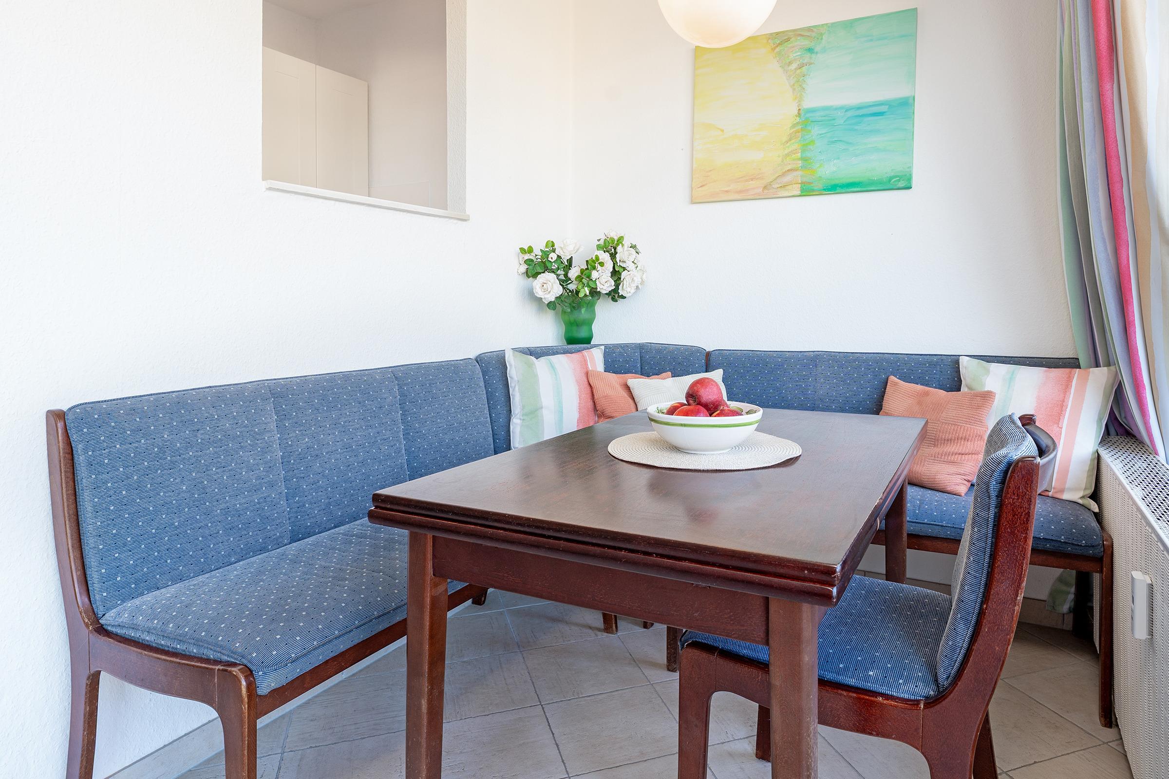 Von der Eckbank mit Esstisch können Sie schon beim Frühstück auf die Ostsee schauen. Die separate über den Wohnraum erreichbare Küche ist funktionell ausgestattet. Das Highlight ist sicherlich der ca. 12m² große Balkon, von dem aus Sie den Blick nach Nordwest auf den Kurpark und nach Osten auf die Ostsee haben. Herrlich - bewundern Sie den traumhaften Sonnenaufgang über der Ostsee. Vom Nachmittag bis zum Sonnenuntergang können Sie sich auf dem Balkon von der Sonne verwöhnen lassen! Ein W-LAN- Anschluss steht kostenfrei zur Verfügung. Münzwaschmaschine und Münztrockner sind zur gemeinschaftlichen Nutzung im Haus vorhanden.