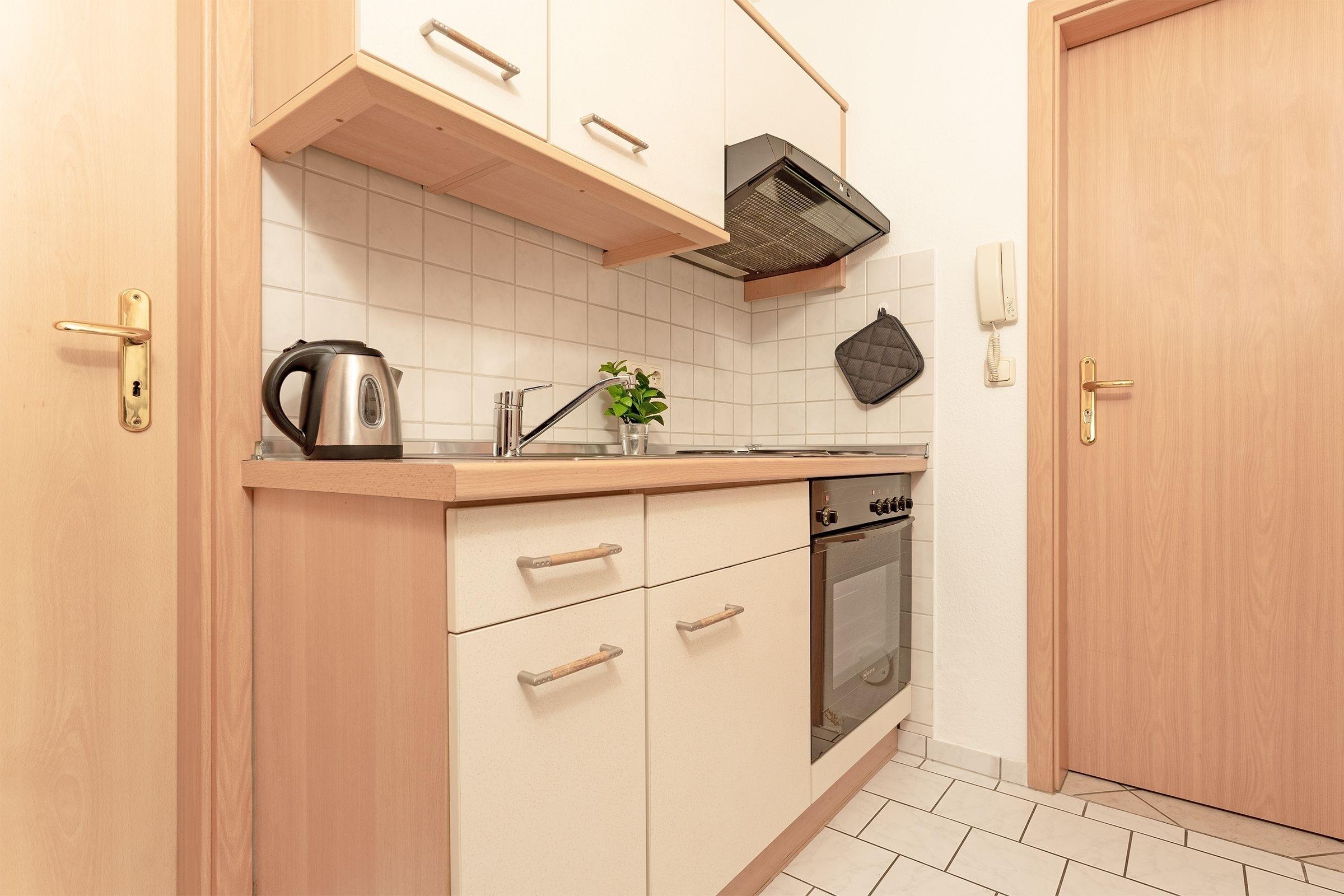 Das 1-Zimmer Appartement ist ausgestattet mit einem Doppelbett (140x200 cm) sowie einem gemütlichen Esstisch für 2 Personen. Das gemütliche 2-Sitzer-Sofa und der Flachbildfernseher laden zu kuscheligen Abenden ein. Die separate Küche mit Fenster, Backofen, Gefrierfach, Herd, Kaffeemaschine, Mikrowelle, Toaster und Wasserkocher ist voll ausgestattet und lädt dazu ein leckere Gerichte zu kreieren. Von hier gelangen Sie in das tageslicht-Bad mit Dusche und WC.