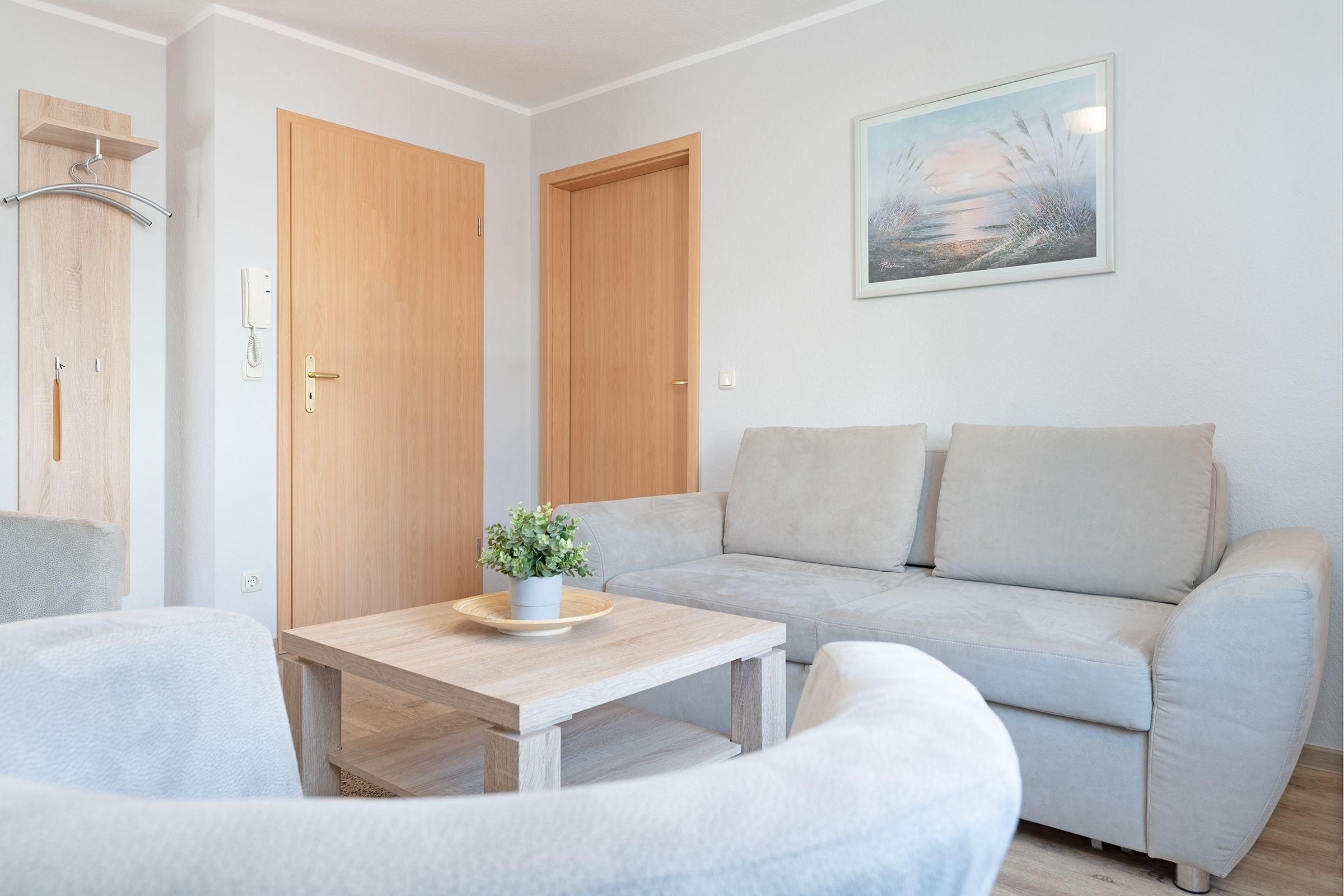 Vom Wohnzimmer mit gemütlicher und moderner Schlafcouch (140x200 cm), Flat-TV und Radio, sowie Essecke für 4 Personen gelangen Sie in das großzügige, helle Schlafzimmer mit Doppelbett (180x200 cm) und geräumigem Kleiderschrank für all Ihre Urlaubsutensilien. Die separate Küche ist mit Backofen, Herd, Kaffeemaschine, Mikrowelle, Toaster und Wasserkocher voll ausgestattet und lädt Sie ein, interessante Gerichte zu kreieren und zu zaubern. Das hell geflieste Duschbad rundet diese Ferienwohnung ab. Der WLAN-Anschluss ist inklusive.