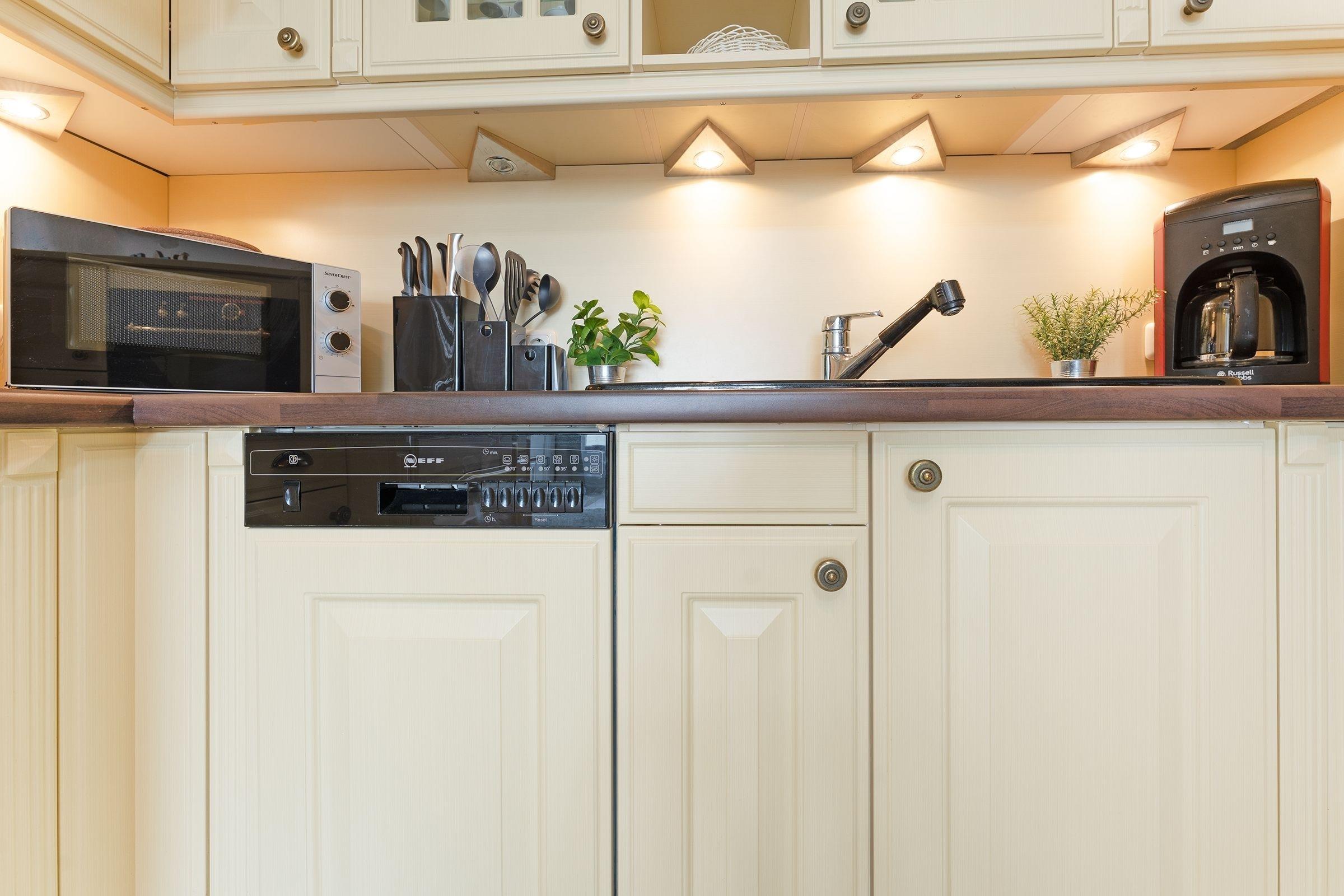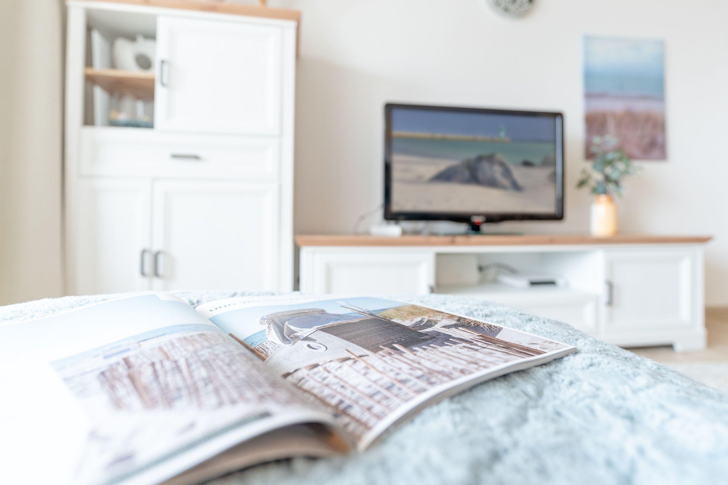 Rechterhand das kleine Duschbad mit WC und Handtuchheizung, das durch seine Marmorfliesen eine besondere Ausstrahlung hat. Ein Einbauschrank mit einer Spiegeltür bietet genügend Stauraum für Ihre Badutensilien. Links neben dem Bad befindet sich das Schlafzimmer mit einem Doppelbett (2x 90x200 cm) einem 3-flügligen Kleiderschrank und direktem Zugang auf den Balkon. Vom Schlafzimmer gelangen Sie über den Flur in den Wohn-Essbereich mit offener gut ausgestatteter Einbauküche und hochwertigen Elektrogeräten. Das Sofa mit Schlaffunktion (Liegefläche 140x200 cm) bietet eine zusätzliche Schlafmöglichkeit. Zur Ausstattung gehört ein Flat-TV, eine HiFi-Anlage mit CD-Player und Radio und ein Zugang zum WLAN-Netz. Der nach Nord-West ausgerichtete große Balkon mit seitlichem Meerblick, den man ebenfalls vom Wohnbereich erreicht, lädt dazu ein, die Abende in gemütlicher Atmosphäre ausklingen zu lassen.