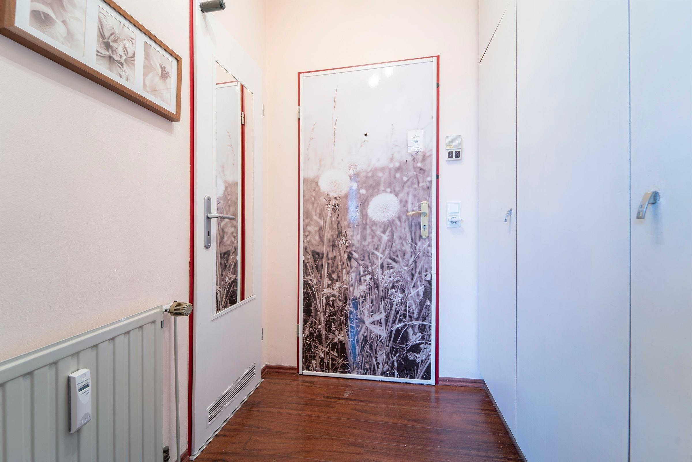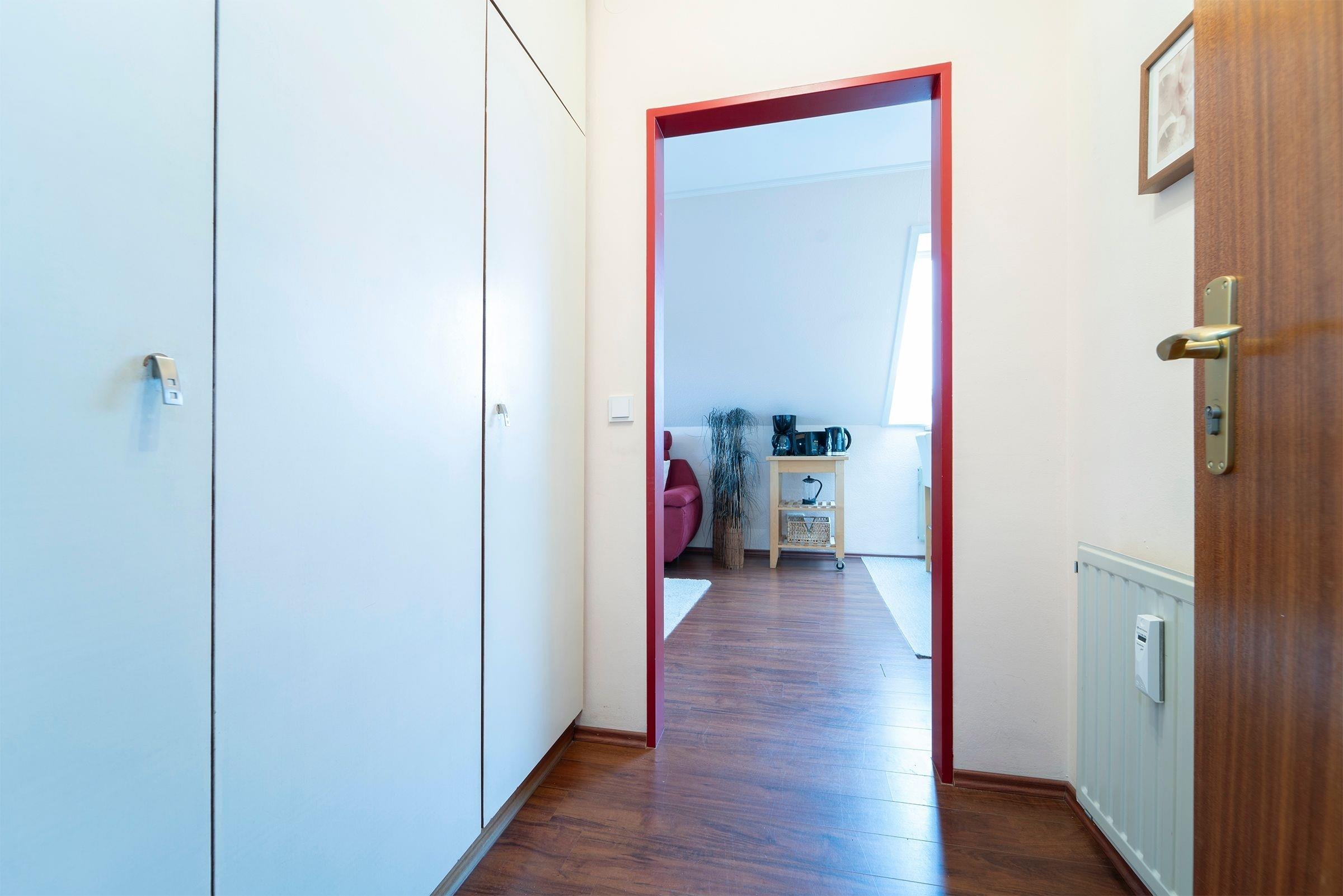 Nur noch wenige Stufen trennen Sie von der Eingangstür Ihres Feriendomizils (ca. 55 qm). Tür auf - und Sie sind da! Lichtstrahlen von den großen Fenstern fallen in den Eingangsflur, Jacken und Schuhe sind ordentlich aus der Sicht geräumt in dem Einbauschrank.