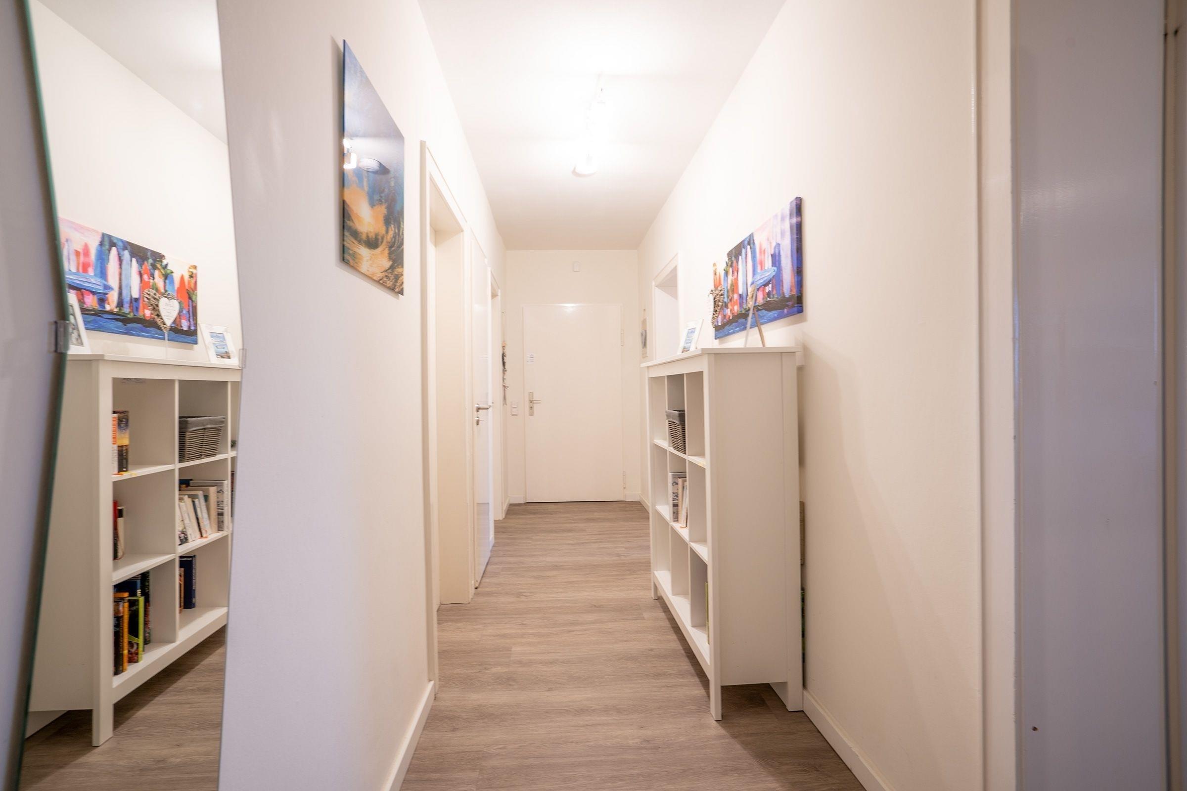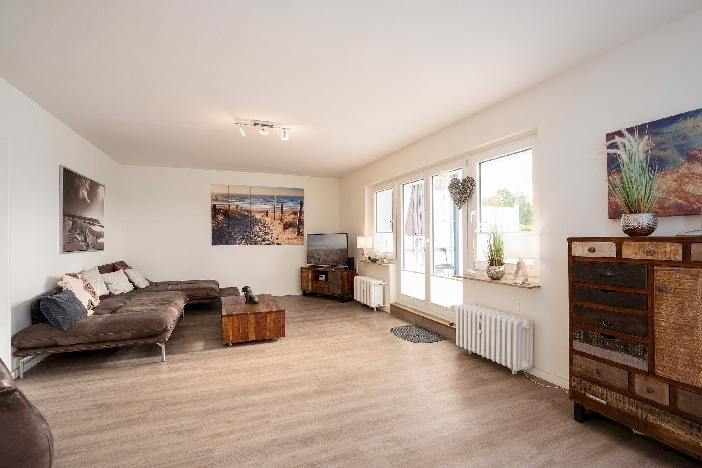 Sie öffnen Ihre Domiziltür und werden sofort begeistert sein. Ein geräumiger Flur empfängt Sie. Ihr kombinierter Wohn- und Essbereich ist ein Traum: Es wartet auf Sie eine bequeme Couch und eine charmante Einrichtung.