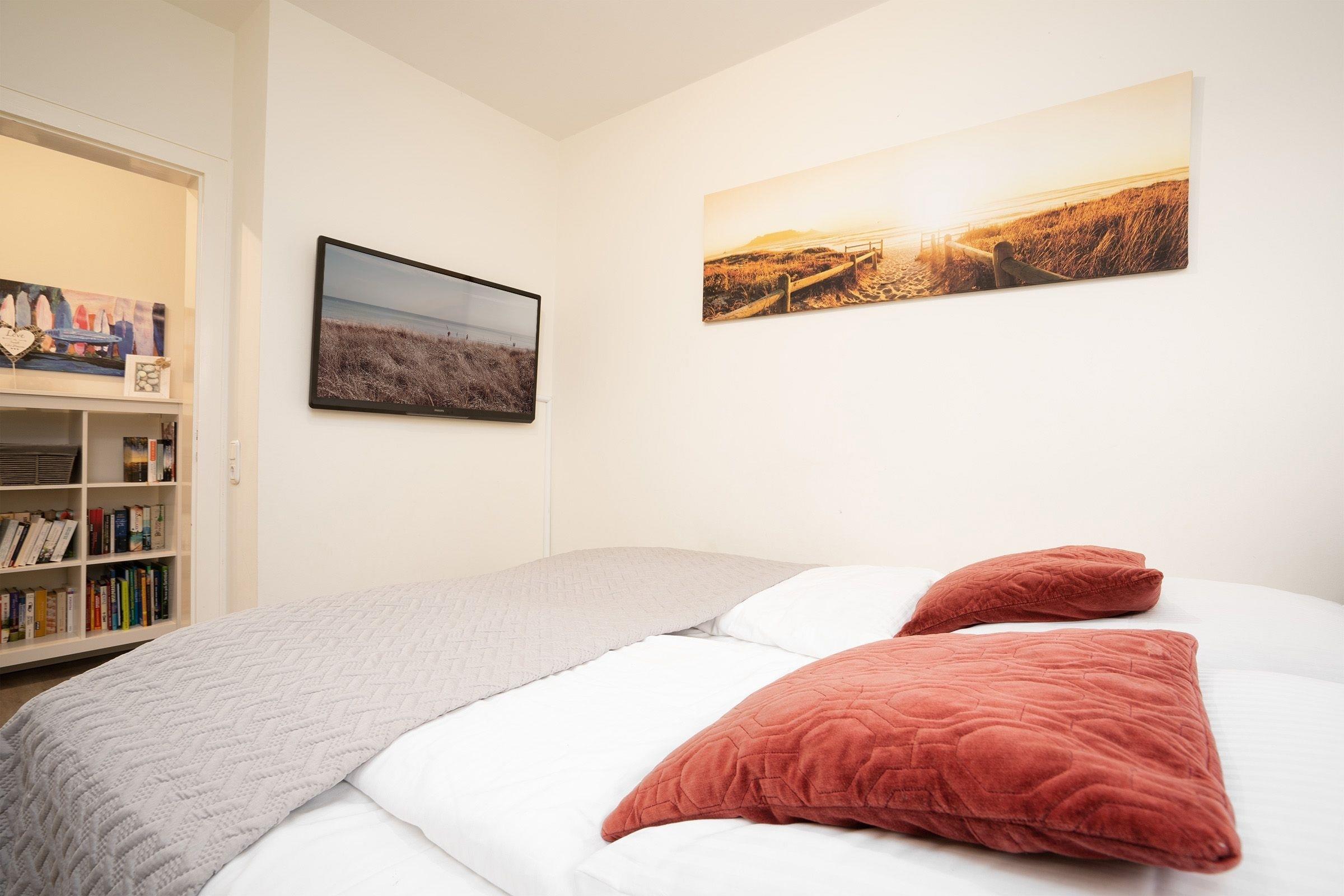 Die Küche ist sehr gut ausgestattet und bietet Ihnen viele Möglichkeiten, mit der ganzen Familie gemeinsam zu kochen. Ihr anschließender Essbereich lässt Sie nach Herzlaune Schlemmen und Genießen. Mit der Nespresso-Kaffeemaschine können Sie sich z.B. einen leckeren Espresso nach dem Essen zubereiten. Vom Wohnzimmer aus gelangen Sie auf die überdachte Terrasse, die morgens zum ersten Kaffee einlädt und Ihnen abends unvergessliche Momente schenkt, wenn die Sonne untergeht. Im hell eingerichteten Schlafzimmer mit Boxspringbett (180x200cm) und großem Schrank werden Sie traumhaft schlafen. Komfortabel!...Auch hier wurde an einen weiteren Flat-Screen-TV gedacht. In Ihrem zweiten Schlafzimmer erwarten Sie ein Boxspringbett (180x200 cm) mit hochwertiger Matratze, die für Ihren erholsamen Schlaf sorgt und ein weiterer Schrank für Ihre Garderobe. Das moderne Tageslichtbad mit Dusche, WC und Handtuchwärmer rundet das Gesamtbild der Ferienwohnung ab. Obwohl man im Urlaub Haushaltarbeit strikt unterlassen sollte, ist für den Notfall dennoch Waschmaschine vorhanden. Die Internetnutzung ist über W-LAN kostenlos möglich.