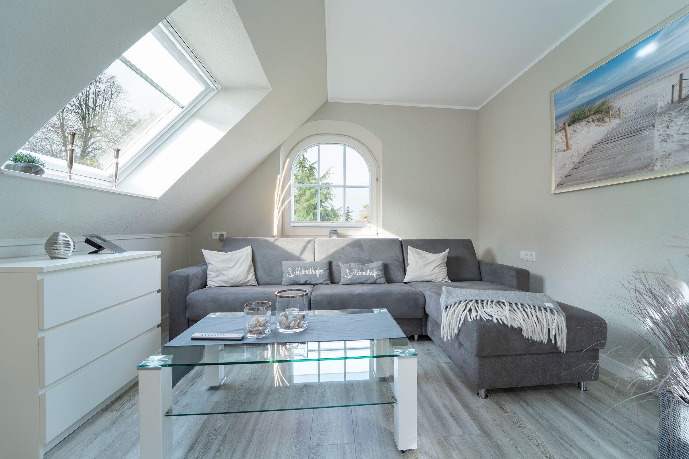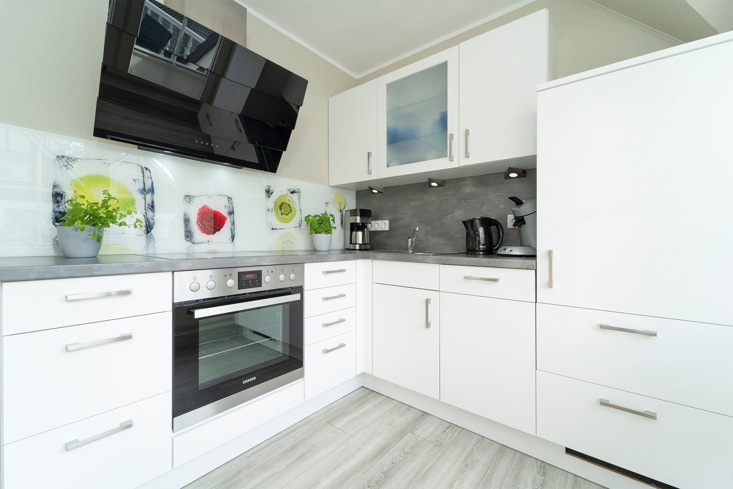 Sie betreten das Treppenhaus Ihres Ferienunterkunft und gelangen über eine großzügige Treppe in die 1. Etage. Treten Sie ein. Vom Flur, der mit einem Schuhschrank, einem Kleiderständer und einem Einbauschrank ausgestattet ist gelangen Sie in alle Zimmer der Wohnung. Das Schlafzimmer wurde mit einem bequemen Boxspringbett mit durchgehender Matratze (180x200 cm) ausgestattet. Die Nachtruhe ist durch Verdunklungsvorhänge gesichert. Ihre Urlaubsgarderobe lässt sich in einem geräumigen Schlafzimmerschrank verstauen. Der Wohn- Essbereich, wurde modern und freundlich gestaltet. Ein hochwertiges Ecksofa mit Schlaffunktion (160x200 cm) lädt nach einem ausgiebigen Strandtag zum Entspannen ein. In der offenen Küche, die mit Geschirrspüler, Backofen, Kaffeemaschine, sowie zusätzlich mit einer Kaffeepad-Maschine, Wasserkocher, Eierkocher und Toaster ausgestattet ist lassen sich leckere Urlaubsmenüs zubereiten. Genießen Sie den ersten Kaffee am Morgen auf dem Balkon oder tanken Sie nachmittags ausgiebig Sonne auf Ihrem Süd-West Balkon mit Markise. Das funktionell eingerichtete Duschbad mit Regendusche, Spiegelschrank Handtuchheizung und Fön rundet das Gesamtbild dieses komfortablen Feriendomizils ab.