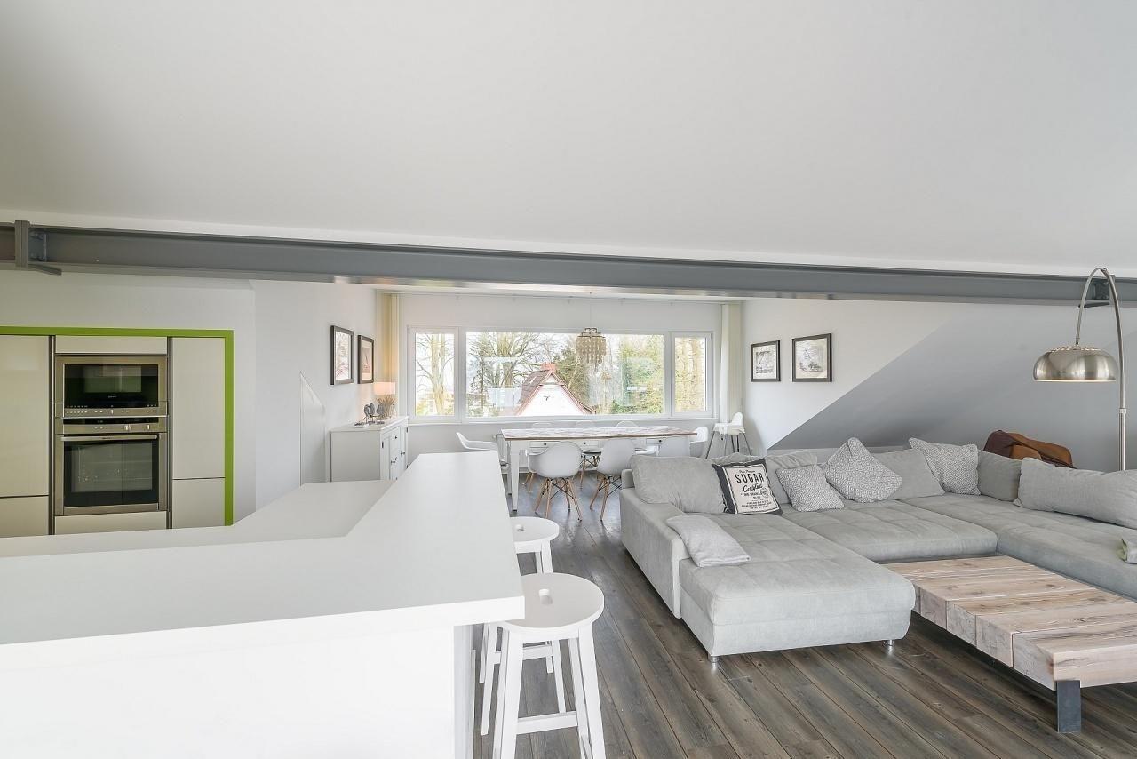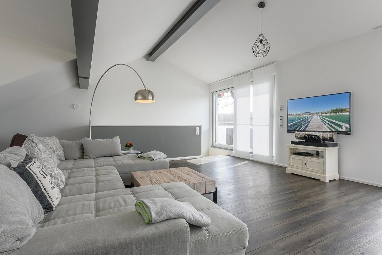 Eine Treppe mit Designbodenbelag führt Sie in den oberen Bereich. Wow... werden Ihre ersten Worte sein! Auf der gesamten Ebene ist der offene Wohn- Essbereich mit einer 42qm großen Dachterrasse. Charmante Dachschrägen mit freiliegenden Stahlträgern, lichtdurchflutetet durch die breite bodentiefe Fensterfront besticht dieser Raum. Eine große Sofalandschaft ausgerichtet zum Balkon lädt zum Entspannen nach einem erlebnisreichen Urlaubstag ein. Gegenüber, die moderne vollausgestattete Küche, die keine Wünsche offen lassen dürfte. Am Tresen können Sie einen kleinen Aperitif genießen. "Tafeln Sie auf" .... ein großer Esstisch lädt dazu ein.