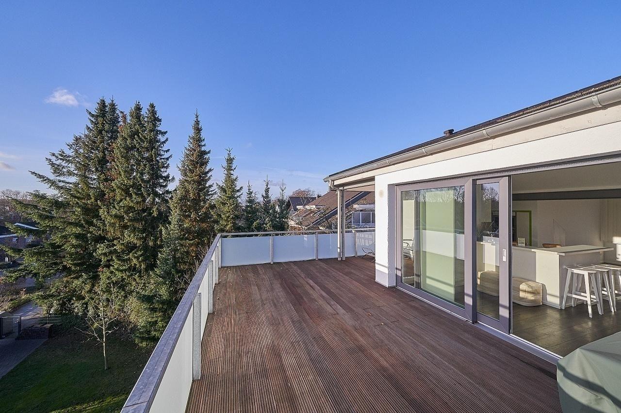 Vom großzügigen Wohnraum treten Sie hinaus auf die fantastische ca. 50 m² große, mit Schiffsboden versehene Dachterrasse. Genau der richtige Platz, um die nordische Abendstimmung mit Blick ins Grüne und entfernt auf die Ostsee zu genießen.