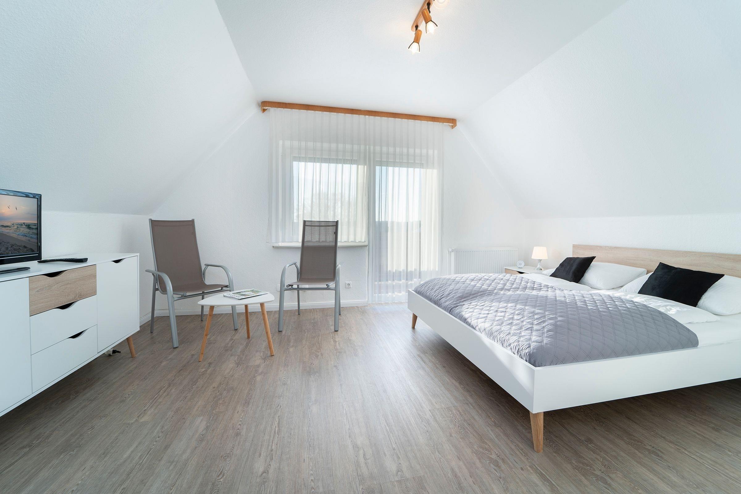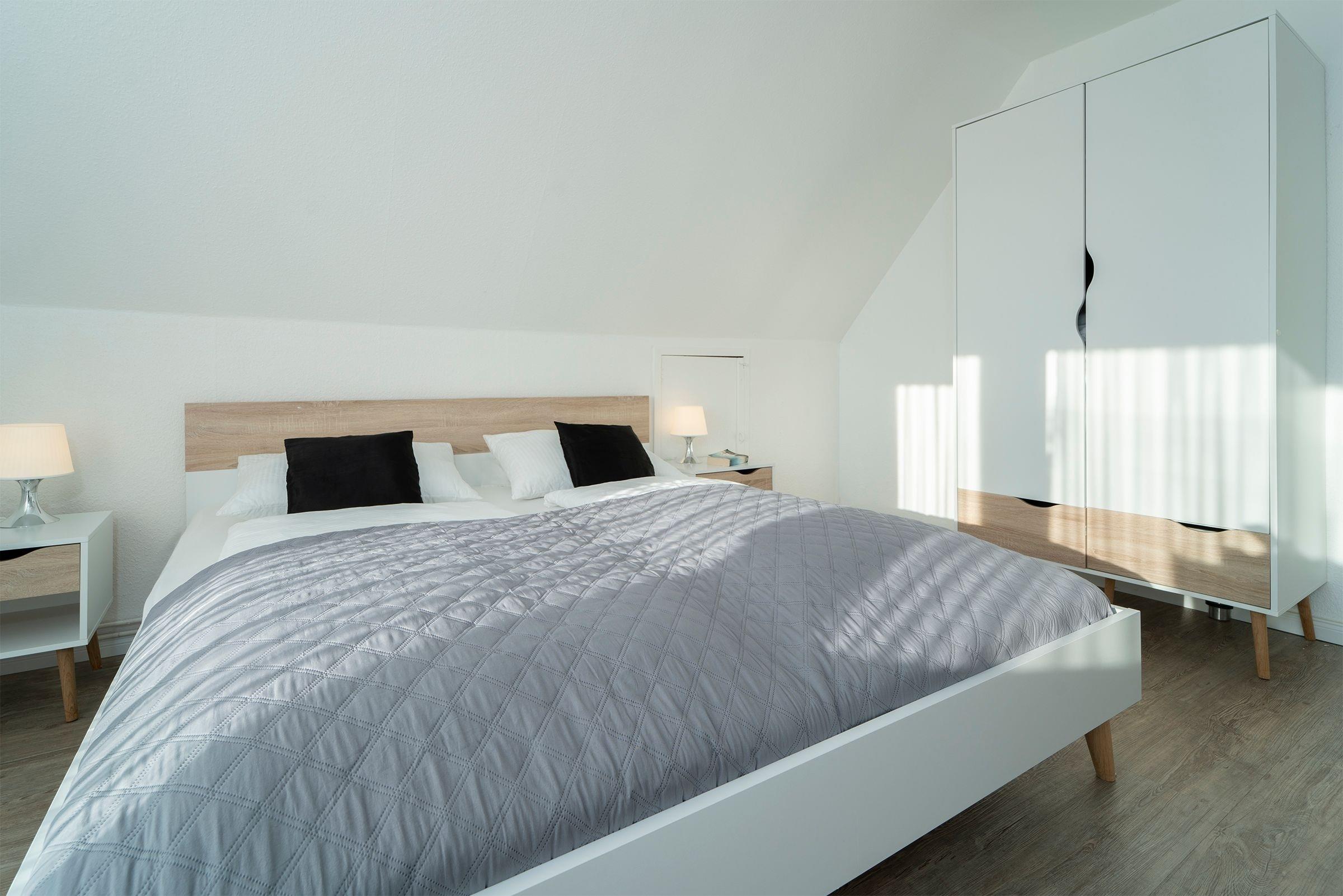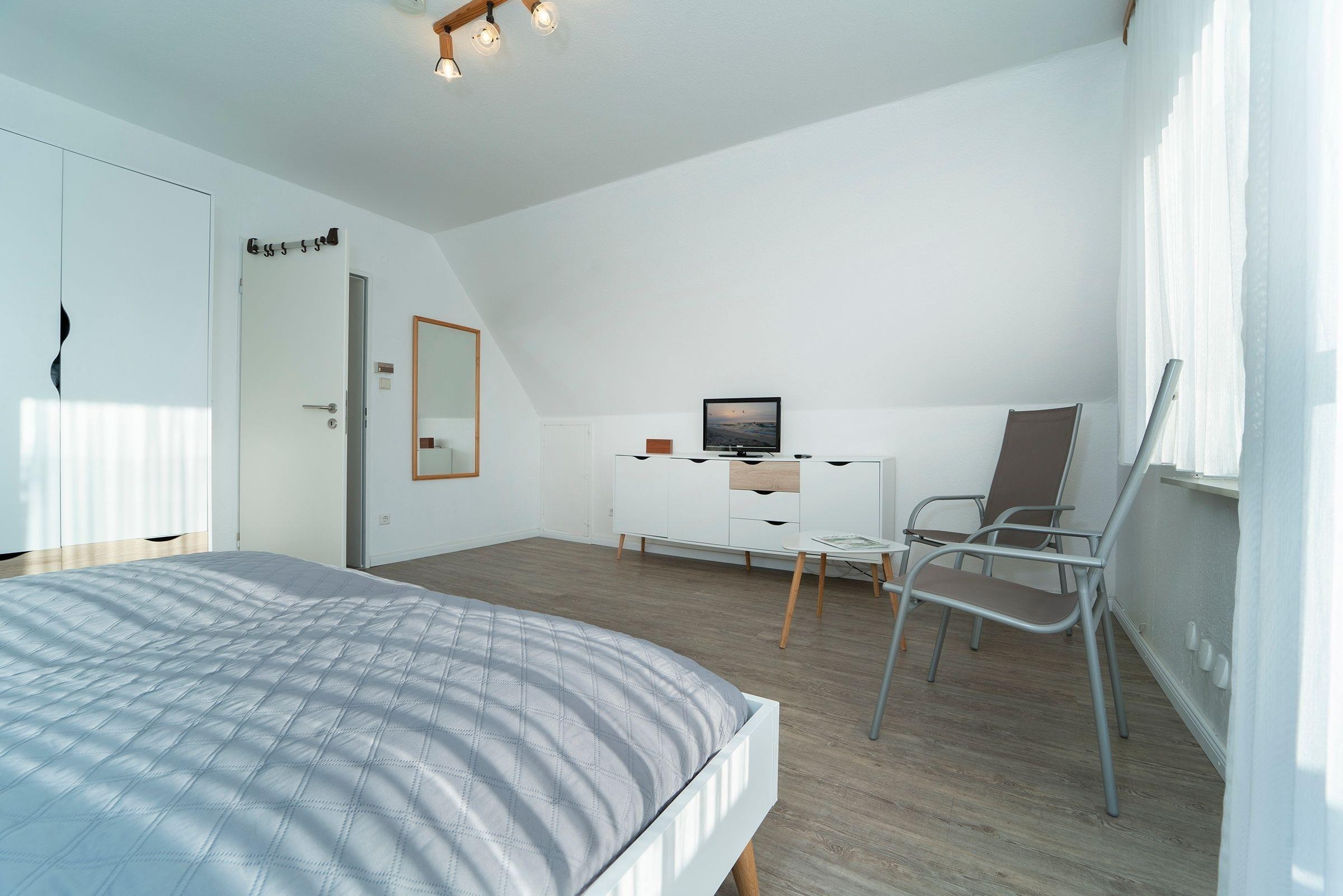Schlafzimmer 1: 1 Doppelbett (140x200 cm), TV, Kleiderschrank