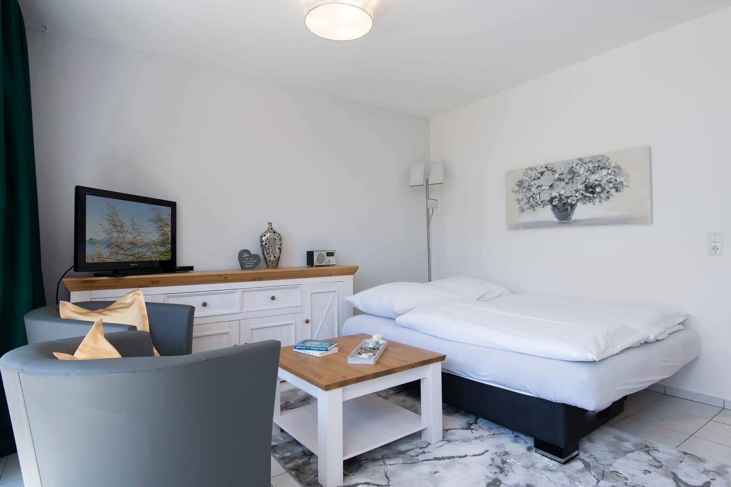 Auf 2 Zimmer verteilen sich hier das Schlafzimmer mit 2 Einzelbetten und in das helle Wohnzimmer im Landhausstil mit gemütlicher Schlafcouch, angrenzender offener Küche und Essbereich. Für Unterhaltung sorgen ein TV und ein CD-Player. Vom Wohnzimmer haben Sie Zugang zu der großzügigen Terrasse mit Terrassenmöbeln. Hier genießen Sie Ihren Morgenkaffee während Ihnen die salzige Luft um die Nase weht. Die Küche ist voll ausgestattet mit Backofen, Gefrierfach, Herd, Kaffeemaschine, Kühlschrank, Mikrowelle, Spülmaschine, Toaster und Wasserkocher. Das moderne Bad mit Dusche und Föhn rundet diese Ferienwohnung ab.
