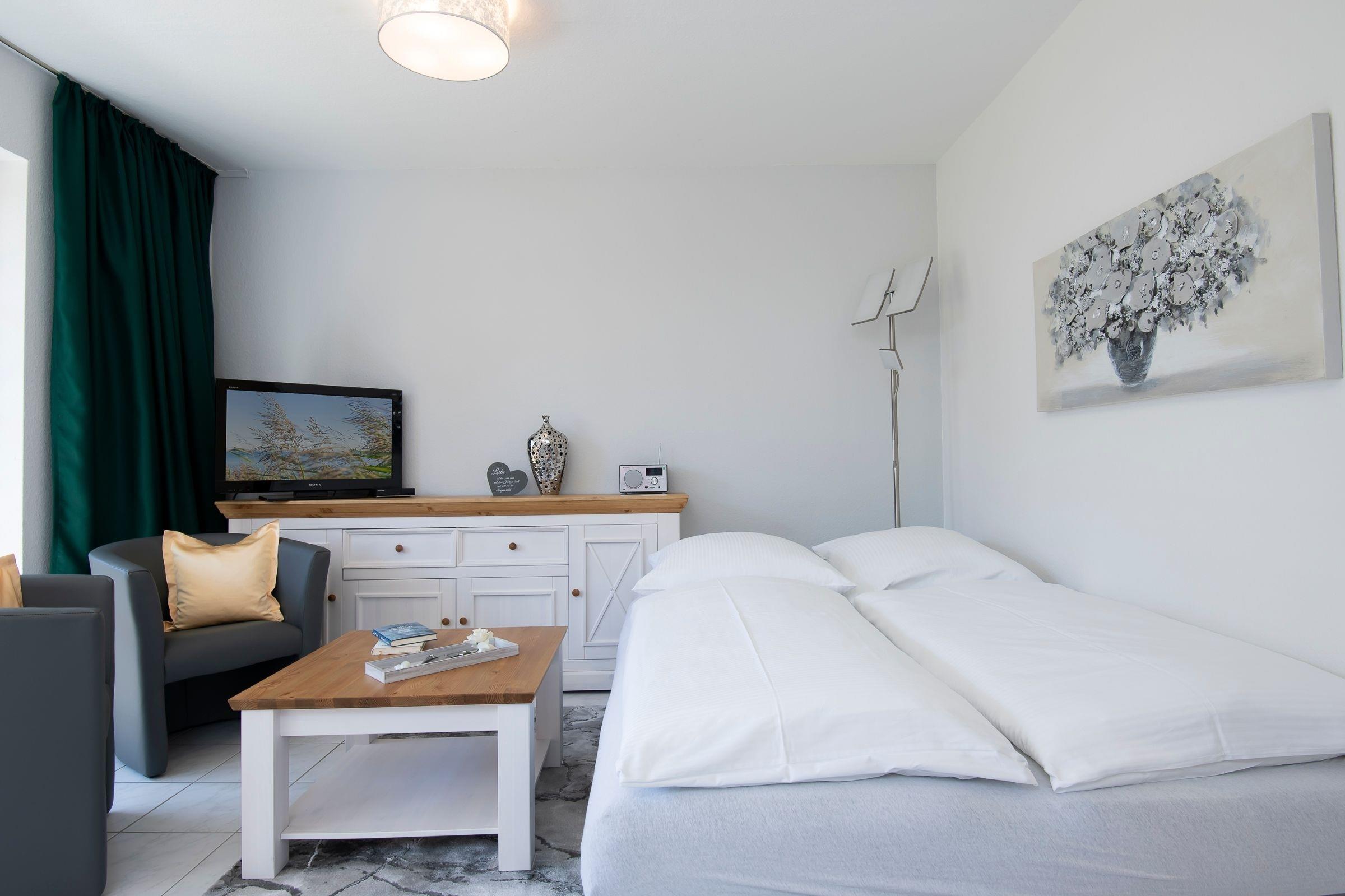 Auf 2 Zimmer verteilen sich hier das Schlafzimmer mit 2 Einzelbetten und das helle Wohnzimmer im Landhausstil mit gemütlicher Schlafcouch, angrenzender offener Küche und Essbereich. Für Unterhaltung sorgen ein TV und ein CD-Player. Vom Wohnzimmer haben Sie Zugang zu der großzügigen Terrasse mit Terrassenmöbeln. Hier genießen Sie Ihren Morgenkaffee während Ihnen die salzige Luft um die Nase weht. Die Küche ist voll ausgestattet mit Backofen, Gefrierfach, Herd, Kaffeemaschine, Kühlschrank, Mikrowelle, Spülmaschine, Toaster und Wasserkocher. Das moderne Bad mit Dusche und Föhn rundet diese Ferienwohnung ab.