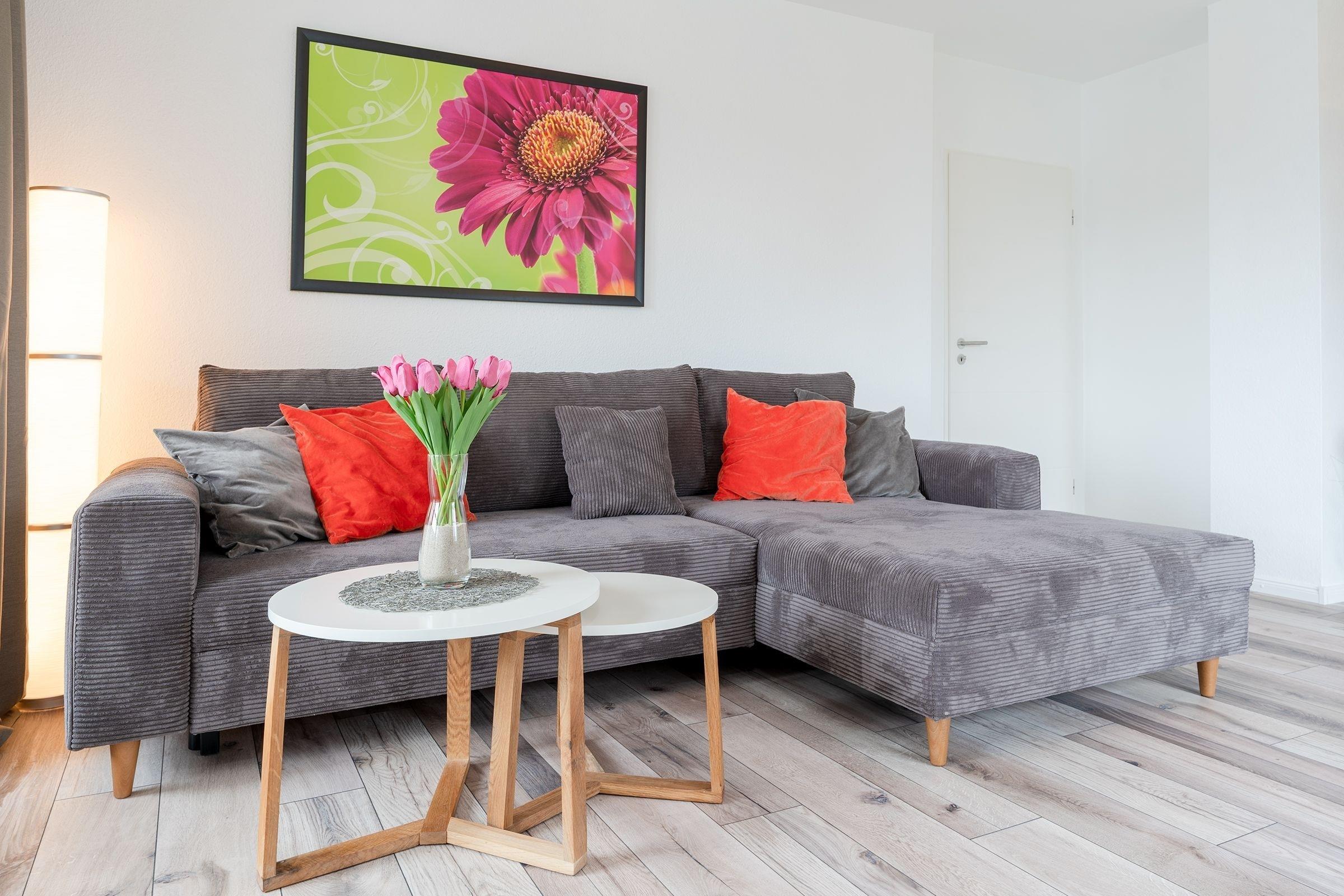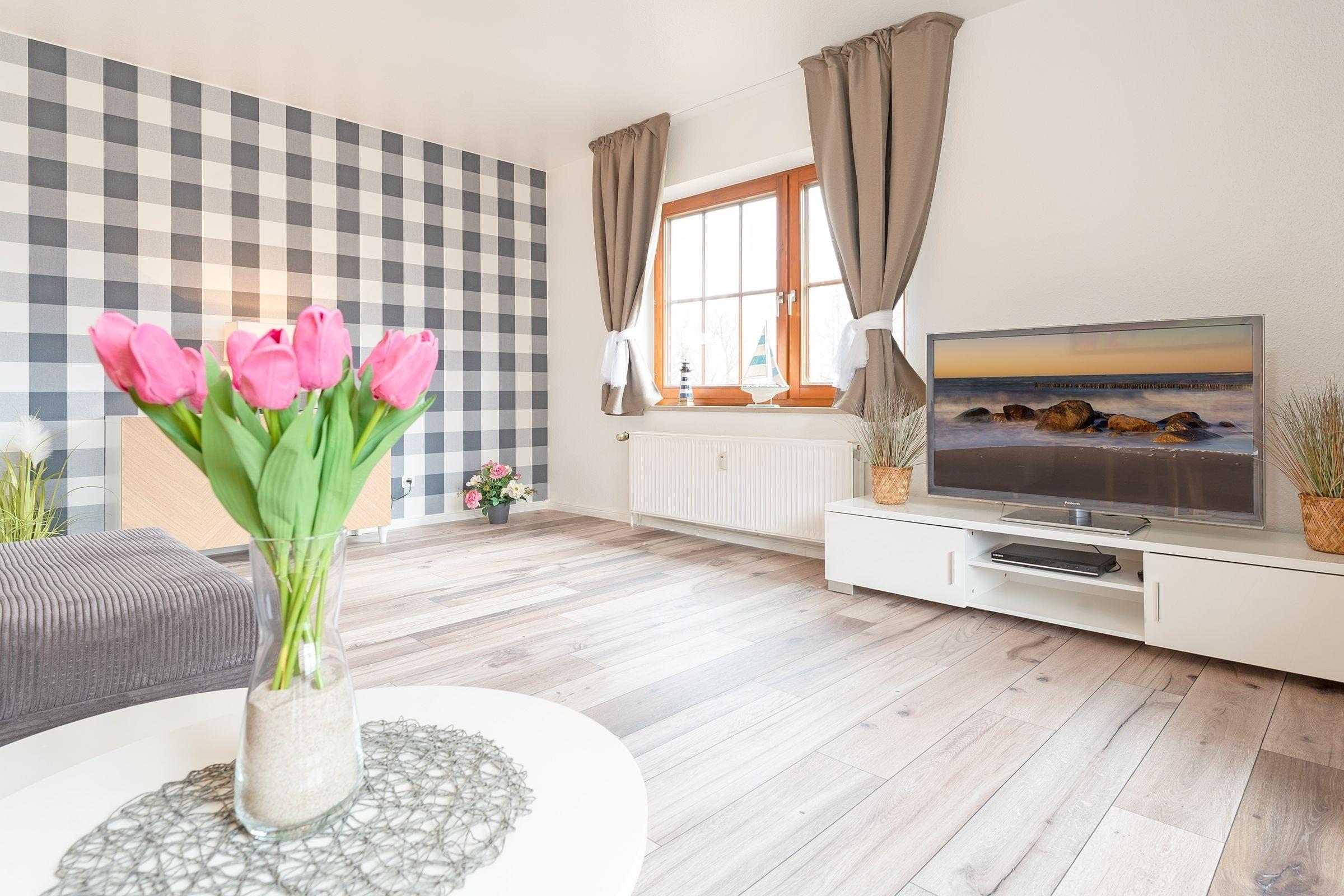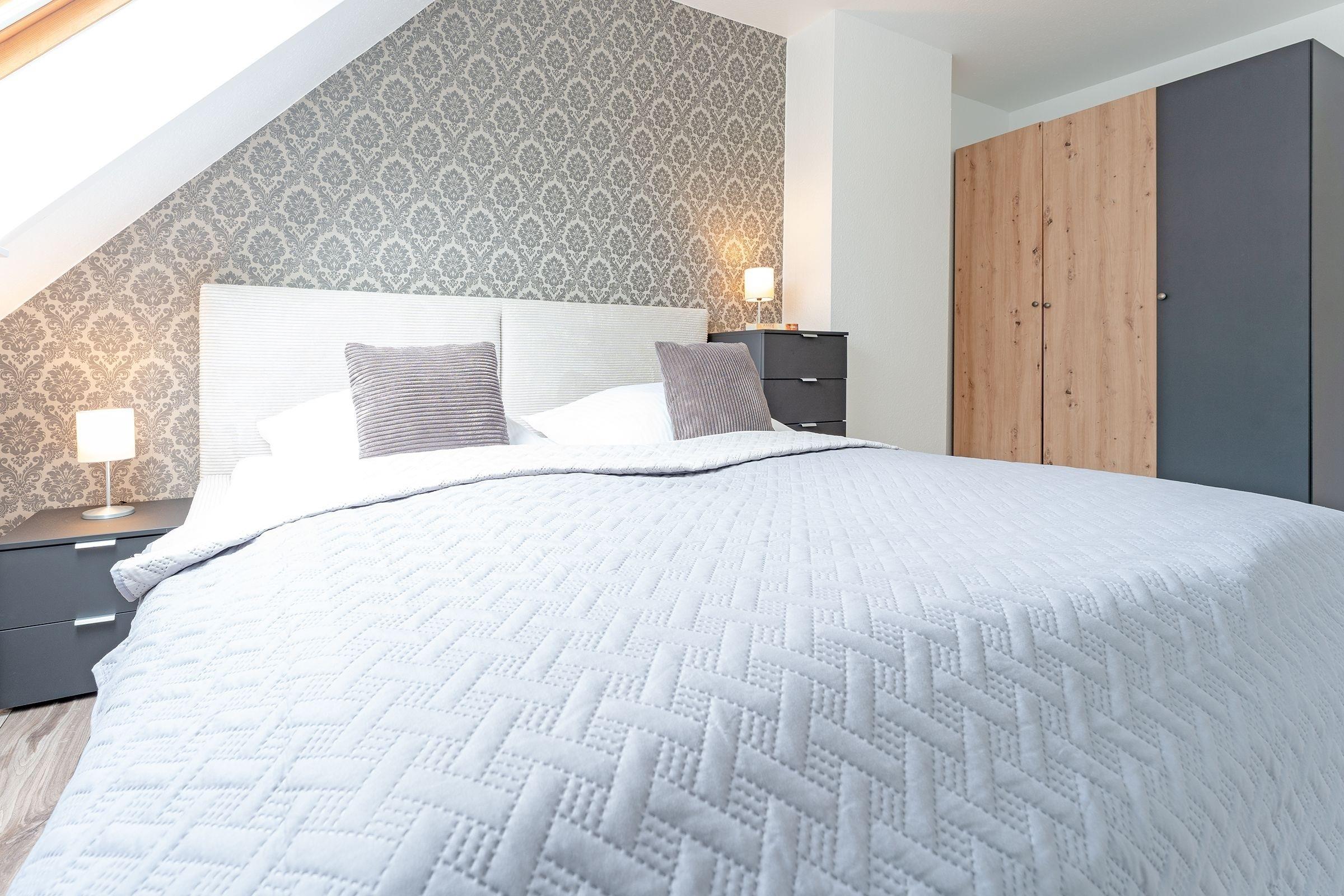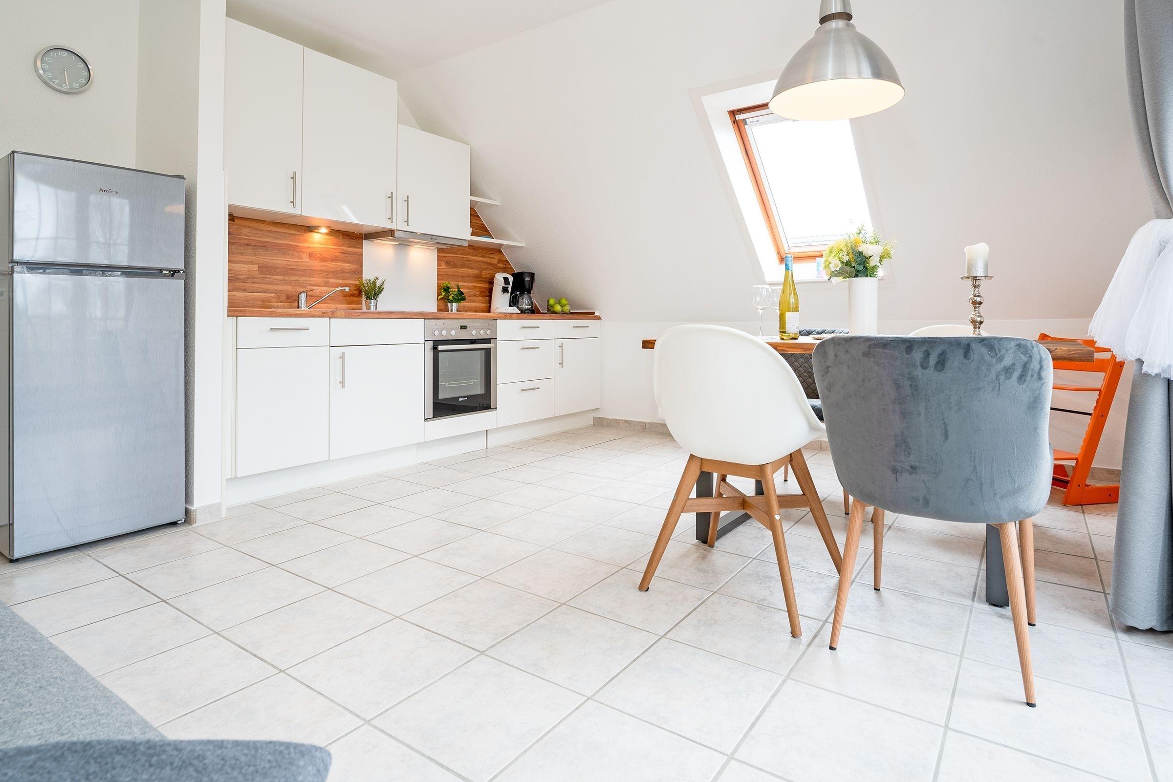 Diese helle Ferienwohnung besticht durch ihre liebevoll ausgesuchte Einrichtung. Kommen Sie herein, nehmen Sie Platz auf der kuscheligen Couch oder genießen Sie Ihre Auszeit auf dem Balkon. Ein TV-Gerät sowie ein CD-Player sorgen für die passende Unterhaltung. Für die Nacht lässt sich die Couch mit wenigen Handgriffen in ein Doppelbett (ca. 140x200 cm) verwandeln. Die großzügige Wohnküche mit Zugang zu einem weiteren Balkon verfügt über eine Schlafcouch für 2 Kinder (ca. 120x200 cm) und eine schicke Essecke. Wie wäre es hier abends mit einem Glas Wein? Die Küche mit Geschirrspülmaschine ist modern und hochwertig ausgestattet und dürfte jeden Hobby-Koch erfreuen. Bereiten Sie hier gemeinsam Ihre Lieblingsspeisen zu. Im separaten Schlafraum steht ein bequemes Doppelbett (2x 90x200 cm) und lädt zum Träumen ein. Das moderne Duschbad mit Dachfenster bietet tollen Komfort und lässt Sie prima in den Tag starten. Der WLAN-Anschluss ist inklusive.