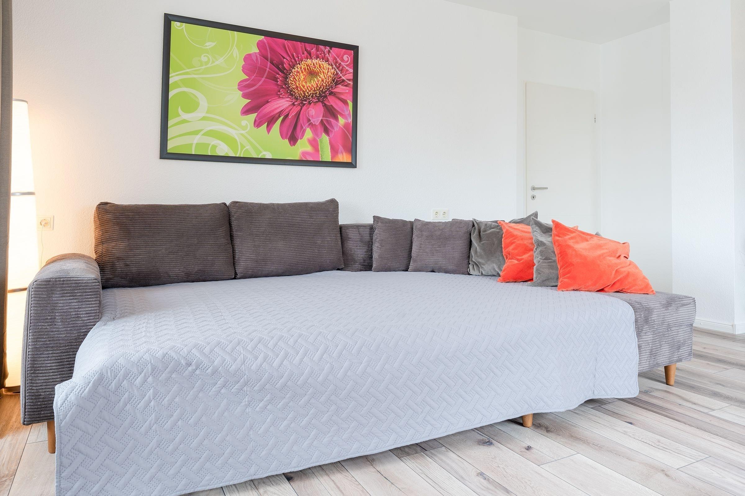 Wohnzimmer: 1 Schlafsofa (140x200 cm), TV, Verdunkelungsmöglichkeit