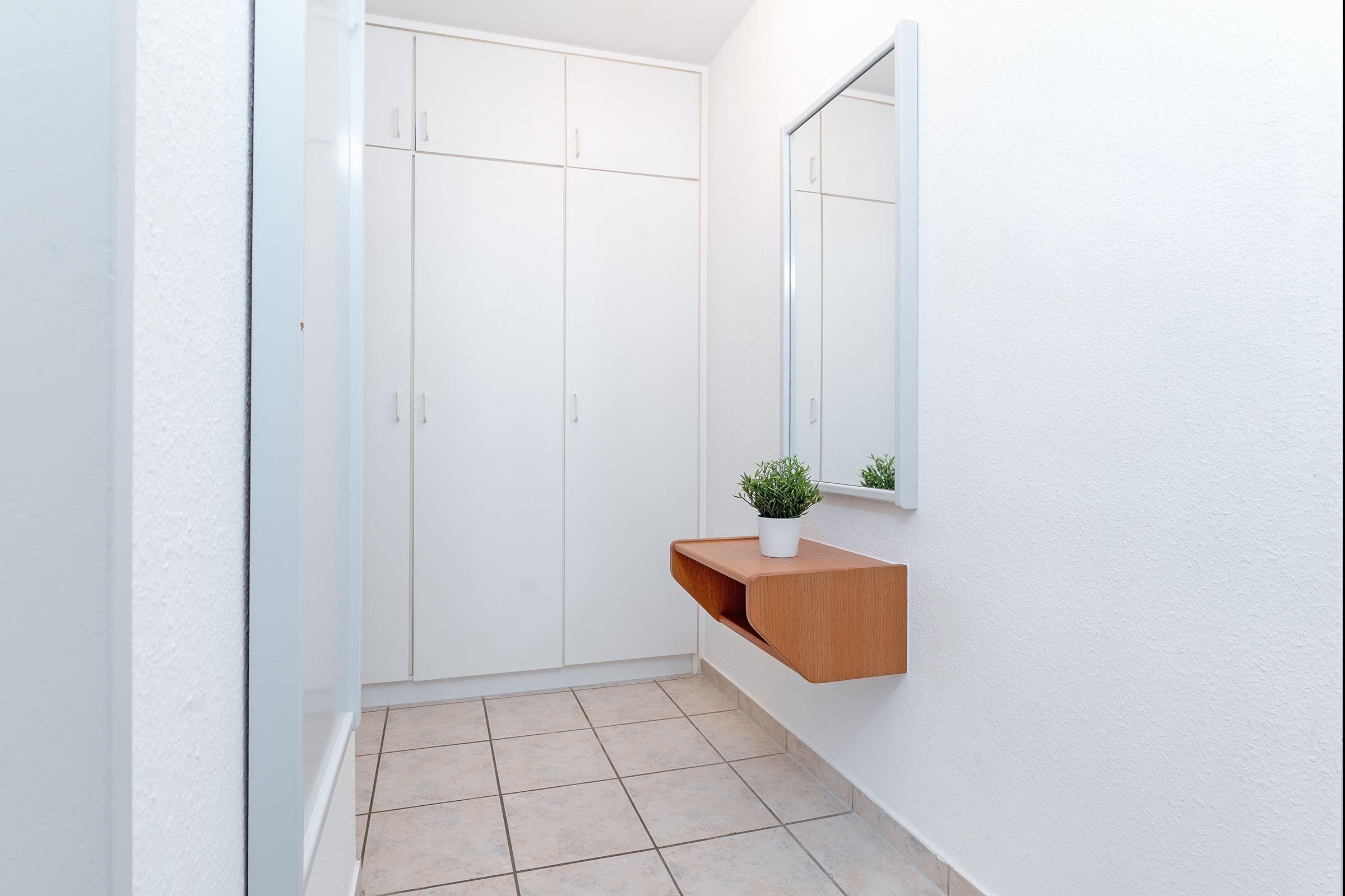 Der Wohnraum mit Schlafcouch (160x200 cm) verfügt über ein TV-Gerät (Flachbildschirm mit DVB-T Empfang) und ein Radio mit CD-Player. Außerdem befinden sich im Wohnraum der Essplatz und die komplett eingerichtete Küchenzeile mit 4-Platten-Herd, Backofen und Spülmaschine. Das Schlafzimmer ist mit einem Doppelbett (180x200 cm) ausgestattet. Der Balkon verfügt über Gartenmöbel. Duschbad mit Haar Fön. Der WLAN-Anschluss ist inklusive.