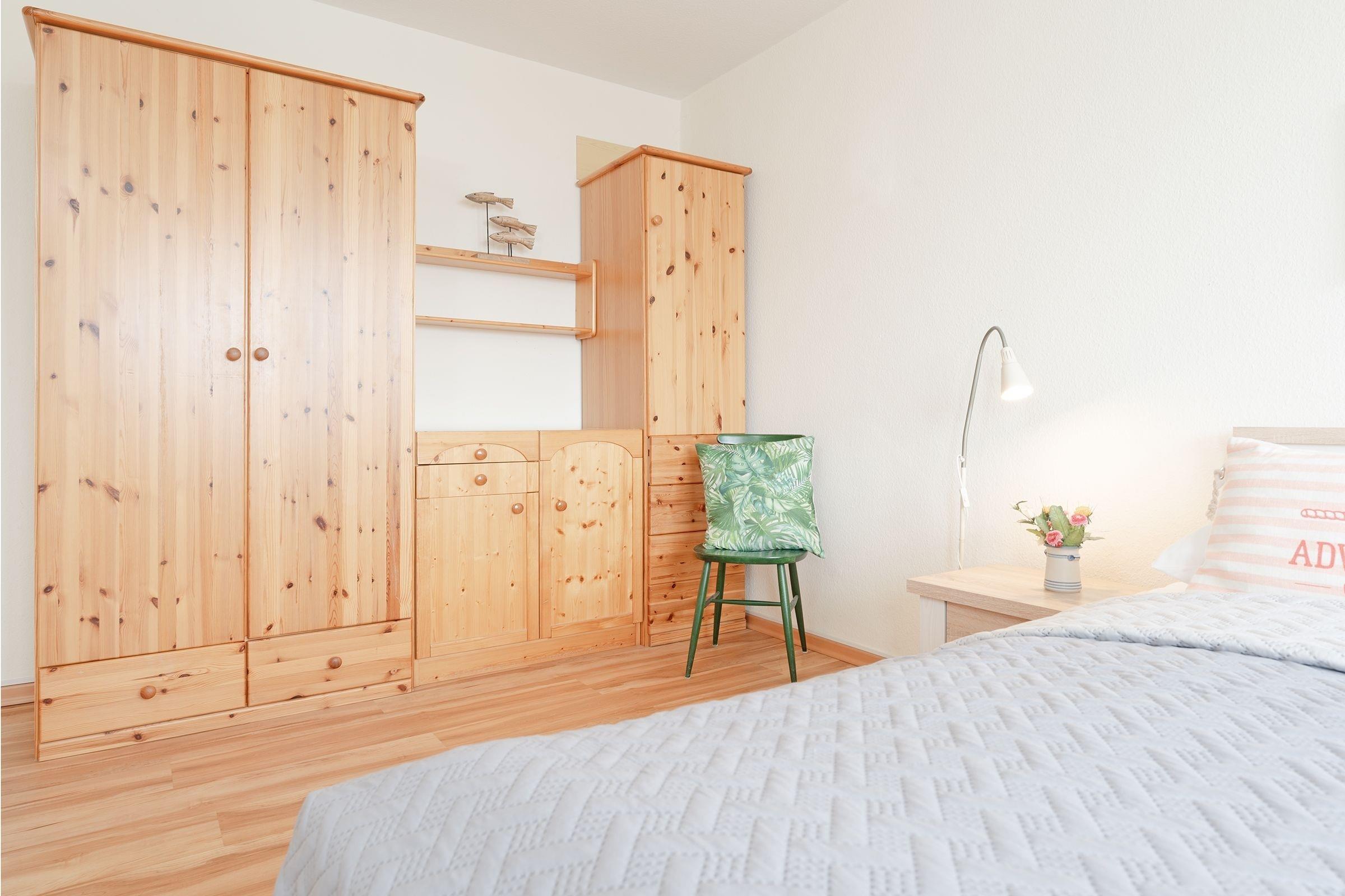 Es ist geschmackvoll und sehr gemütlich eingerichtet. Der Wohnraum verfügt über eine Couchgarnitur mit einer Schlafcouch (140x190 cm), ein TV-Gerät mit Kabelempfang und eine Stereoanlage. Der sehr großzügige Balkon in Süd-/ Westlage ist mit Balkonmöbeln ausgestattet, eine Markise spendet bei Bedarf Schatten. Im Schlafzimmer befindet sich ein Doppelbett (2x 90x200 cm) mit ausreichend Stauraum für Ihre Urlaubsgarderobe. In der separaten Küche mit Essplatz finden Sie einen 3-Plattenherd mit Backofen, Geschirrspülmaschine, Kühlschrank mit Gefrierfach, Kaffeemaschine, Wasserkocher und Toaster. Außerdem gibt es hier eine Durchreiche zum Essplatz und einen Zugang zum zweiten Balkon in Ostlage, auf dem Sie eine Tasse frischen Morgenkaffee genießen können. Das hell geflieste Badezimmer ist funktional mit Dusche/WC und beleuchtetem Spiegelschrank ausgestattet.