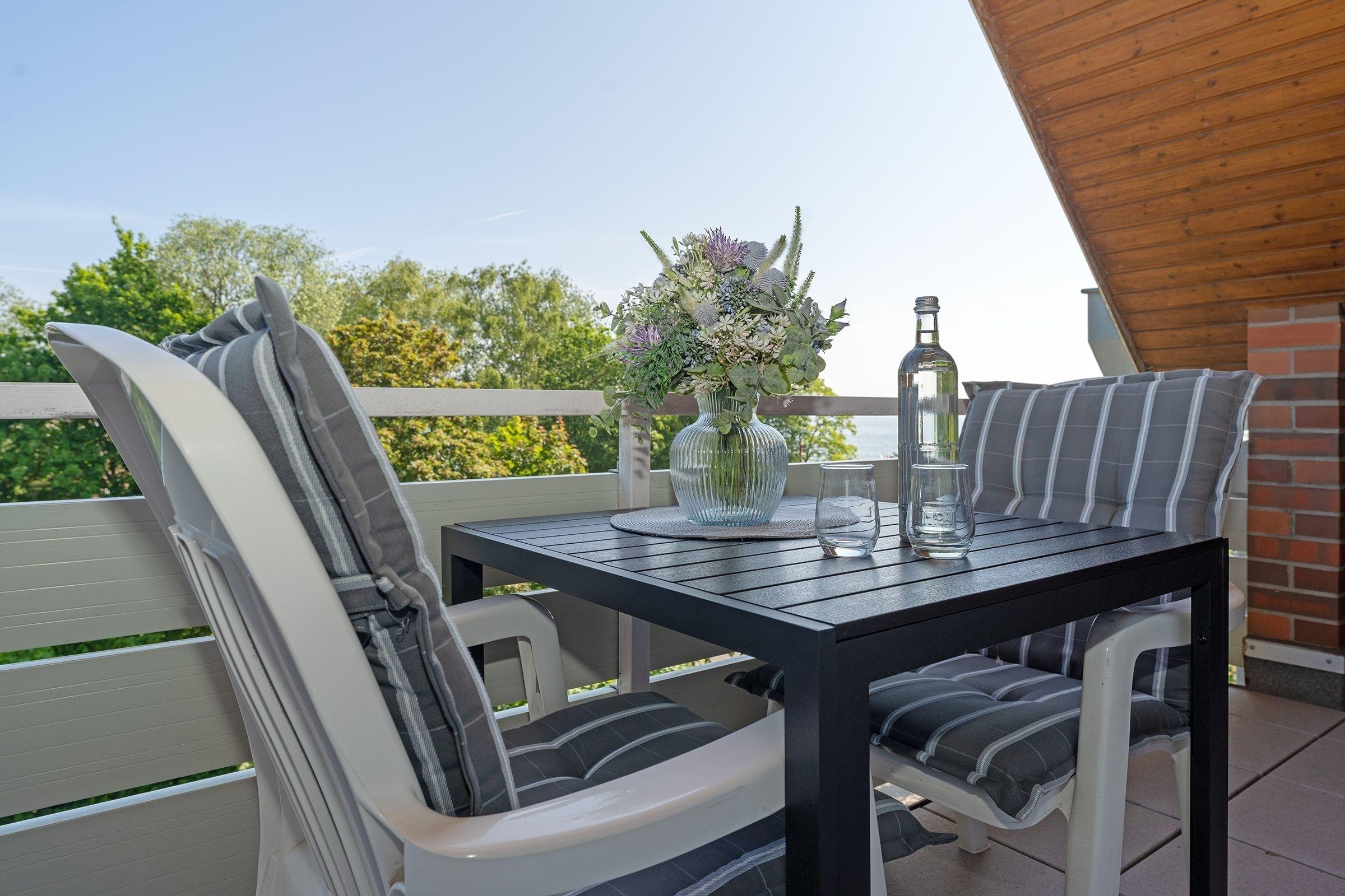 Moderne Ferienwohnung mit Balkon, Meerblick und Strandkorb in Scharbeutz für erholsamen Strandurlaub.