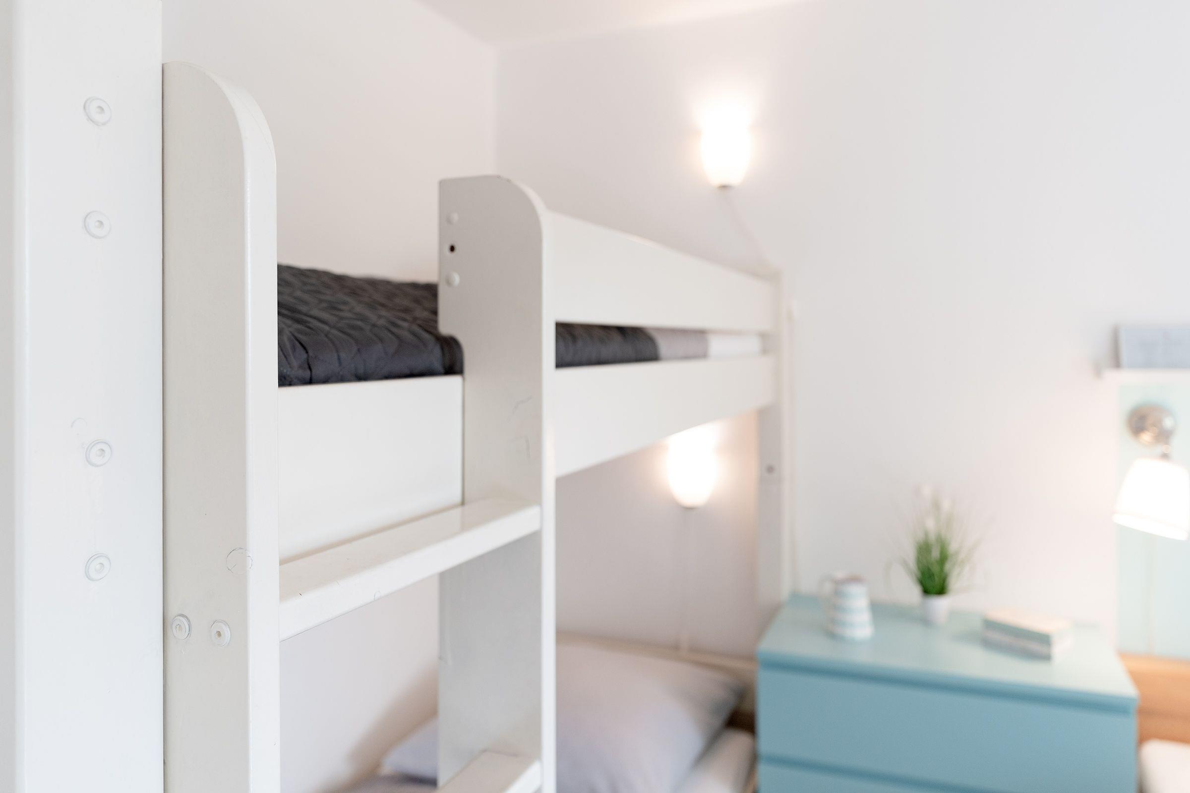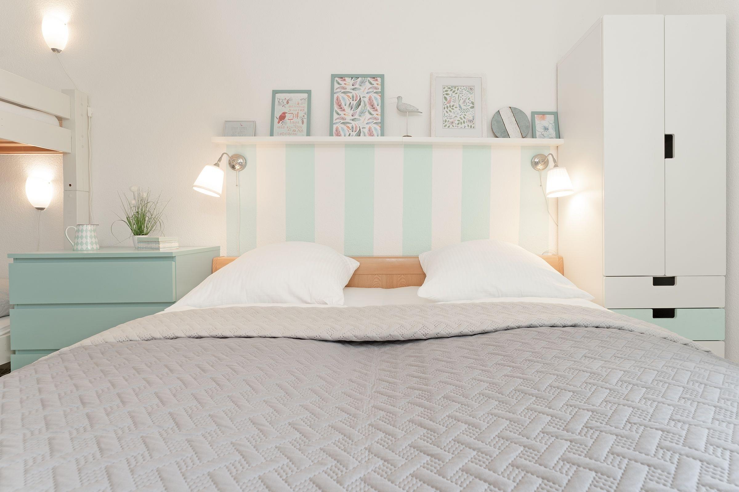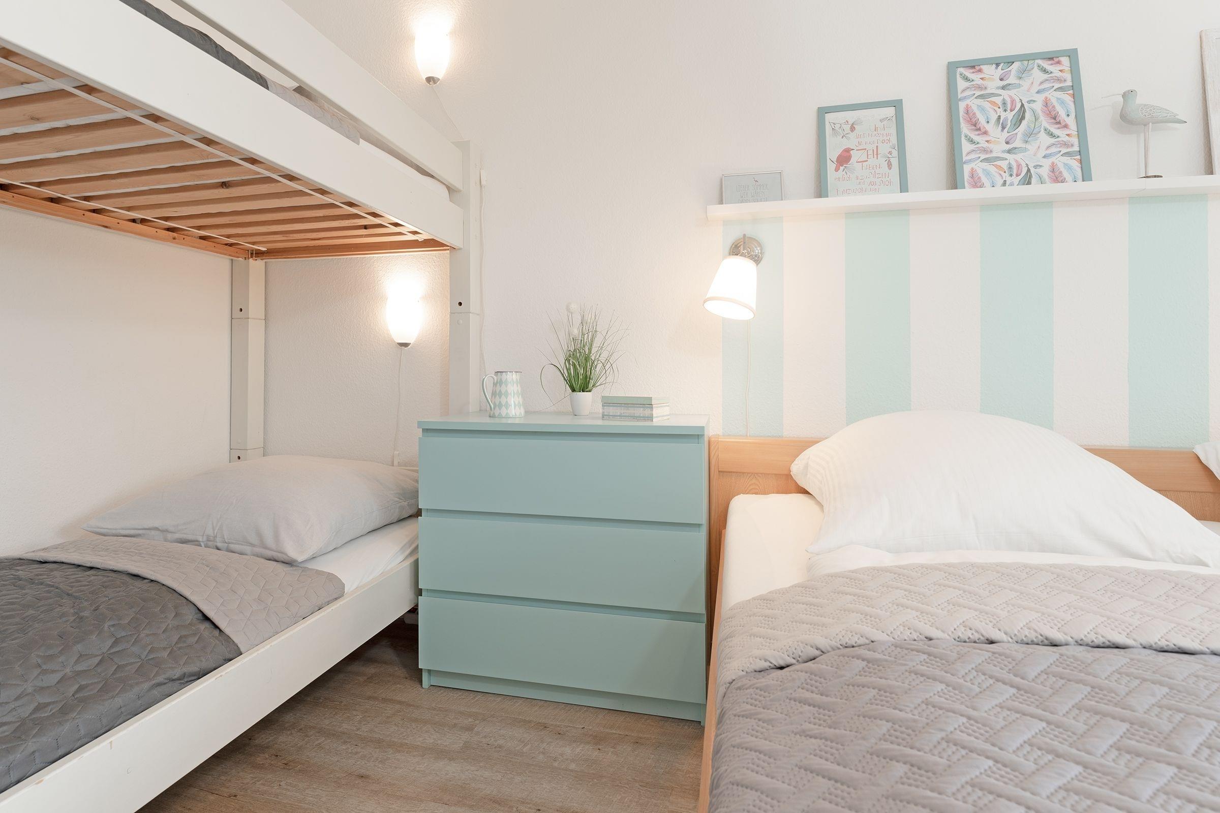 Schlafzimmer: 1 Doppelbett (200x200 cm) und 1 Etagenbett ( 2x 90x200 cm), Kleiderschrank