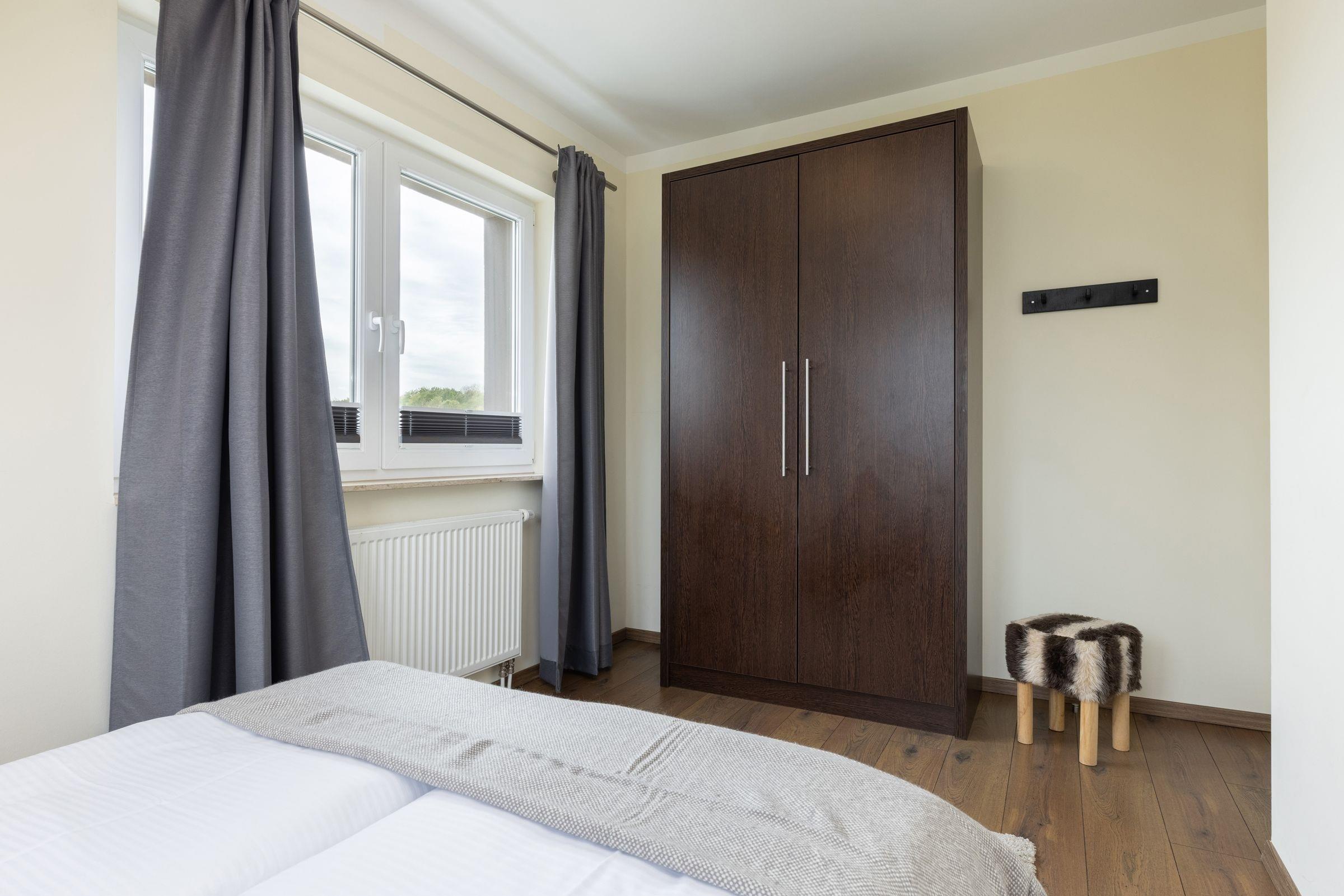 Schlafzimmer 1: 1 Doppelbett (2x 90x200 cm), Kleiderschrank, Verdunkelung (Plissees)