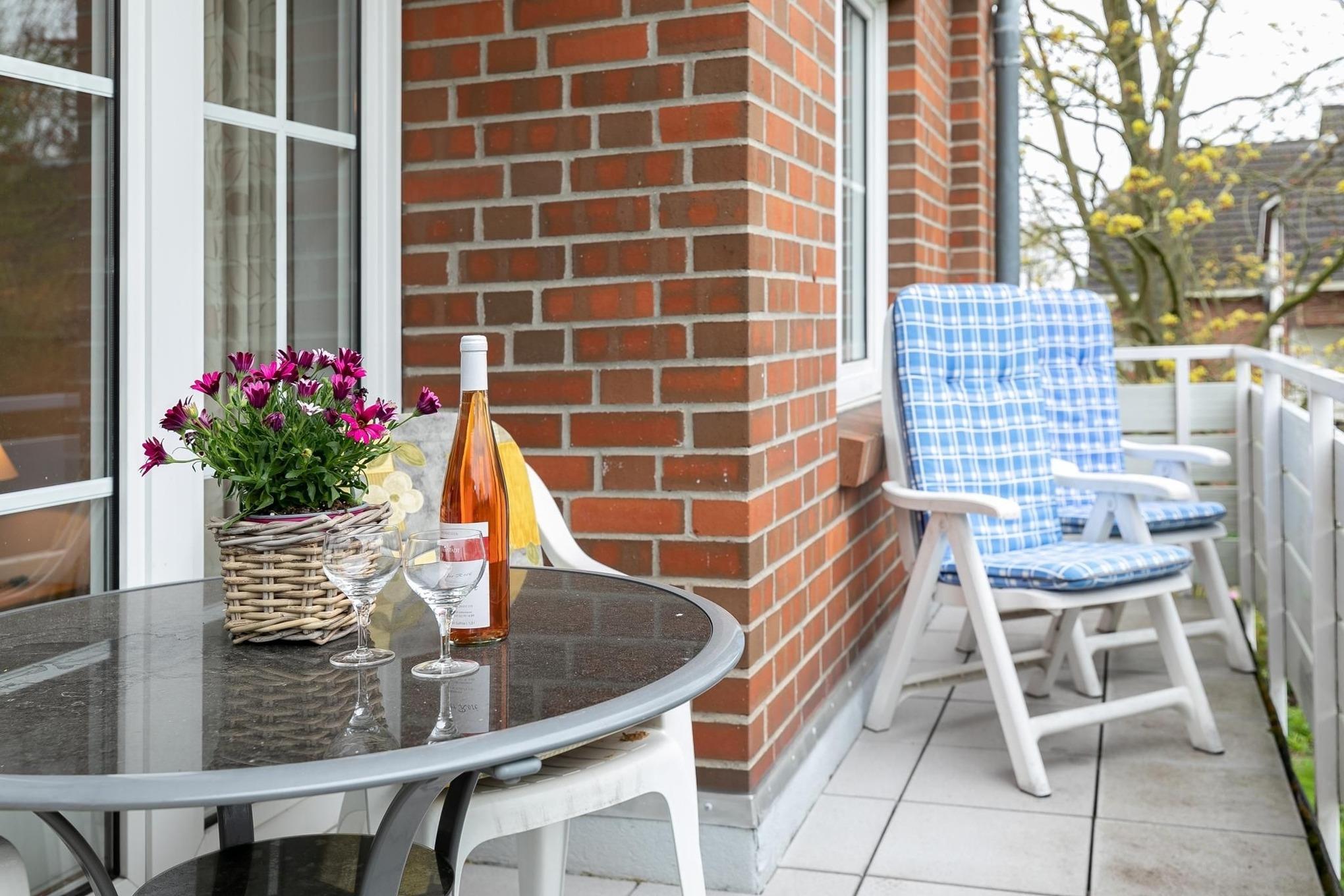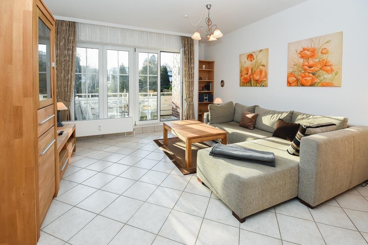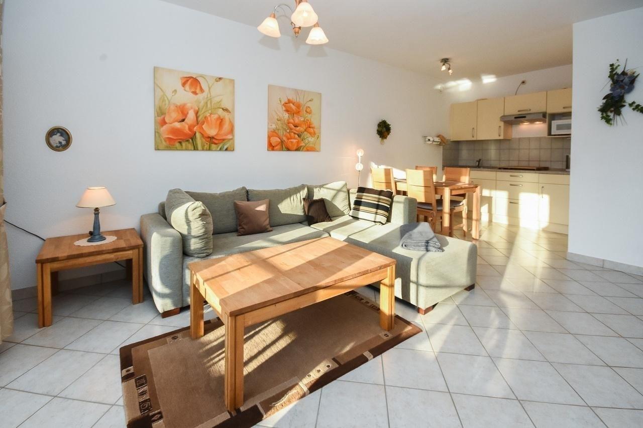 Dieses liebevoll eingerichtete 2-Zimmer-Appartement hat ca. 52 m² und bietet Platz für bis zu 3 Personen. Es ist modern und sehr geschmackvoll eingerichtet. Es gibt einen Schlafraum mit einem Doppelbett (2x 90x200 cm) und ein helles Duschbad. Im Wohnraum befinden sich eine Couchgarnitur mit Chaiselounge, welche zu einem Doppelbett (120x200 cm) ausgezogen werden kann, eine Musikanlage und ein LCD- TV. Die Küchenzeile ist ausgestattet mit Kühlschrank mit Gefrierfach, 4-Plattenherd,Mikrowelle, Kaffeemaschine, Wasserkocher und Toaster. Der Wohnraum verfügt über einen Esstisch. Der Balkon bietet eine schöne Ausrichtung in Richtung Sonne und verfügt über Gartenmöbel sowie eine Markise.