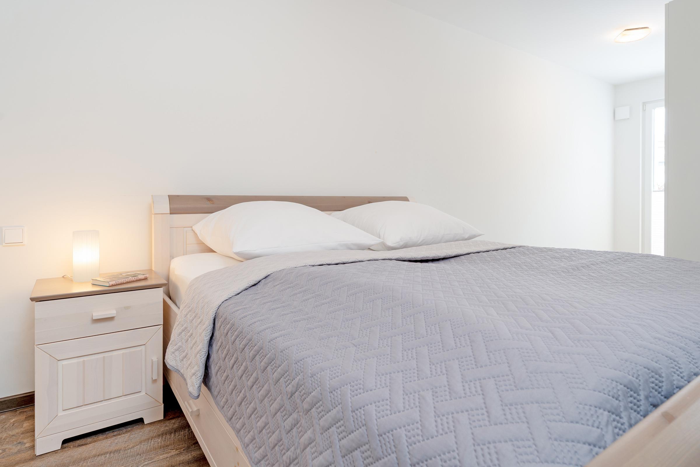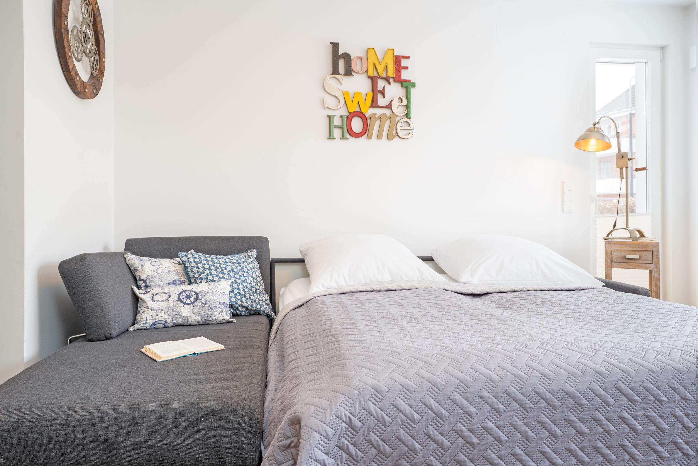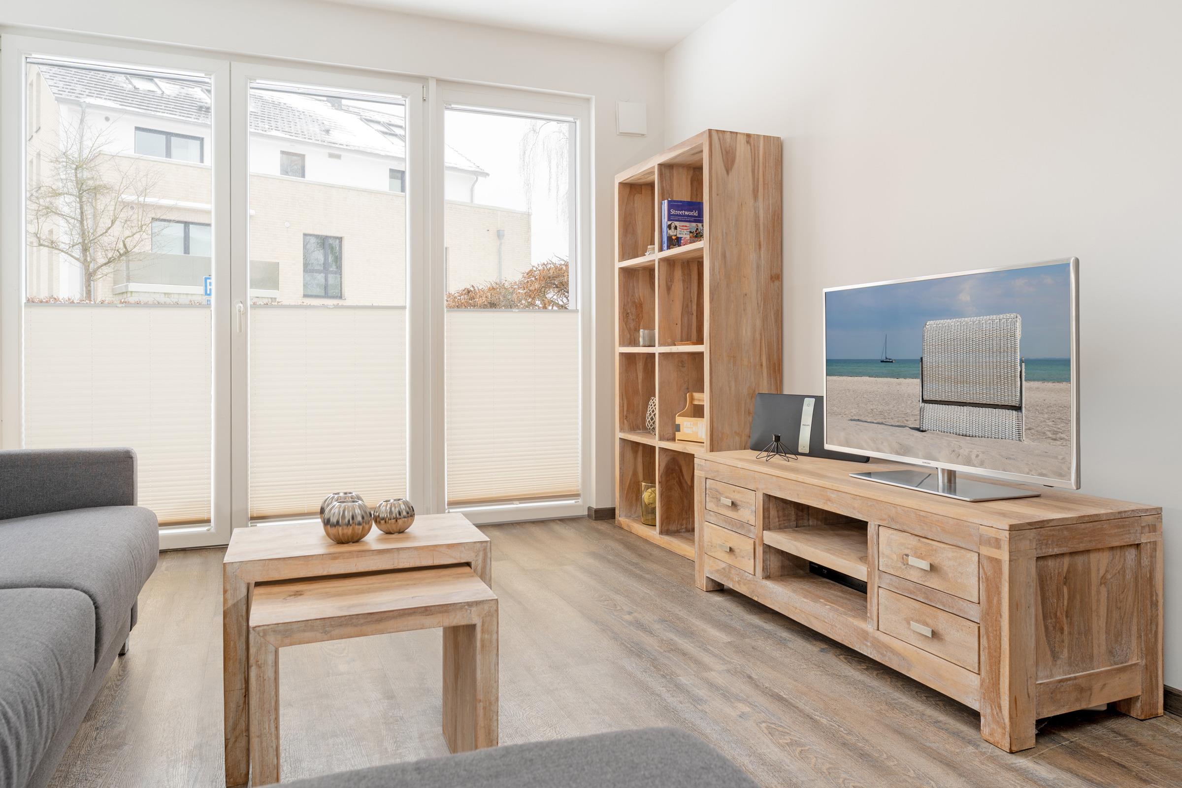 Ein heller Flur mit Garderobe empfängt Sie und führt in das modern eingerichtete Wohnzimmer. Hier können Sie loungige Abende auf Ihrer Couch genießen, um z.B. in Ruhe ein Buch zu lesen. Die Couch lässt sich mühelos zu einer Schlafgelegenheit (160x200 cm) verwandeln. Für gemütliche Abende sorgt eine Docking Station, Soundsystem Philips BM50B im Wohnzimmer und Badezimmer, Playstation 4 sorgt für Abwechslung und gemeinsame Spieleabende. Die offene Küche ist komplett ausgestattet und macht das Kochen zum Genuss. Ihr Bad ist eine Wellness-Wohlfühloase mit schöner Dusche, Handtuchwärmer, WC und Föhn. Im Bad steht Ihnen sogar eine Waschmaschine für die Wäsche zwischendurch zur Verfügung. Das Schlafzimmer ist mit einem Doppelbett (2x 90x200 cm) und einem weiteren Schrank für Ihre Garderobe versehen. Auch hier wurde an einen weiteren Flat- Screen-TV gedacht. Hier werden Ihre Urlaubsträume wahr und Sie wachen am Morgen erholt und gestärkt für das nächste Ostsee-Abenteuer auf. Ihre Wohlfühltemperatur können Sie über das Einstellen der Fußbodenheizung bestimmen. Die Terrasse, lädt dazu ein bei gutem Wetter das Frühstück zu genießen oder den Abend bei einem Glas Wein ausklingen zu lassen.