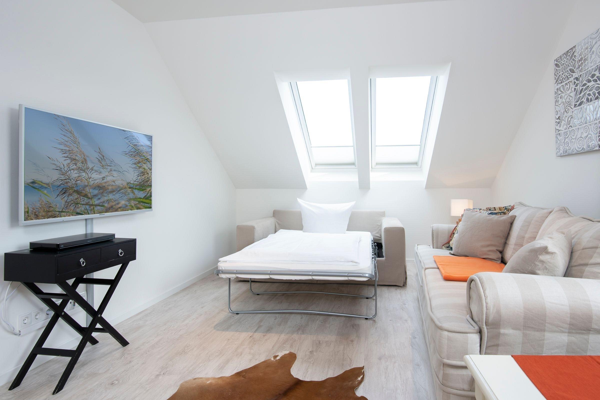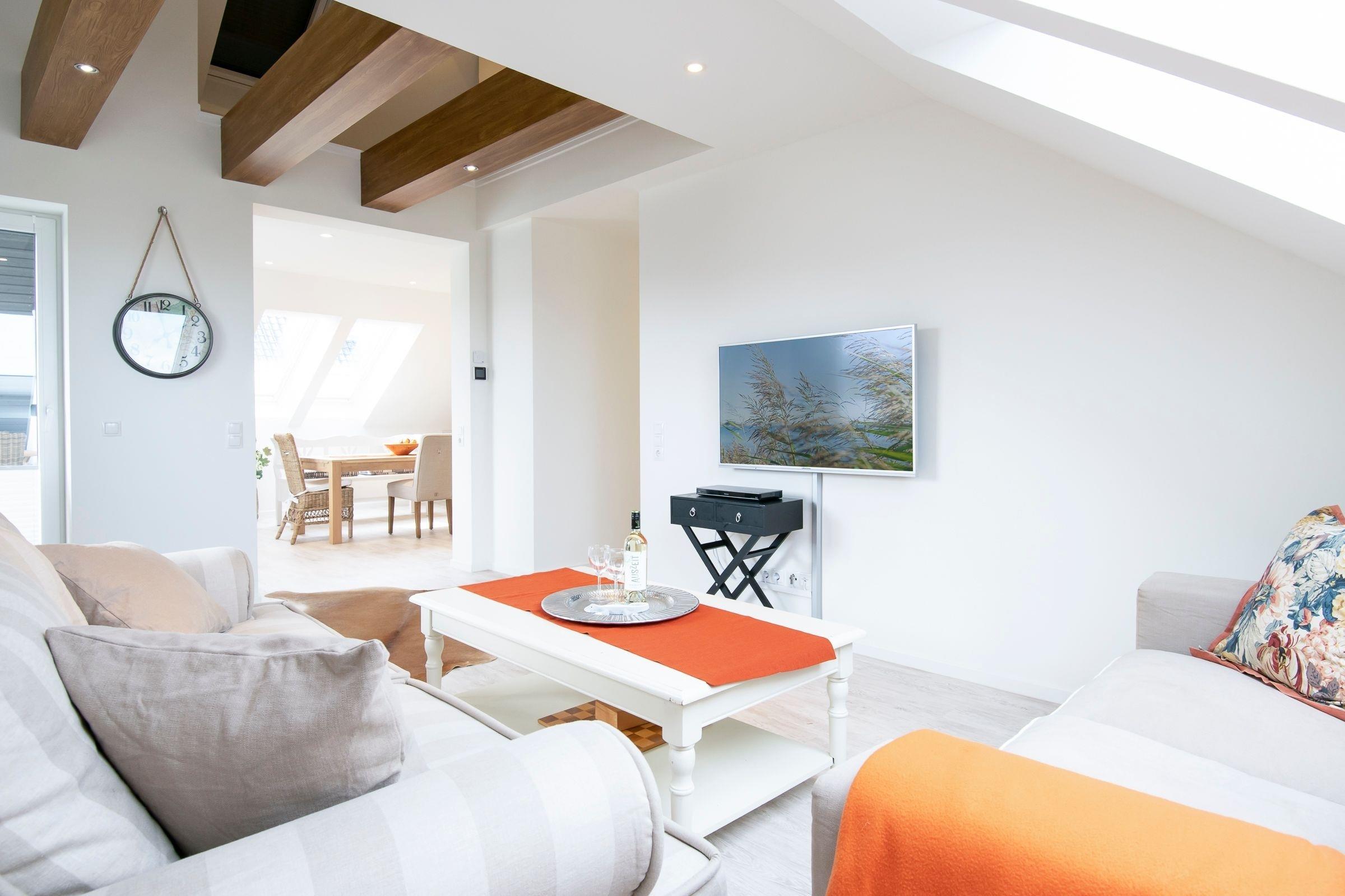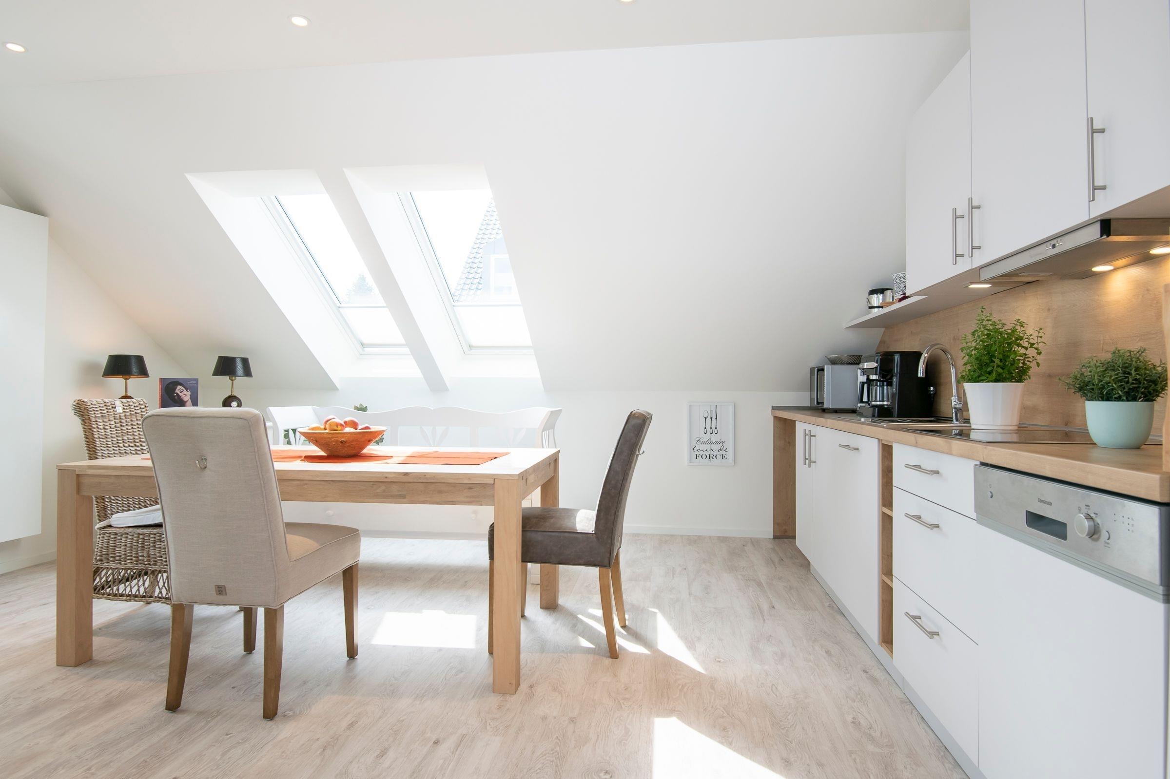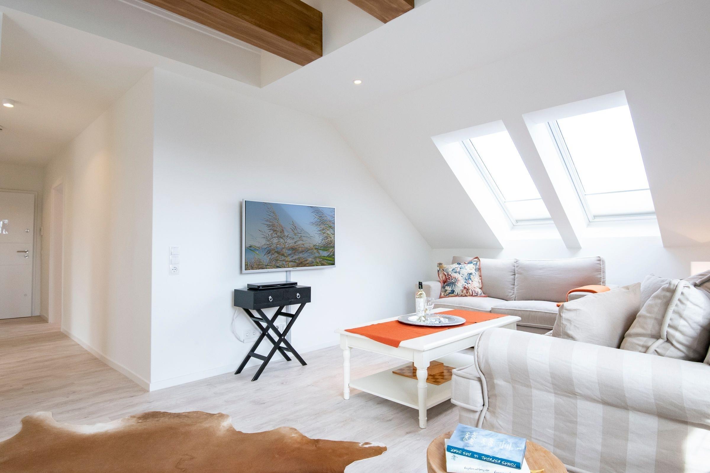 Gemütlich unter Dachschrägen begrüßt Sie das kuschelige Wohnzimmer mit hochwertiger Ausziehcouch (110x180 cm). Im separaten Schlafzimmer genießen Sie erholsame Nächte im komfortablen Boxspringbett (180x200 cm), ein Kleiderschrank nimmt Ihre Urlaubsgarderobe auf. Hell und großzügig schließt sich das stilvolle Designbad mit Annehmlichkeiten wie bodentiefer Wellnessdusche, Schminkspiegel und Fußbodenheizung dem überzeugenden Ambiente der Wohnung an. Die offene Küche ist toll ausgestattet, sodass Ihrem selbst kreierten Urlaubsdinner nichts im Wege steht. Hier helfen Annehmlichkeiten wie Cerankochfeld, Spülmaschine und Backofen in praktischer Arbeitshöhe. Die hochwertige Kaffeemaschine von De'Longhi sorgt für den täglichen Kaffeegenuss. Der großzügige Essbereich ist ideal für gesellige Frühstücksrunden oder ein heiteres Dinner mit Freunden. Ein direkter Zugang führt zum überdachten, hochwertig möblierten Balkon. Genießen Sie hier eine wunderbare Ruhe, mit Aussicht ins Grüne und auch ein Hauch von Ostsee schimmert in der Ferne. Ideal zum Durchatmen, Erholung pur!