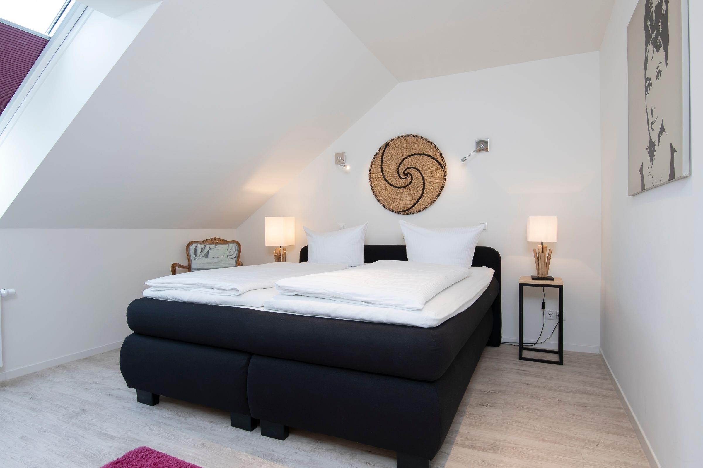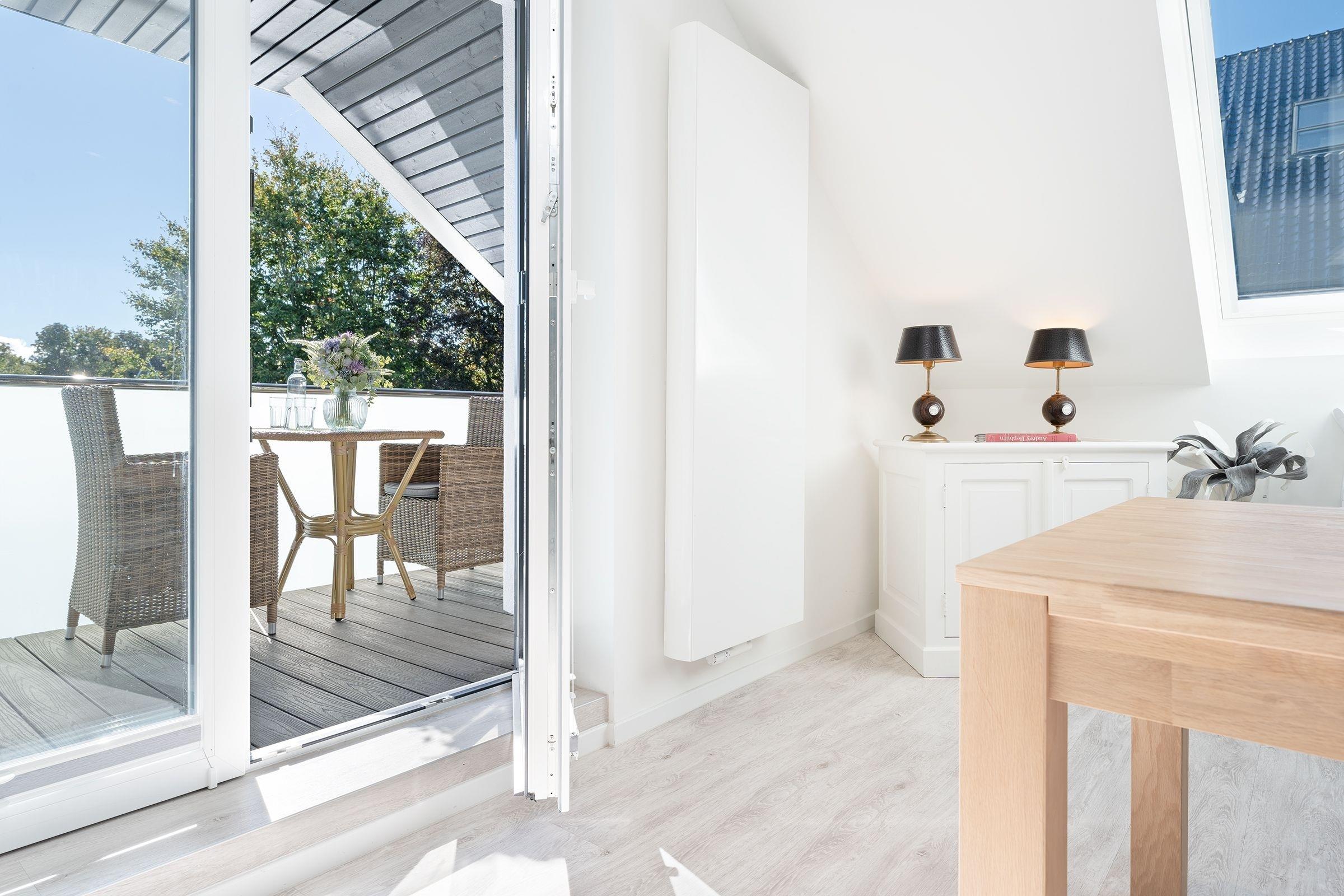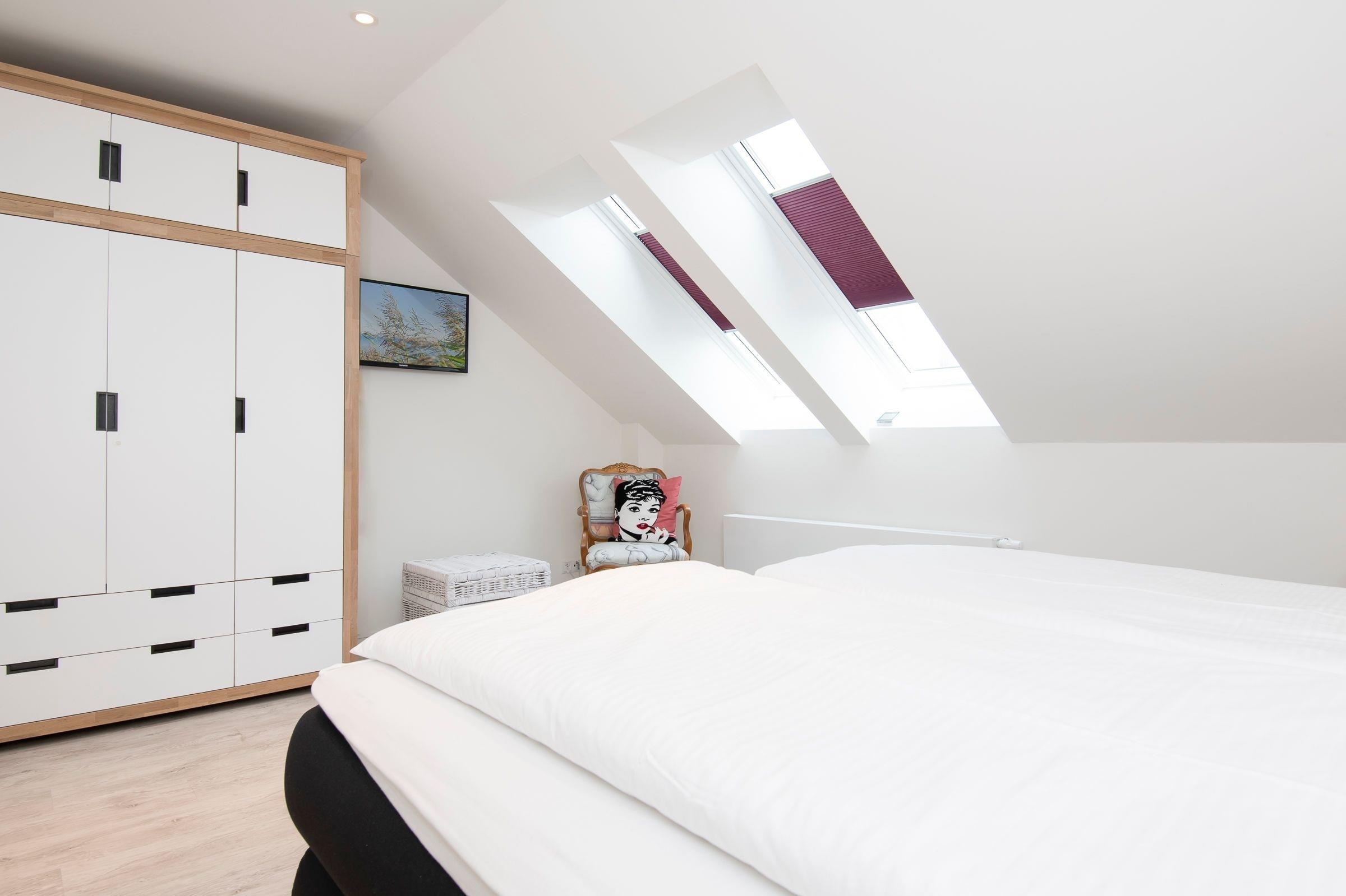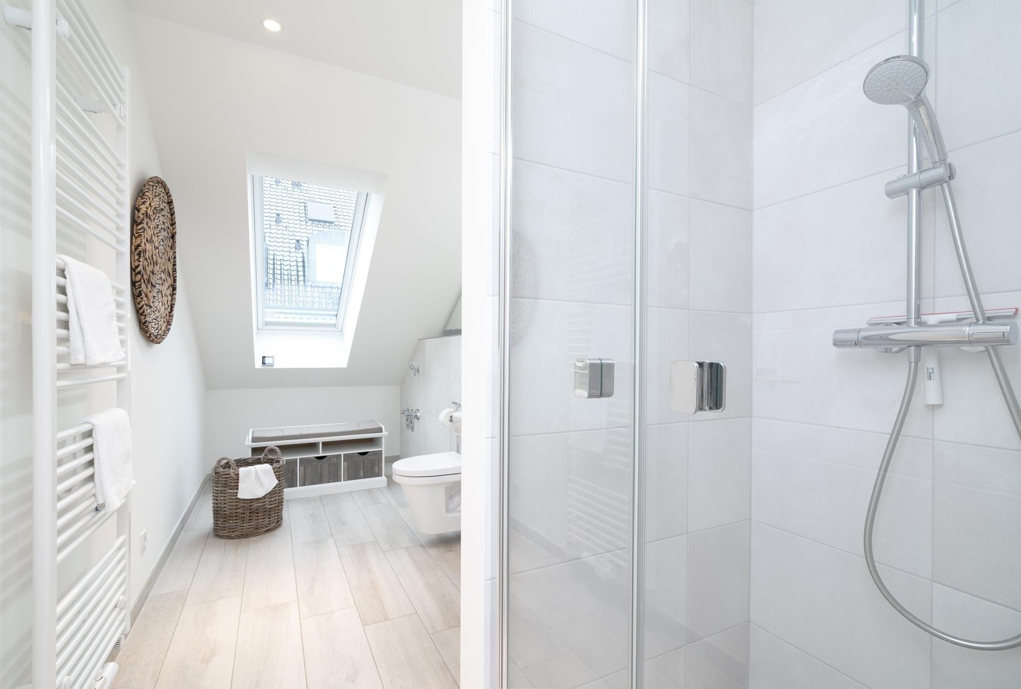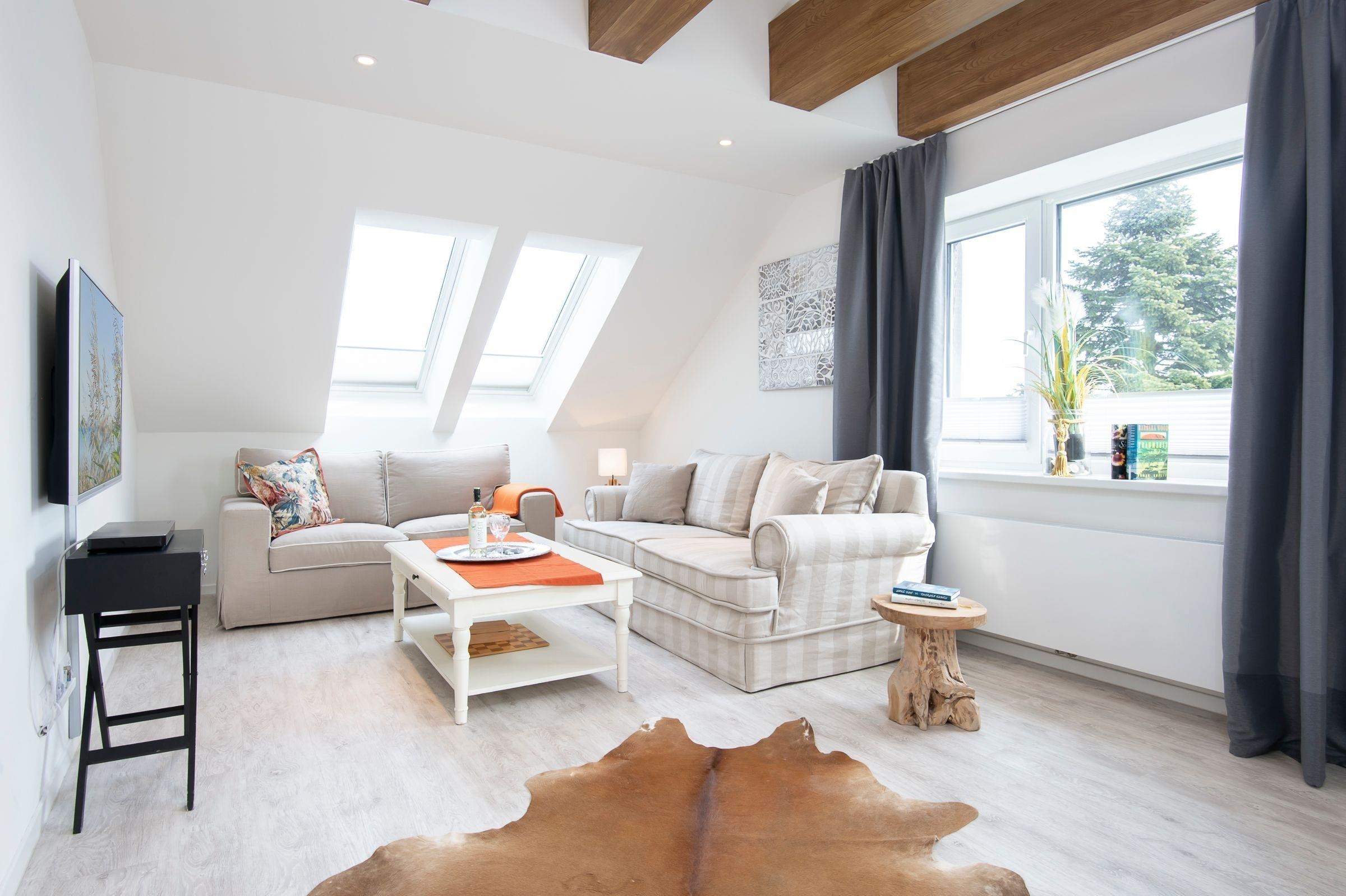 Gemütlich unter Dachschrägen begrüßt Sie das kuschelige Wohnzimmer mit hochwertiger Ausziehcouch (110x180 cm). Im separaten Schlafzimmer genießen Sie erholsame Nächte im komfortablen Boxspringbett (180x200 cm), ein Kleiderschrank nimmt Ihre Urlaubsgarderobe auf. Hell und großzügig schließt sich das stilvolle Designbad mit Annehmlichkeiten wie bodentiefer Wellnessdusche, Schminkspiegel und Fußbodenheizung dem überzeugenden Ambiente der Wohnung an. Die offene Küche ist toll ausgestattet, sodass Ihrem selbst kreierten Urlaubsdinner nichts im Wege steht. Hier helfen Annehmlichkeiten wie Cerankochfeld, Spülmaschine und Backofen in praktischer Arbeitshöhe. Die hochwertige Kaffeemaschine von De'Longhi sorgt für den täglichen Kaffeegenuss. Der großzügige Essbereich ist ideal für gesellige Frühstücksrunden oder ein heiteres Dinner mit Freunden. Ein direkter Zugang führt zum überdachten, hochwertig möblierten Balkon. Genießen Sie hier eine wunderbare Ruhe, mit Aussicht ins Grüne und auch ein Hauch von Ostsee schimmert in der Ferne. Ideal zum Durchatmen, Erholung pur!