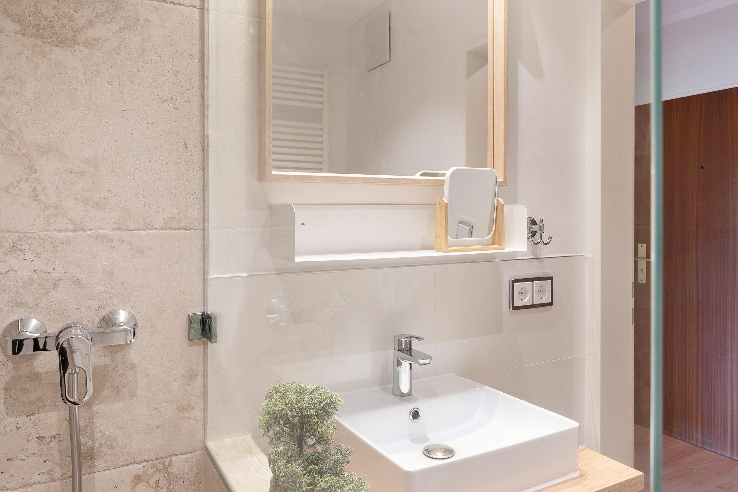 Im Wohnraum befindet sich eine Couch, die bei Bedarf zu einer weiteren Schlafmöglichkeit (140x200 cm) ausgeklappt werden kann, eine Musikanlage und ein Flachbild-TV. Die moderne integrierte Küchenzeile ist mit vielen Annehmlichkeiten ausgestattet, zudem lädt der großzügige Esstisch zu gemeinsamen Mahlzeiten oder Spieleabenden ein. Relaxen Sie auf dem angrenzenden Balkon, nehmen Platz auf den bequemen Gartenmöbeln und lassen Sie den Blick ins Grüne schweifen. Das Schlafzimmer verfügt über ein Doppelbett (2x 90x200 cm), zur Nacht können Sie das Zimmer mit einem Rollo angenehm abdunkeln. Von hier aus gelangen Sie auf den zweiten, kleineren Südost-Balkon, von dem Sie sogar einen Blick auf die Ostsee erhaschen können. Das moderne Duschbad verspricht einen guten Start in den Tag.