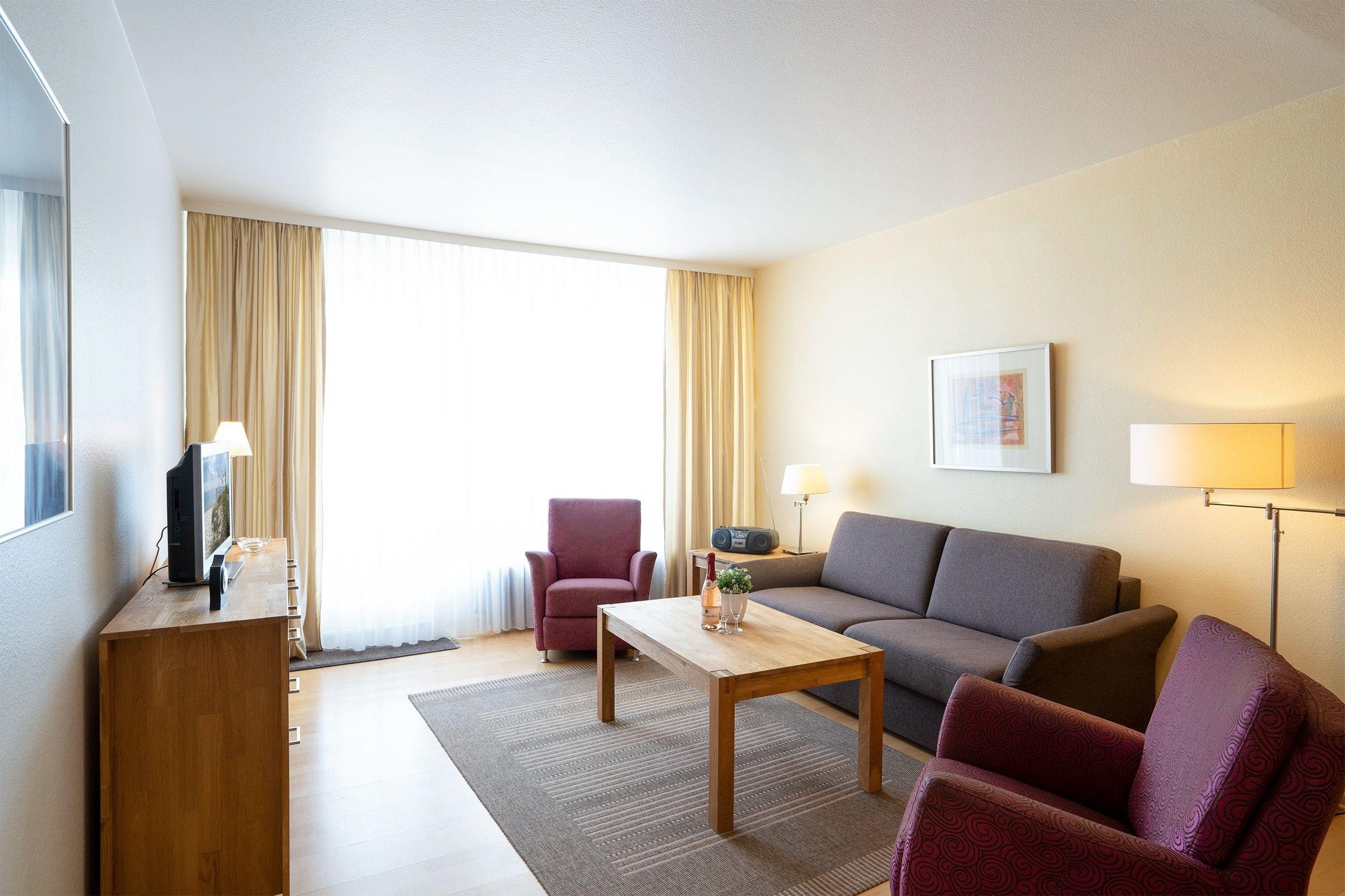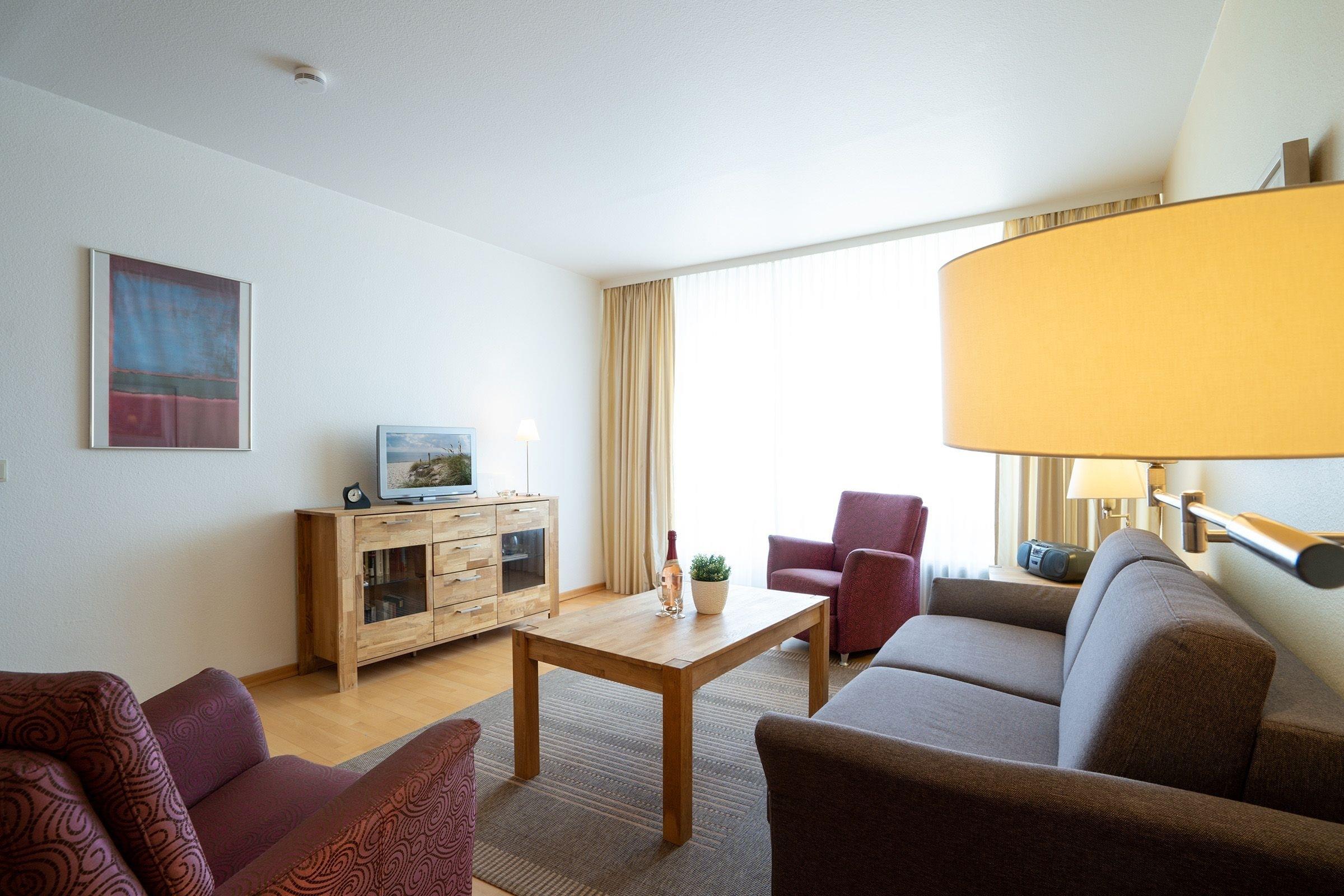 Mit offenem Wohn-/Schlafbereich und integrierter Küche, Duschbad, separatem Schlafzimmer und Balkon mit seitlichem Meerblick liegt diese Wohnung nur wenige Meter von der Ostsee entfernt. Das komfortable Schlafsofa im Wohnzimmer bietet einen Schlafplatz für bis zu 2 Personen (Liegefläche ca. 160x200 cm). Das Schlafzimmer ist mit bequemem Doppelbett (2x 90x200 cm) und Kleiderschrank ausgestattet. Machen Sie es sich auf Ihrem möblierten Balkon gemütlich und lassen dort entspannt Ihre Urlaubstage ausklingen und eine frische Ostseebrise um die Nase wehen - Schön, so ein Urlaub am Meer!