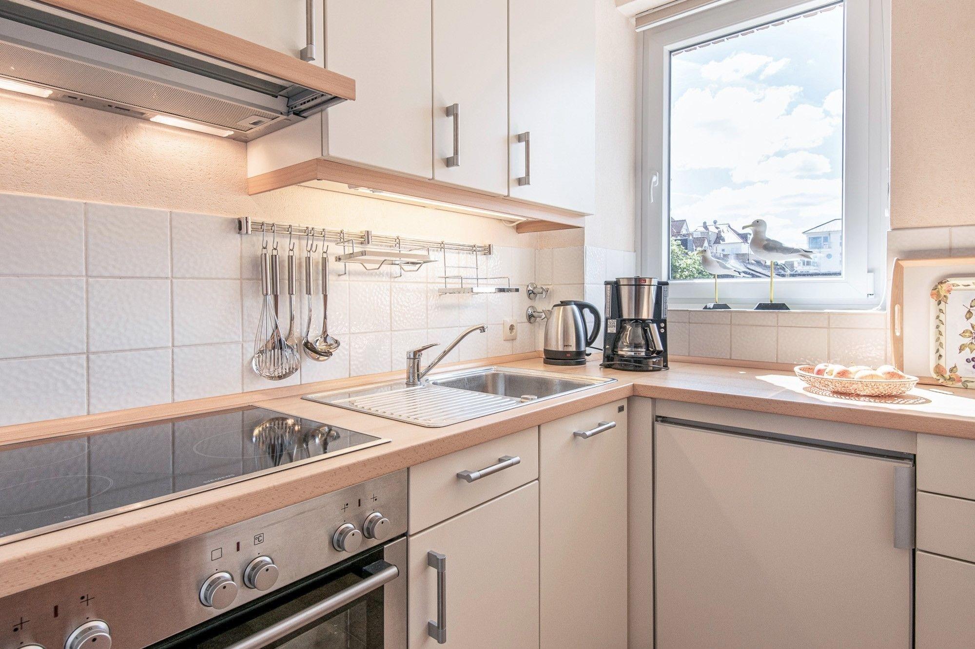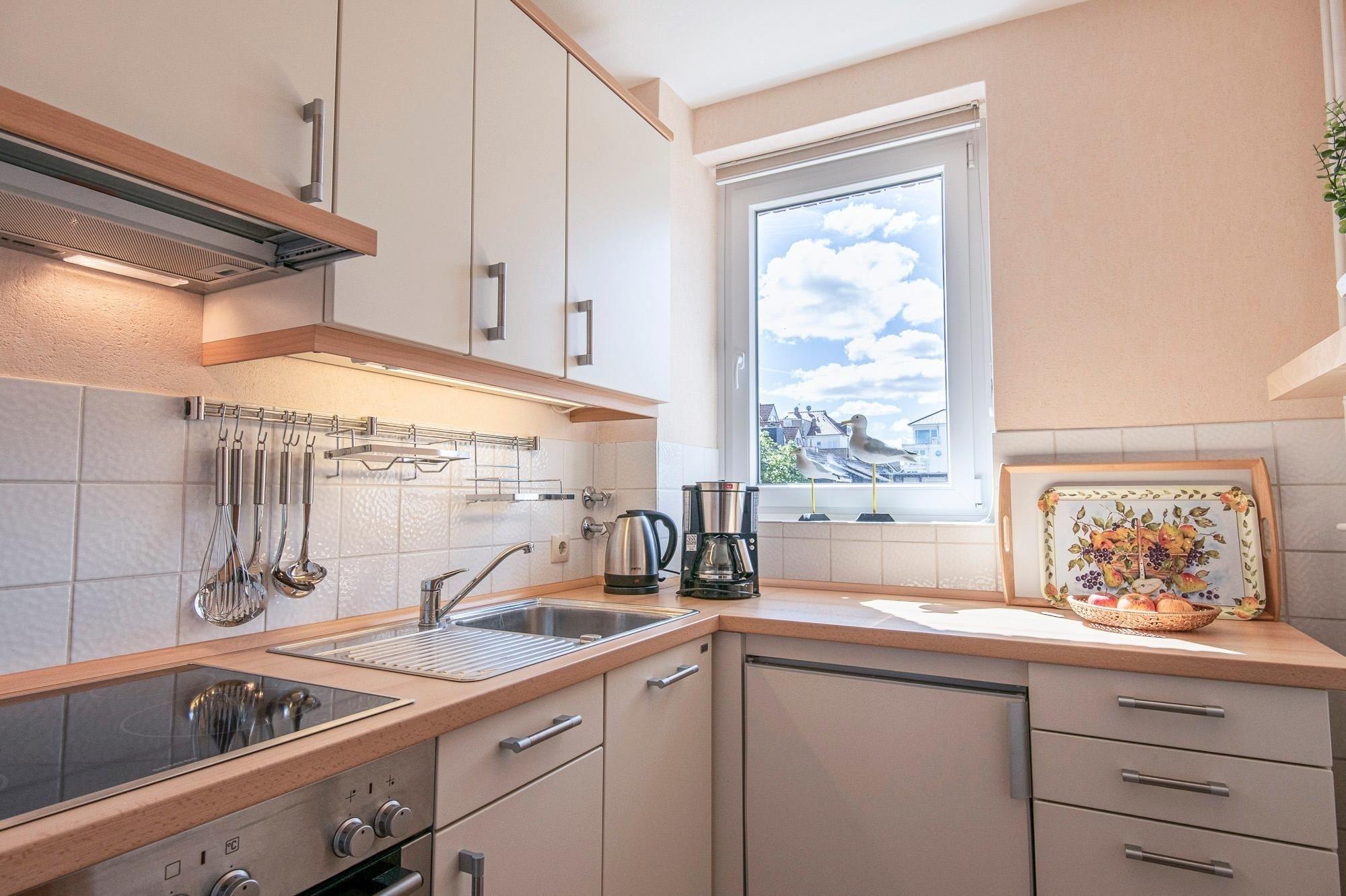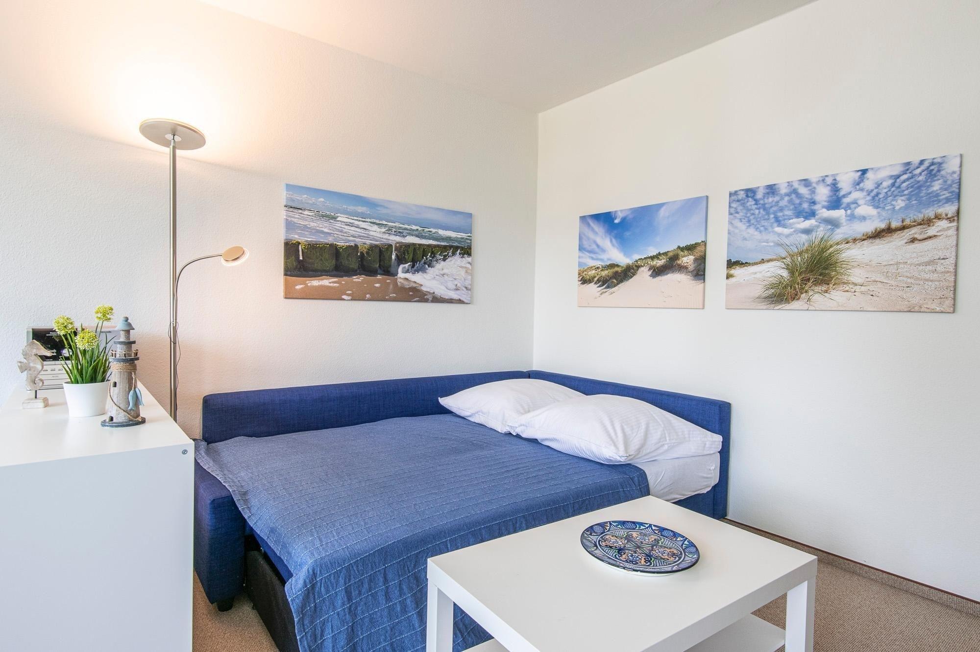 Das helle Wohnzimmer mit Schlafsofa (140x200 cm) und direkter Anbindung an den möblierten Balkon lädt zum Verweilen und Entspannen ein. Ausgestattet mit 102cm Full-HD Blaupunkt-TV, CD-Player und Radio. Für regenerierende Nächte sorgt das gemütliche Schlafzimmer mit Doppelbett (160x200 cm) und Verdunklungsgardinen. Nach dem Besuch beim regionalen Fischhändler lassen sich die frischen Ostseedelikatessen, in der separaten Küche zu leckeren Gerichten verarbeiten. Im modernen Badezimmer mit barrierefreier Dusche, beheizbarem Handtuchheizkörper und Föhn starten Sie erfrischt in den neuen Urlaubstag.