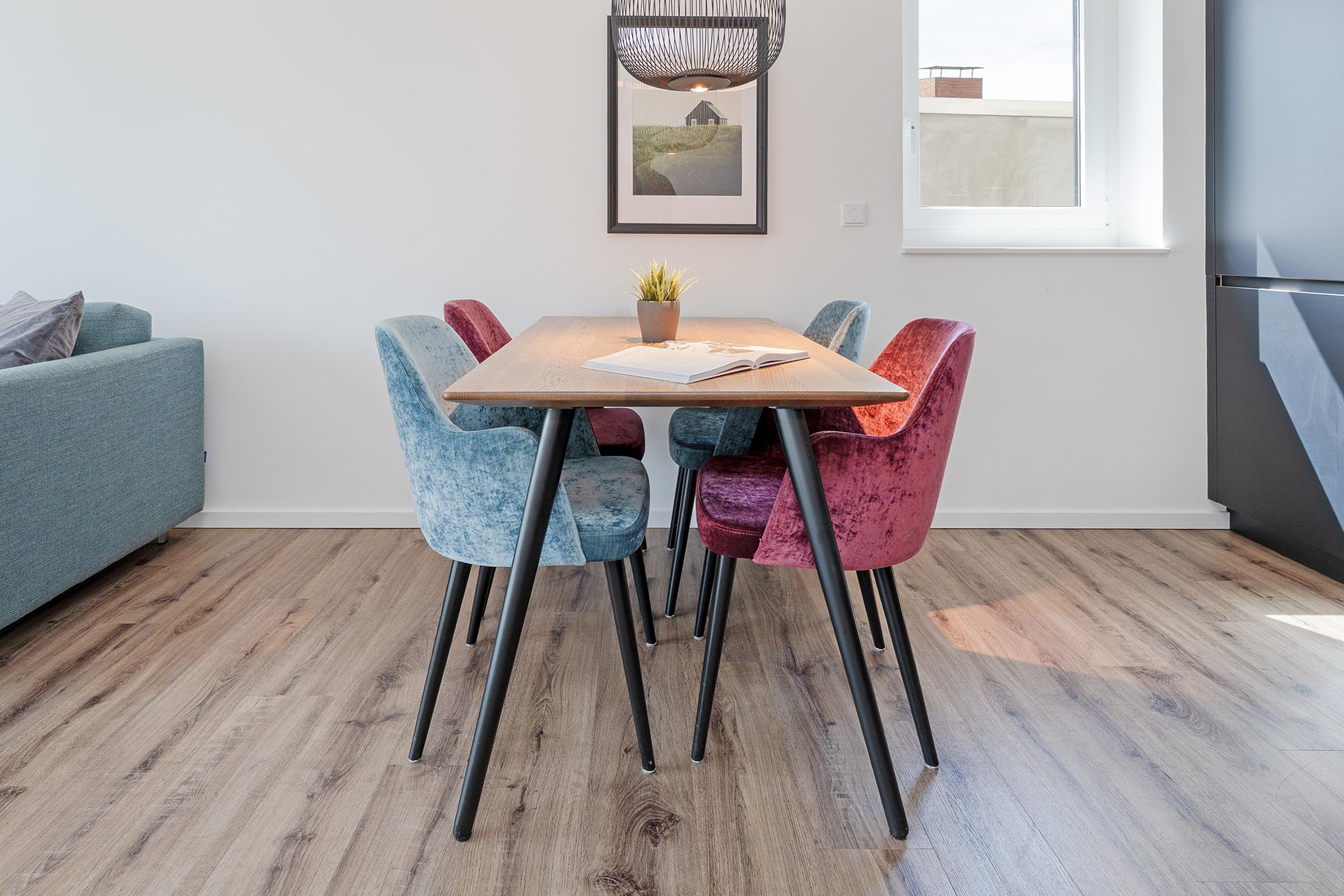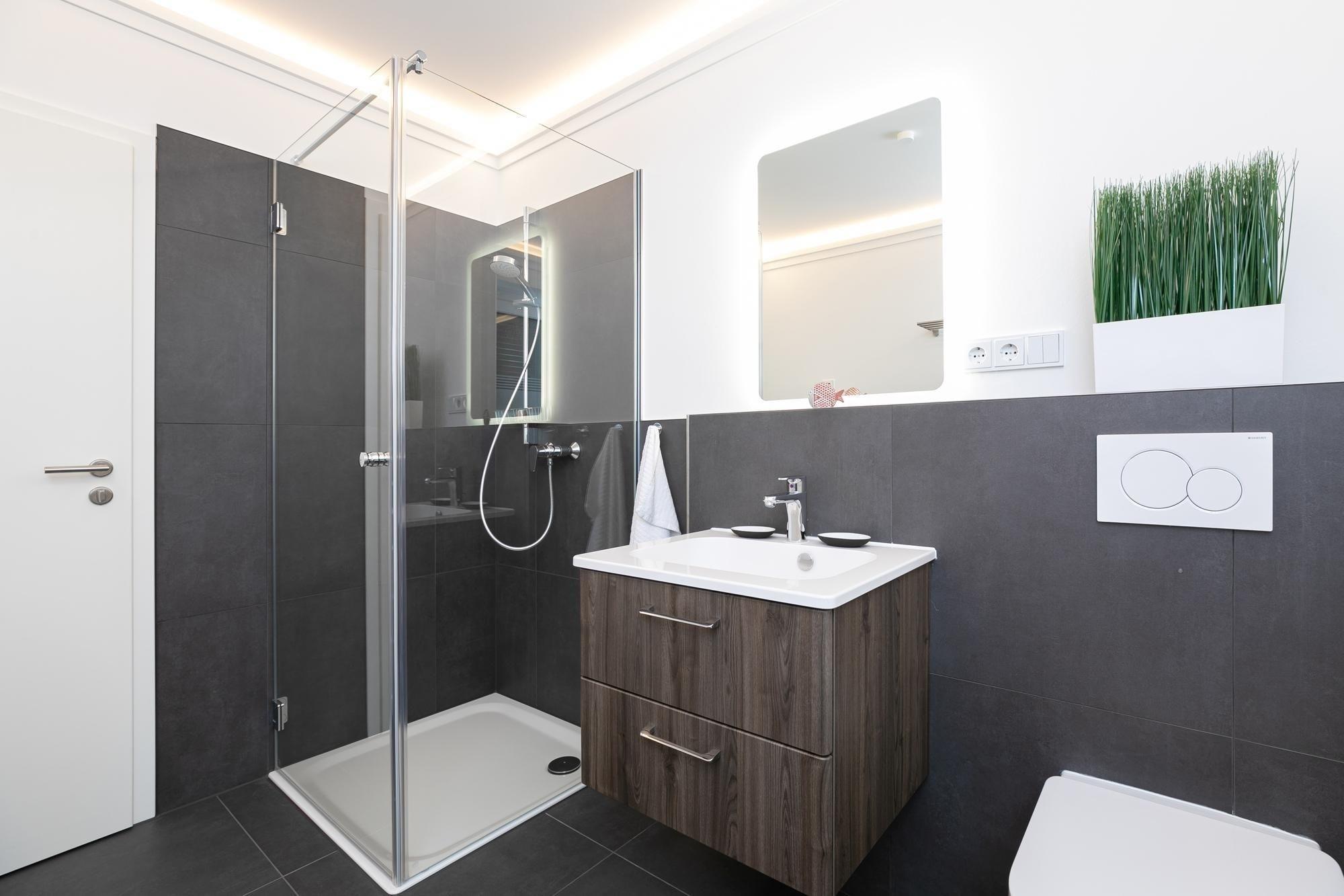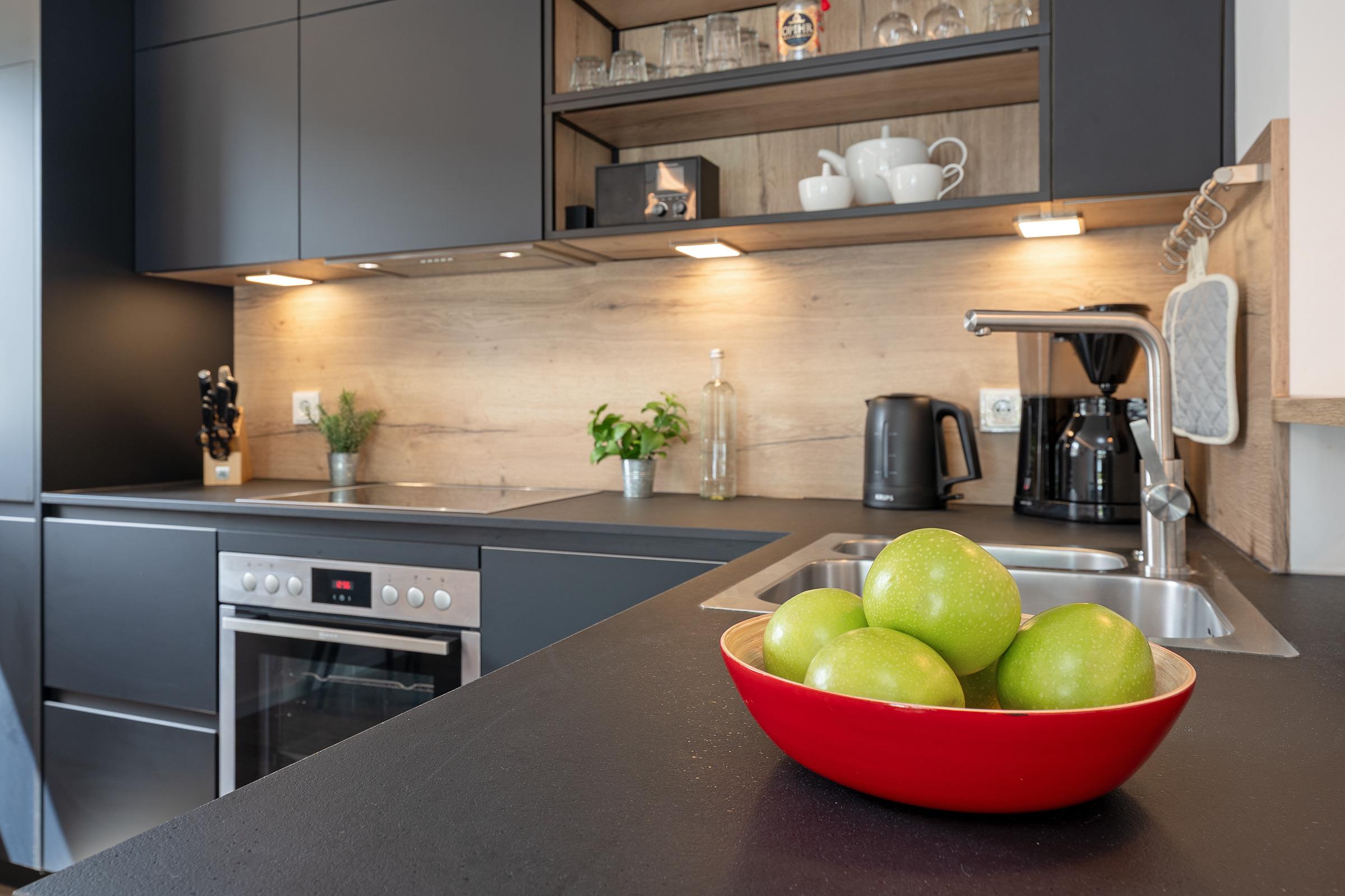 Durch die harmonischen Wandfarben und das dimmbare Voute Lichtkonzept wirken Flur und Wohnbereich besonders großzügig. Eine Schlafcouch (160x200 cm) und Smart-TV laden im Wohnzimmer zu gemütlichen Abenden ein. Eine offene moderne Küchenzeile mit 4-Feld-Induktionsherd und Backofen, Kühlschrank mit Gefrierfach, Spülmaschine, Kaffeemaschine, Toaster, Wasserkocher und hinter einer Küchenfront verstecktem Waschtrockner sowie eine Essecke runden diesen Mittelpunkt der Wohnung ab. Vom Wohnzimmer aus gelangen Sie auch auf den möblierten Balkon in Süd-Ost Ausrichtung, auf dem Sie die Sonnenstunden optimal ausnutzen können. Im Schlafzimmer mit Smart-TV verlockt ein Doppelbett (2x 90x200 cm, 2 unterschiedliche Härtegrade) zu erholsamen Nächten. Für Ihre Urlaubsgarderobe ist im Schiebetürenschrank genug Platz vorhanden. Auch das Tageslicht-Bad kann in dieser Wohnung mit Design punkten und verfügt über eine bodentiefe Dusche, Fön, WC und Schminkspiegel. In der gesamten Ferienwohnung sorgt eine Fußbodenheizung für wohlige Wärme. Zur Nachtruhe verdunkeln Sie die Wohnung mit elektrischen Außenjalousien.