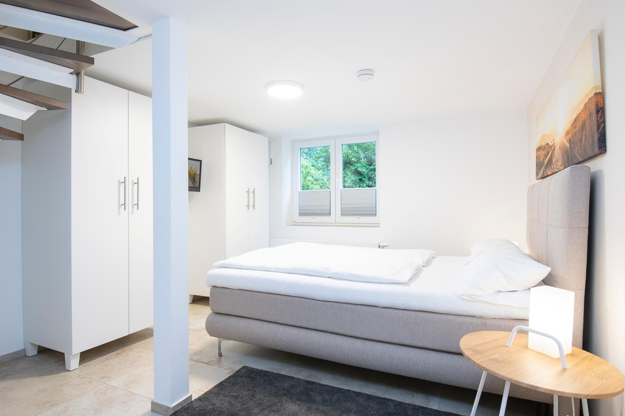 Schlafzimmer 2 (UG): 1 Boxspringbett (140x200 cm), Kleiderschrank, TV, Verdunkelung (Plissees)