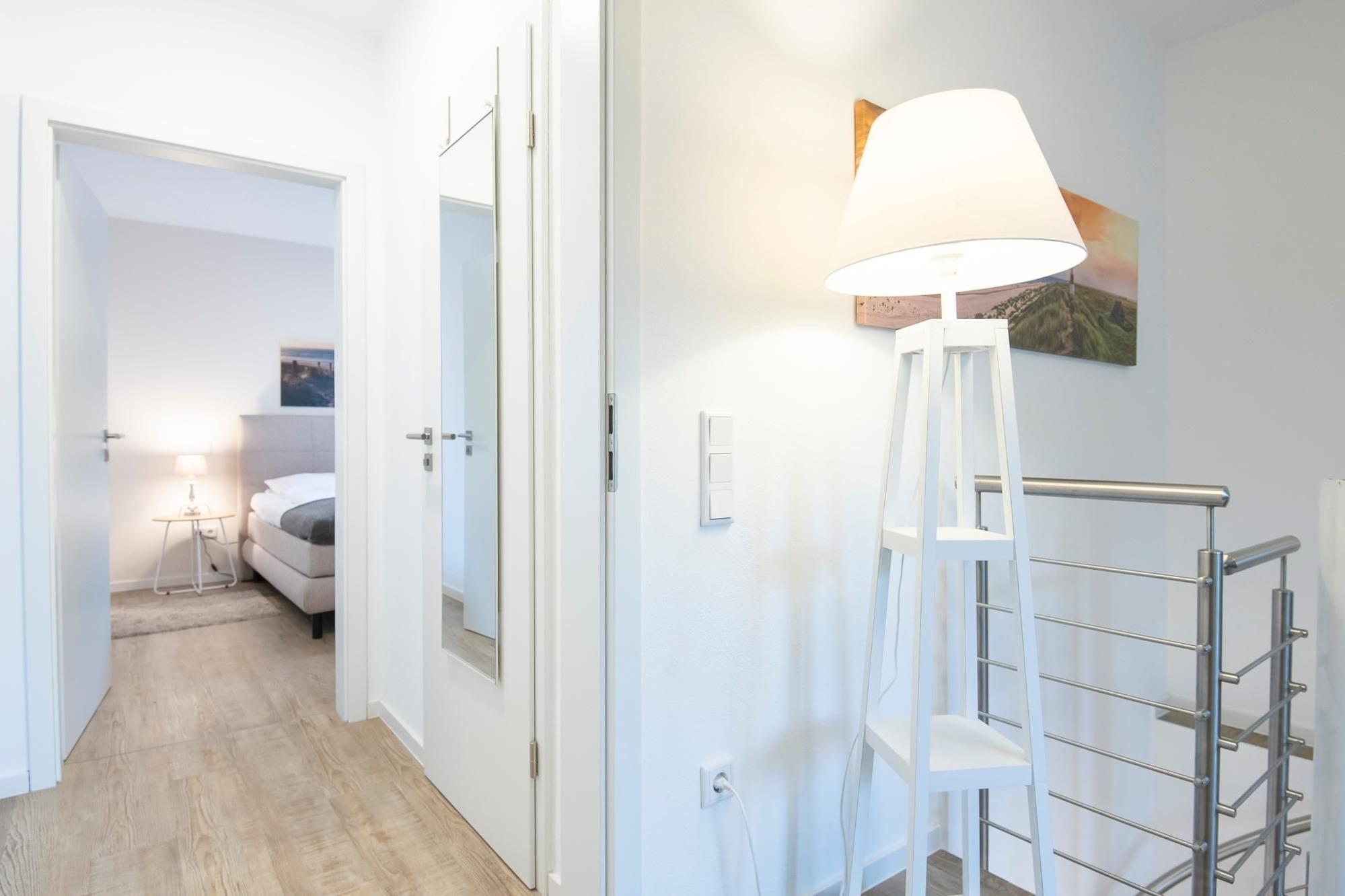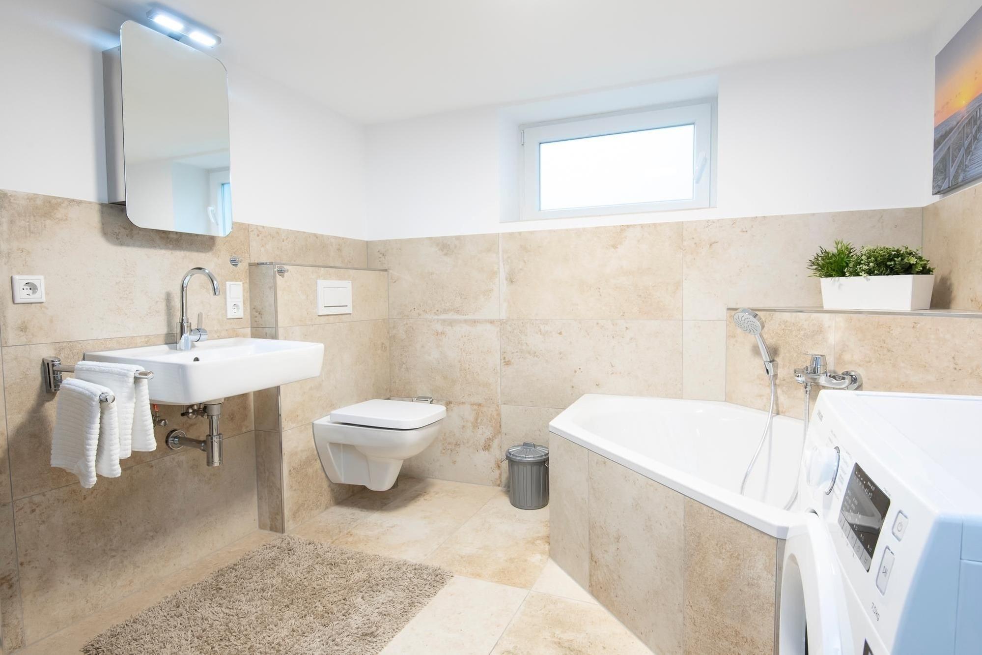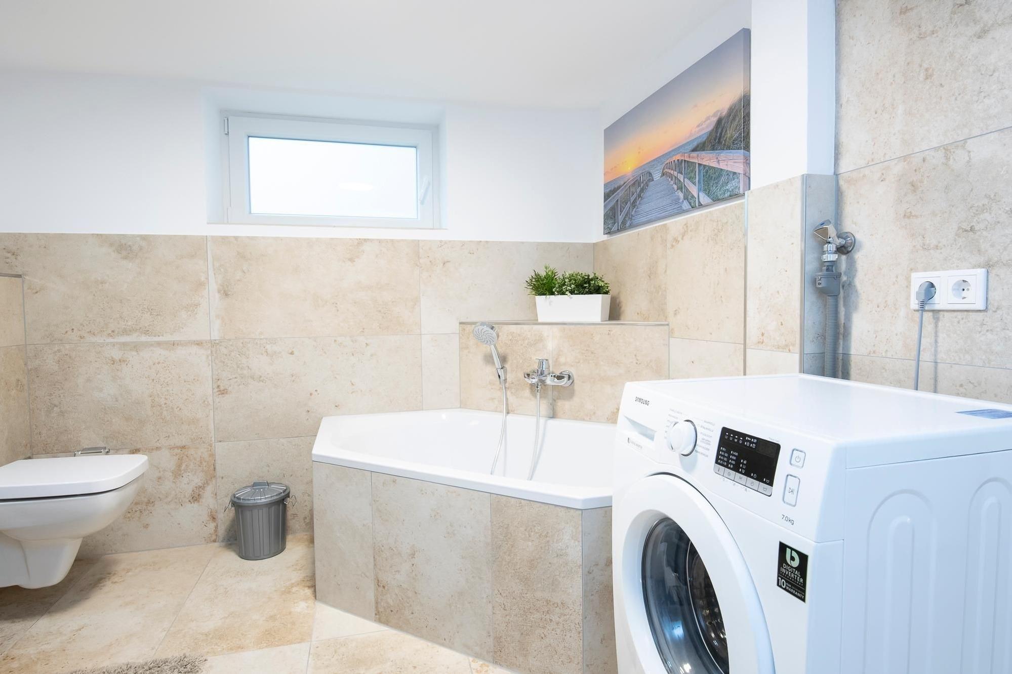 Der stilvolle, offene Wohn-/Ess- und Kochbereich überzeugt mit freundlichen Farben und maritimem Stil. Nehmen Sie Platz auf dem gemütlichen Sofa und lassen Sie die Abende vor dem Flachbild-TV ausklingen. Über den kostenlosen WLAN-Anschluss bleiben Sie mit Ihren Lieben daheim in Kontakt. Die moderne, voll ausgestattete Küche wird Sie ebenfalls begeistern und die Familie kann sich die selbst zubereiteten Köstlichkeiten am großzügigen Esstisch schmecken lassen. Lauschige Abende können Sie genussvoll auf der schönen, möblierten Terrasse bei einem Glas Wein an der guten Ostseeluft ausklingen lassen. Bei Sonnenschein können Sie es sich mit einem guten Buch auf den Sonnenliegen bequem machen, ein Schirm spendet bei Bedarf Schatten. Im Erdgeschoss befindet sich außerdem eines der beiden Schlafzimmer, das Ihnen mit einem herrlichen Boxspringbett (180x200 cm) traumhafte Nächte bereiten wird. Bei Bedarf unterhält Sie ein weiterer Flat-TV und Ihre Urlaubsgarderobe verstauen Sie im Kleiderschrank. Nach einer erfrischenden Dusche im Bad können Sie voll Energie in einen neuen Urlaubstag starten. Über eine Wendeltreppe gelangen Sie in das zweite Schlafzimmer im Untergeschoss. Auch hier erwartet Sie ein bequemes Boxspringbett (140x200 cm) mit Flat-TV und einem geräumigen Badezimmer, das mit Badewanne, Dusche und Waschmaschine punkten kann. Besonderes Highlight dieser Wohnung ist die eigene Sauna, in der Sie entspannen können.