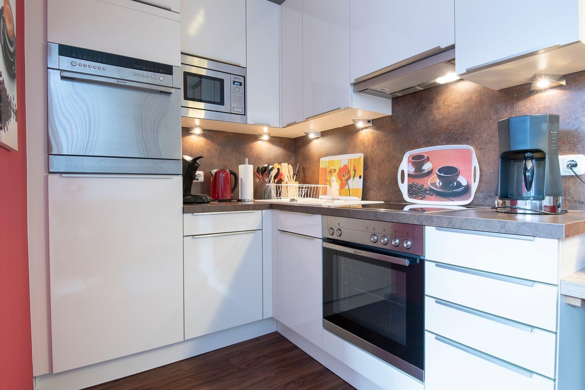 Durch einen kleinen Flur, der Platz für Ihre Garderobe bietet, betreten Sie den geschmackvollen Wohn- und Essbereich mit offener Küche. Legen Sie die Füße hoch und relaxen Sie auf dem komfortablen Sofa. Für Unterhaltung sorgen ein Flachbild-TV und der kostenlose WLAN-Anschluss, über den Sie Ihre Playlist mit Ihrer Lieblingsmusik abspielen können. Für gemeinsame Spieleabende oder ausgiebige Mahlzeiten steht ein Esstisch bereit. Die direkt angrenzende Küche ist mit allem ausgestattet, um Ihre Liebsten im Urlaub mit schmackhaften Köstlichkeiten zu verwöhnen. Vielleicht möchten Sie Ihr Frühstück an der frischen Ostseeluft genießen? Auf dem möblierten Balkon mit Süd-West-Ausrichtung schmecken der frische Morgenkaffee und die Brötchen vom Bäcker um die Ecke gleich nochmal so gut. Strandluft macht müde - für erholsamen Schlaf ziehen Sie sich ins separate Schlafzimmer mit gemütlichem Boxspringbett (180x200 cm) und Kleiderschrank zurück. Zum Einschlafen können Sie nochmal durch das Fernsehprogramm zappen. Die Kinder machen es sich in einem eigenen kleinen Schlafzimmer mit ausklappbarem Schlafsofa (140x200 cm) und eigenem TV gemütlich. Die Schlafzimmer lassen sich zur Nachtruhe mit Jalousien angenehm abdunkeln. Das hochwertige Duschbad lässt keine Wünsche offen.