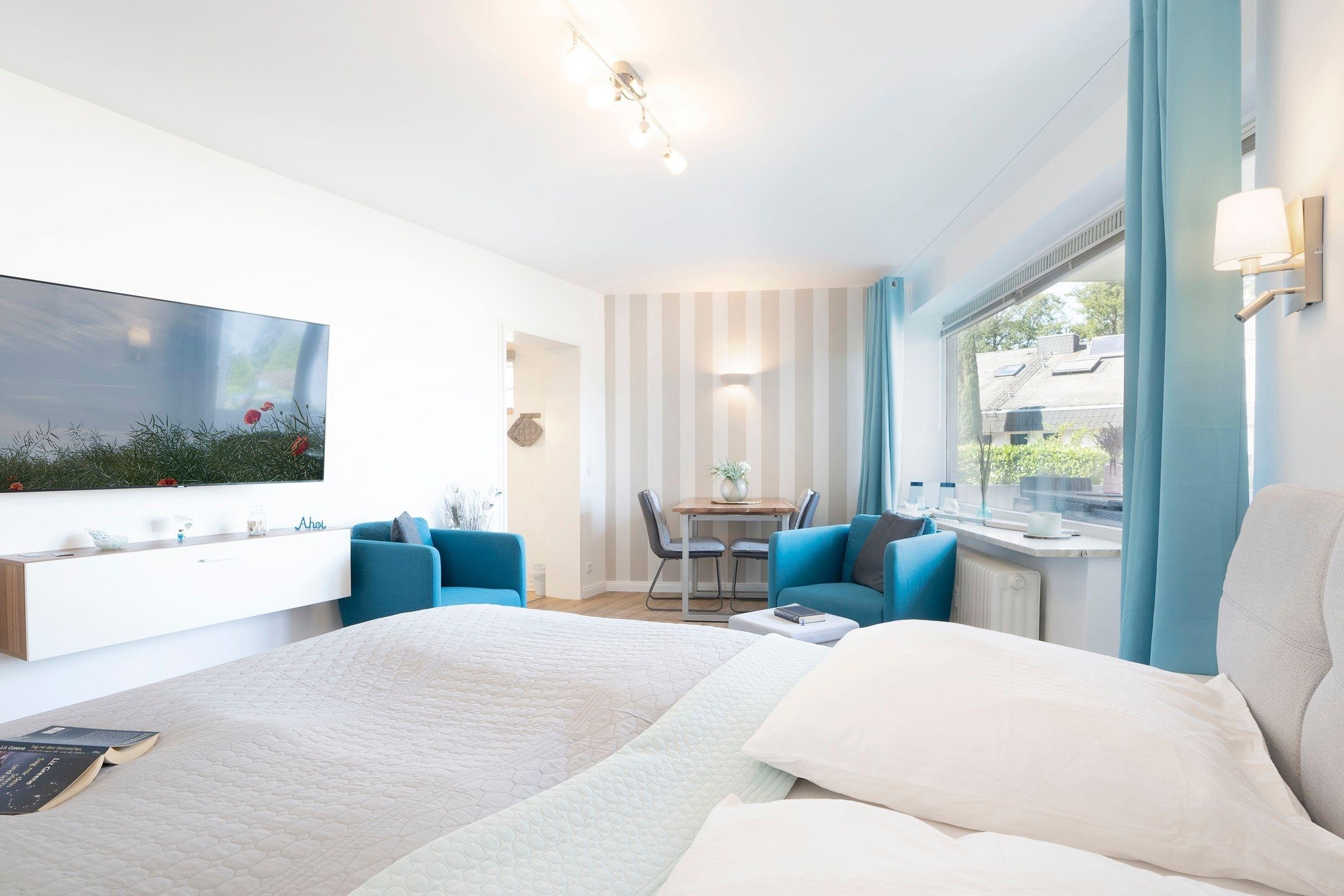Der kombinierte, hell geflieste Wohn- und Schlafbereich empfängt Sie mit einem komfortablen Boxspring-Doppelbett (180x200 cm, 2 Härtegrade: H2 und H3, Topper), einem Esstisch mit 2 Stühlen sowie einem großen Flachbildfernseher (Smart-TV). Für weiteren Komfort sind zwei bequeme Sessel vorhanden. Verdunkelungsgardinen sorgen für einen erholsamen Schlaf in der Nacht. Die Küchenzeile ist u. a. mit einem Kühlschrank, einem Herd mit 4 Kochplatten und einer Kaffeemaschine gut ausgestattet und grenzt an den Wohnbereich. Das innenliegende, hell geflieste Badezimmer überzeugt durch eine moderne Einrichtung und verfügt über ein WC, ein Waschbecken und über eine Eckdusche (80x80 cm). Als Stauraum für Ihre Badutensilien dient der Waschbeckenunterschrank und für Ihre Handtücher ist ein beheizbarer Handtuchhalter vorhanden. Vom Wohnbereich aus gelangen Sie auf den möblierten, überdachten Balkon, der für Erholung und Ruhe sorgt. Der WLAN-Anschluss ist selbstverständlich inklusive.