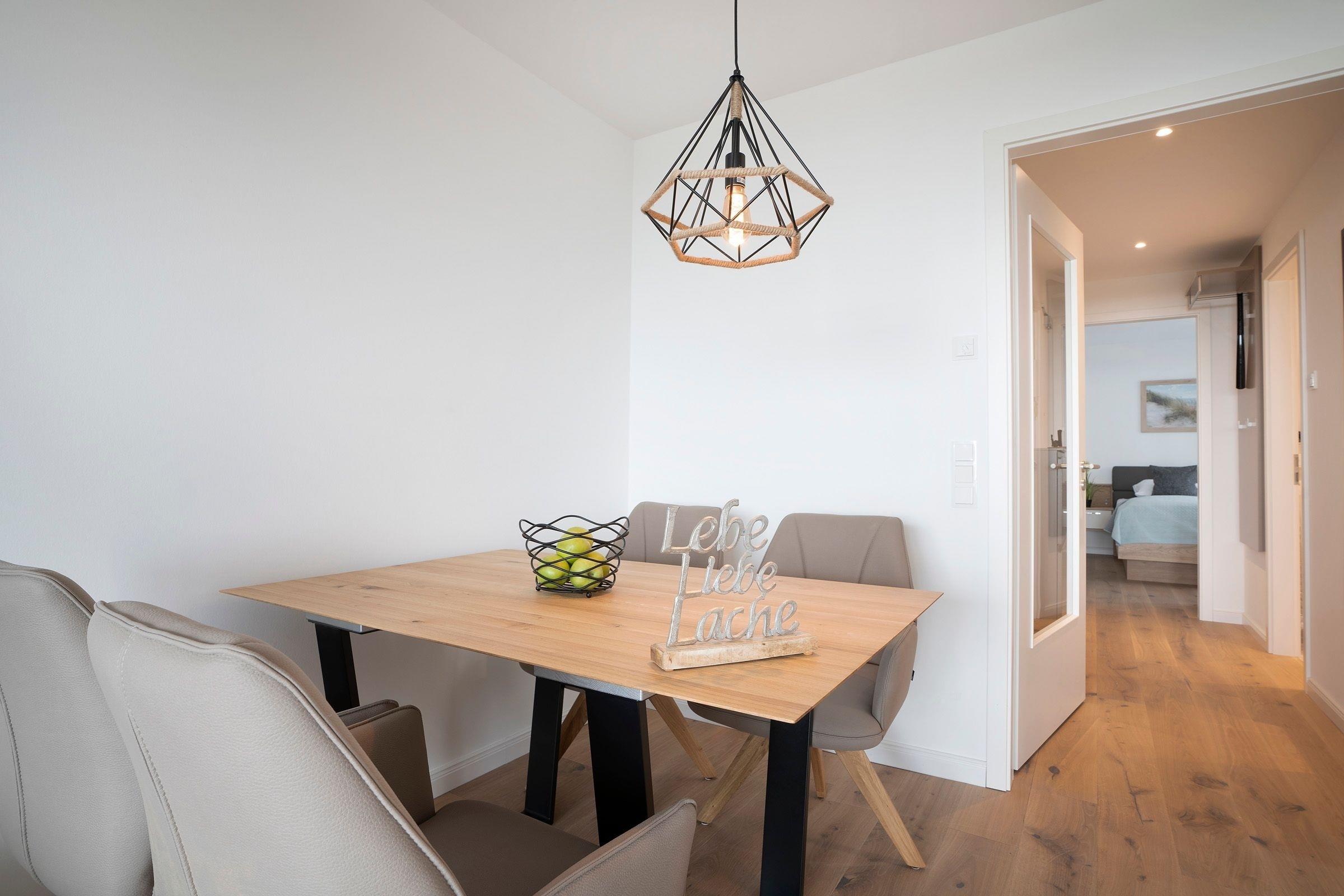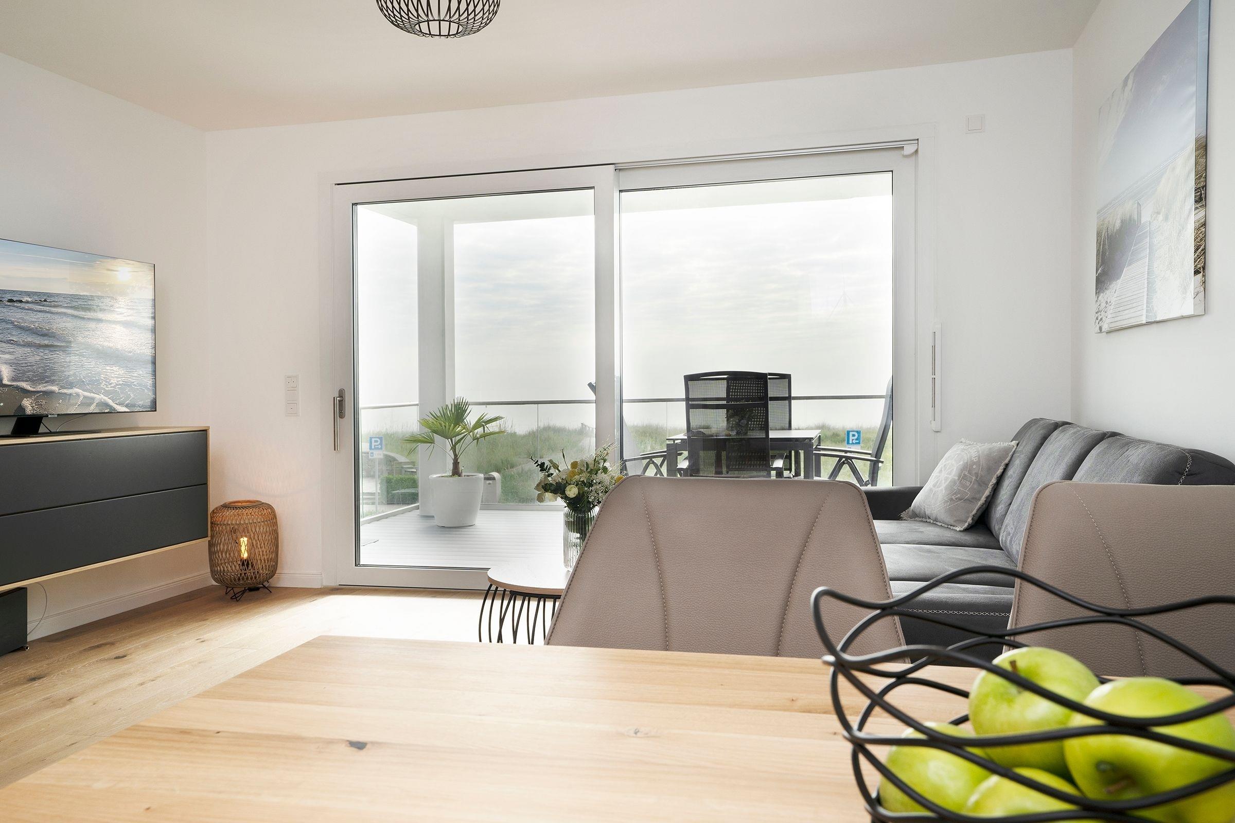 Durch die großen Fensterfronten ist das Wohnzimmer hell und gemütlich. Von hier haben Sie Zugang zum möblierten ca. 15m² großen Balkon mit herrlichem Blick auf die Ostsee. Die offene Küche ist sehr gut ausgestattet, um ein leckeres Essen zuzubereiten. Der Esstisch bietet genug Platz für bis zu 4 Personen. Für erholsame Nächte ziehen Sie sich in das separate Schlafzimmer zurück, es erwartet Sie ein komfortables Doppelbett (2x 90x200 cm) sowie ein Kleiderschrank. Die kleinen Gäste können es sich auf dem Schlafsofa bequem machen (Liegefläche 140x240 cm), beide Schlafzimmer lassen sich angenehm verdunkeln. Das moderne Badezimmer unterstreicht die geschmackvolle Ausstattung dieser tollen Ferienwohnung.
